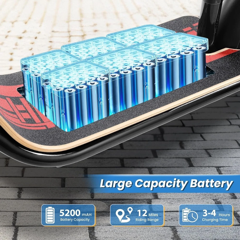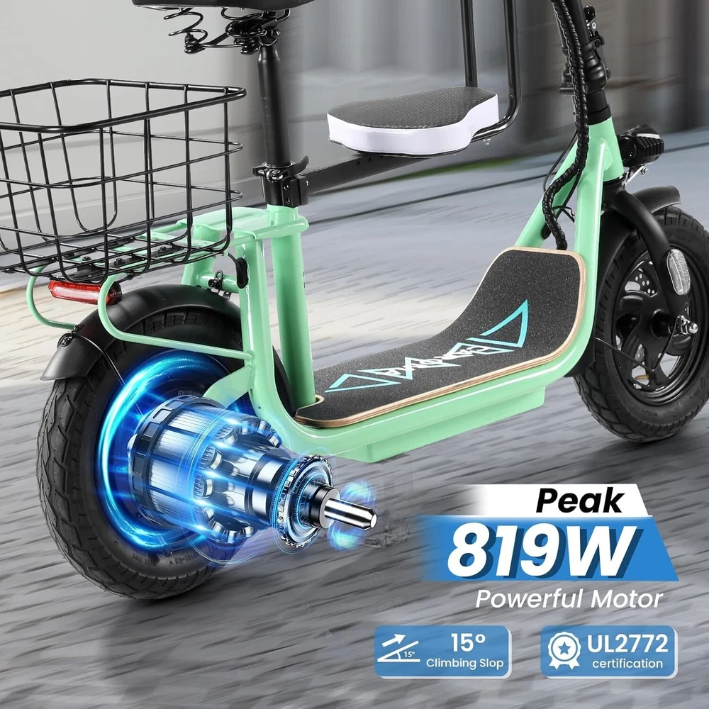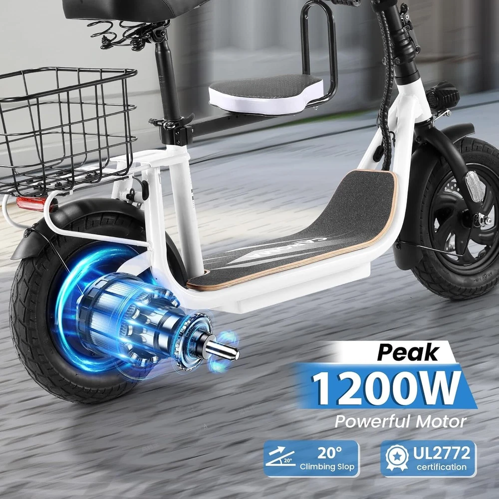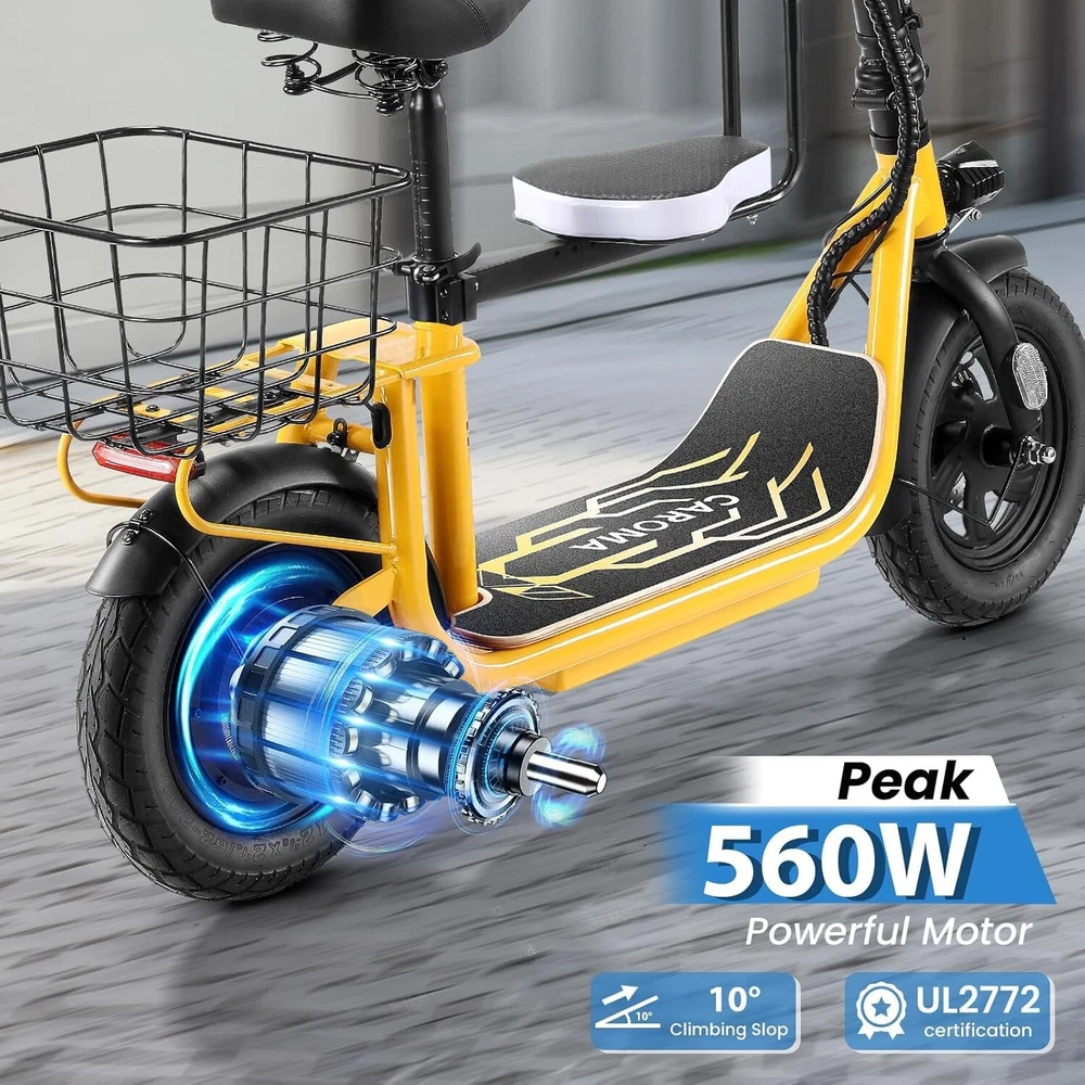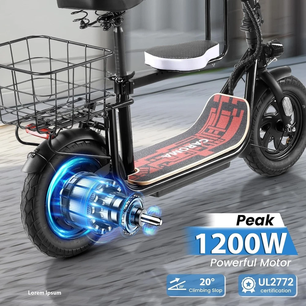 Product Description 🛴【Equipped with 2 Seats 】: Caroma Z6 Electric Scooter equipped with 2 Seats, can carry one child and one adult at the same time. Designed as an electric commuter bike for adults, you can experience ultimate comfort while riding with this e scooter. Perfect choice for parents to take their kids to and from school, for a drive or for shopping. 🛴【Peak 1200W Powerful Motor】: This electric scooter with seat is powered by a robust peak 1200W motor, reaching top speeds of 20 mph and handling 20% hill grades with ease. Perfect for commuting or leisure rides, this adult electric scooter offers unparalleled versatility and high performance. 🛴【10400mAh large-capacity battery】: The adults electric scooter is equipped with high-capacity 500Wh lithium battery, enhanced by regenerative braking, provides a remarkable range of up to 30 miles. Its 12" pneumatic tires provide excellent grip, high elasticity, and wear resistance. The extra-wide deck makes long rides enjoyable and effortless. 🛴【Portable and Durable Travel Partner】: Equipped with foldable handlebar, the e scooter can be easily stored and carried in your trunk, you can ride it anytime you like. The aluminum frame of this electric scooter is strong and durable, which can support a maximum weight of 265 pounds. The large capacity basket is prefect for shopping trips and short errands around the block. 🛴【Easy Assembly】: This electric scooter is UL 2272 certified. Only the seat and the basket attachment needed to be assembled after the 2 wheel electric scooter for adults arrives