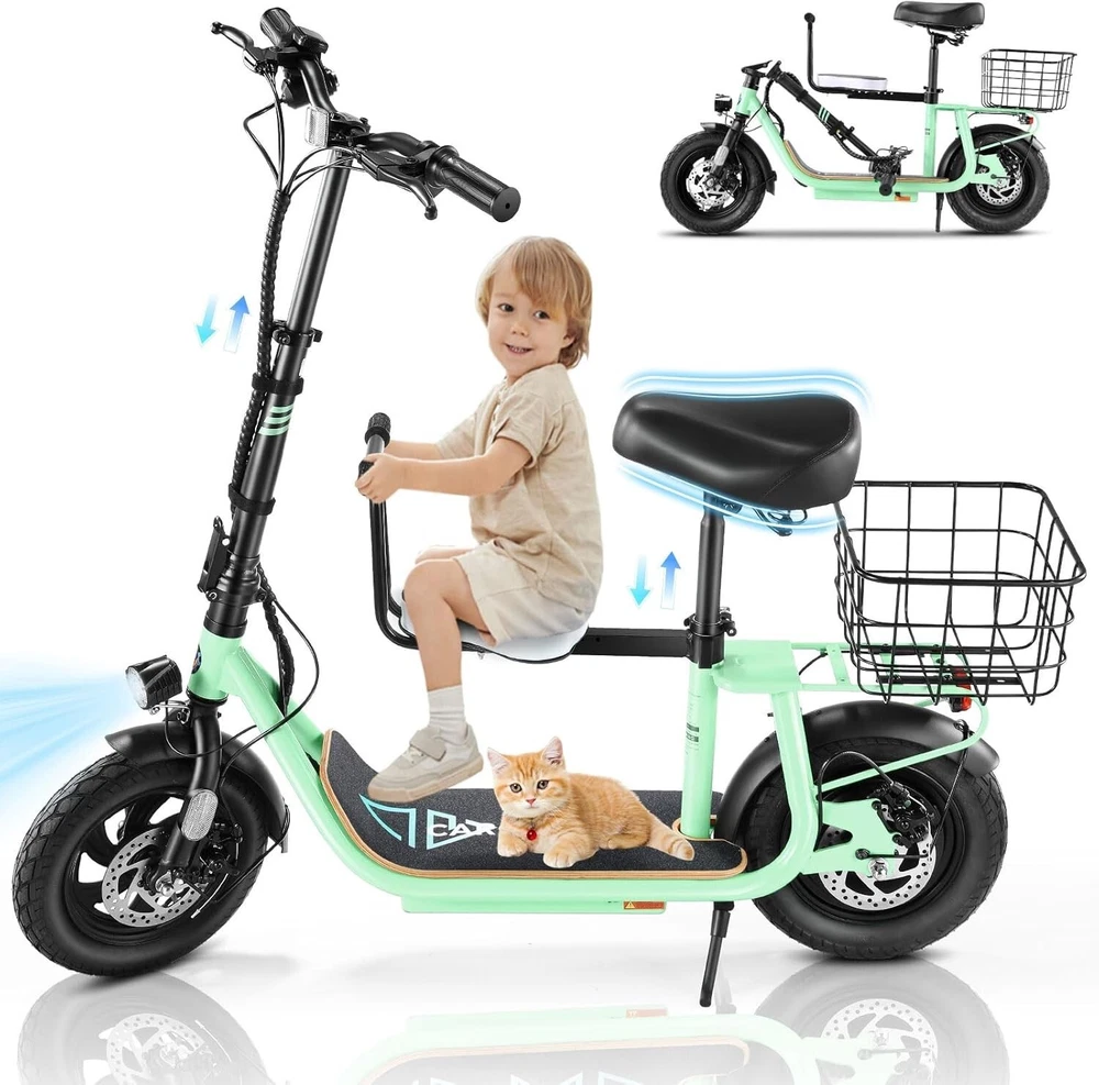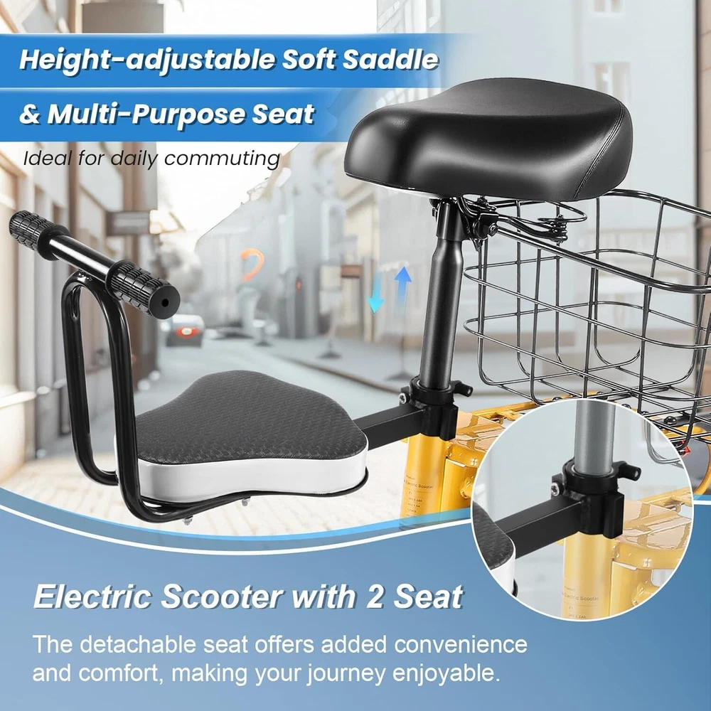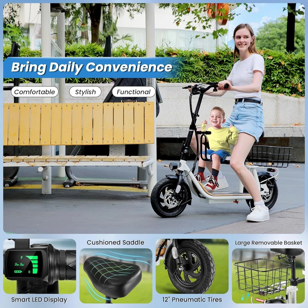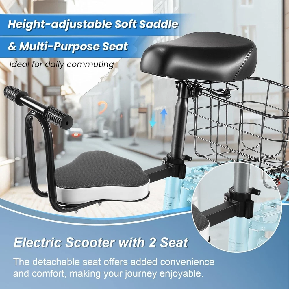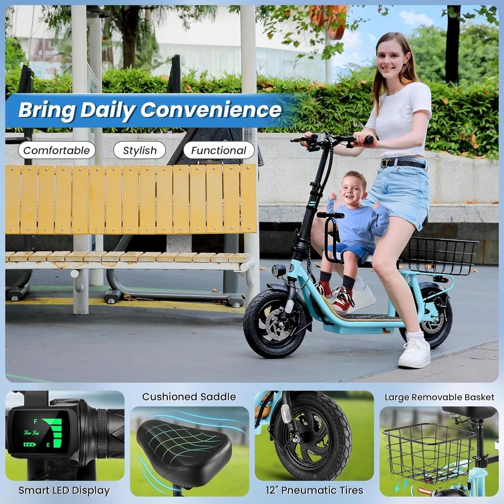 This electric scooter is a game-changer for commuting and family trips! The dual-seat design makes it perfect for rides with a child, while the powerful 1200W motor effortlessly handles hills and hits 20 mph. Super comfortable, folds easily, and the 30-mile range is ideal for errands or school runs. Love how sturdy and smooth it rides—great alternative to driving!