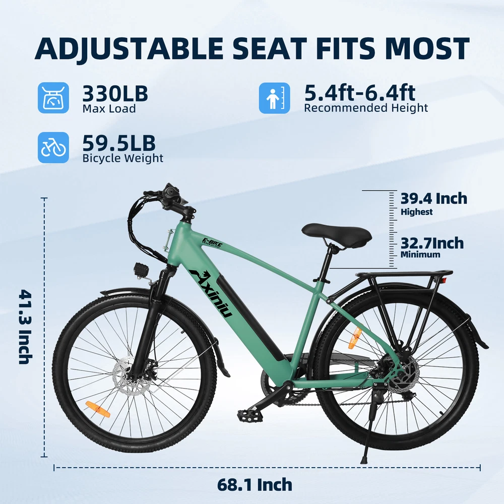 Maximum Range: Up to 40 mi(Assist Mode) Safe standard: passed UL 2850 detection Item Height: 41.73" Custom-Built: No Model Year: 2024 Tire Type: Tires Motor Power: 750W Voltage: 36 V Frame Size: 26 in Brand: Axiniu Wheel Size: 26 in Gear Change Mechanism: Derailleur Gears Department: Unisex Adult Frame Number: No UPC: Does not apply Item Weight: 61.7294334lbs Brake Type: Disc Brake - Mechanical Bike Type: E-City Bike Item Width: 18.90” Handlebar Type: Flat Bar Charging Time: 4-6 hours gtin13: Does not apply Features: Lights, Display, Fenders, Front Light,Removable Battery Suspension Type: Rear Item Length: 72.05" waterproof line: 9-core main waterproof line Motor Type: Rear Hub Motor Number of Speeds: 7 Speed Model: City Electric Bike EAN: Does not apply Manufacturer Warranty: 3 Years Material: Aluminum Max load: 330lbs MPN: EG-HL03-G Charger: 42V 2.0A, UL/CE certified, black, US standard Country/Region of Manufacture: China Custom Bundle: No Maximum Speed: 25mph Color: Black/Grey