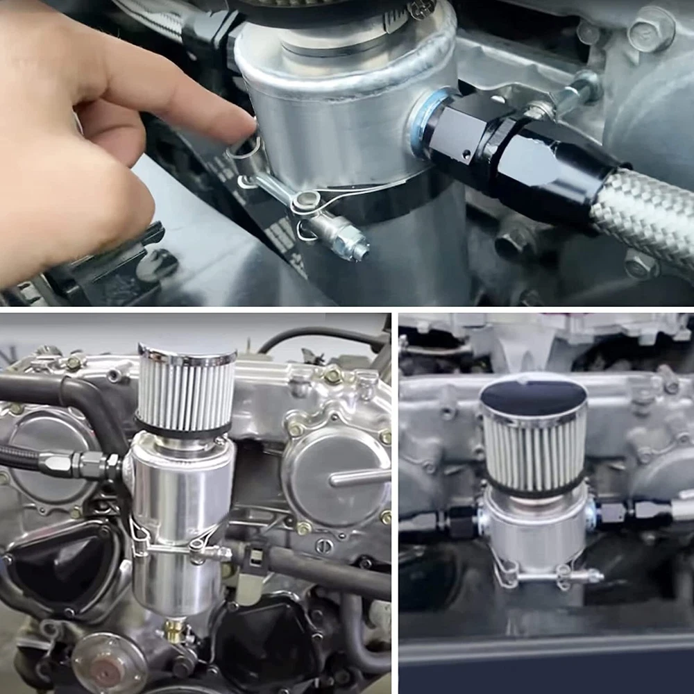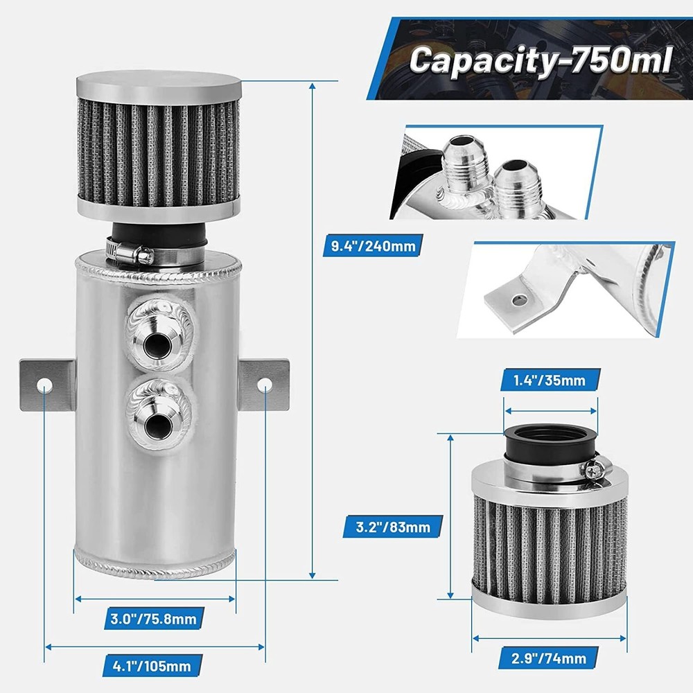 750ml 10AN Oil Catch Can Reservoir Tank & Breather Filter Baffled Kit Aluminum Item Description 【Universal】 The 2 port oil catch tank fits most of vehicles. High capacity of 750ml enough to meet your daily needs.Pls feel free to contact us if you have any question about this product. 【Easy to clean】 Drain valve with O-ring design has good sealing and will not loosen, it can be opened for cleaning and reused many times. Separates oil particles from PCV/CCV air to prevent intake valve gunk accumulation, keep engine clean. 【Selected material】 The 750ml oil catch can made of high-quality aluminum and full TIG welded for enhanced strength and durability, long service lifes. 【Easy to install】 Bracket besides on the bottle body, simple design make it more convenient and easier to install. Please make sure enough room for install. 【Prevent pressure】 You could use the breather filter as vented system, prevent pressure from building up the system. Specifications Condition:100% Brand New Warranty: 90 Day Free Return:30 Day 0.75L Oil Catch Can Total Height: 8.4" Tube Diameter: 3" Bracket Wide: 0.8" The 2 front ports are -10 AN threaded for various types of connections/configurations The port at the top of the can is a tube which has internal baffling built into it This will prevent oil from escaping and remaining inside the catch can Fully Tig Welded Bracket is formed with an extrusion for superior strength and durability Catch Can has a Brushed Finish A 3/8" drain valve is included Chrome Filter included Professional Installation is Highly Recommended (No Instruction Included) Package Included 1x Oil Catch Tank 1x Air Filter 2x Adapters 1x Bracket As pictures show FAQ: I purchased by mistake, how do I cancel the order? Please contact us ASAP. If the item has not been shipped out we can cancel the order for you. If the item was shipped out you can refuse the package and wait for the item to return to us. I received your item but it does not fit or is defective Please contact us so we can assist you on the matter. Buy with confidence Our quality is based on meeting the requirements of the manufacturer and improvement them in design problems manufacture. NOTE: (1)It would be highly appreciated if you might contact us first once you have any problems concerning the items. And you can expect all the issues would be resolved ASAP! (2)Please let us know before you send us the neutral/negative feedback that wont help to finish the issues. And I will definitely try my best to provide the best solutions which would meet our satisfactory! (3)According to the distance of the receipt address items would be sent from CA or NJ (4) This product does not include an installation manual