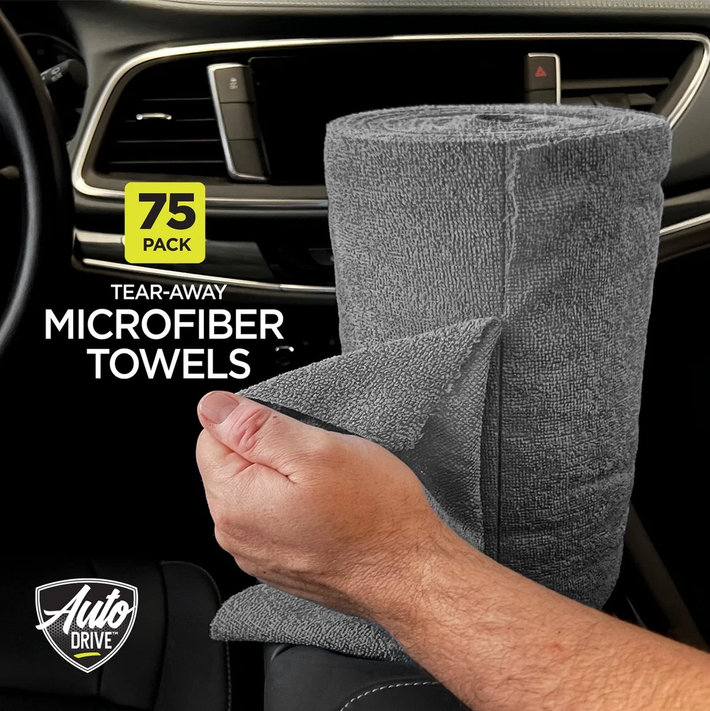 Auto Drive Tear Away towels, 75 count per pack make cleaning jobs simple and easy. The perfect sized towels to clean both the interior and exterior of your car, boat, home, garage, office and more. Easy to tear microfiber cloths absorb spills fast, wipe down surfaces, remove dust and debris and are always within reach on a convenient roll. Stop spending your money on costly paper towels that you can only use once and then throw away. These towels are machine washable and reusable up to 50 times! Made of super absorbent microfiber, these cloths absorb 5 times more than paper towels! Use these multipurpose towels to clean without the need of harsh cleaning solutions as well as use wet or dry. Tear Away towels are the perfect solution for grab-and-go cleaning on interior and exterior surfaces that include glass, mirrors, seats, dashboard, engines, tires, wheels, rims, and more. (75) Auto Drive Tear Away Multi-Purpose Microfiber Towels on a Roll Absorbent microfiber 12" x 12" perforated cloths with clean tear away edges Lint-free and streak-free cleaning results on interior and exterior surfaces around your car and home Machine washable and reusable
