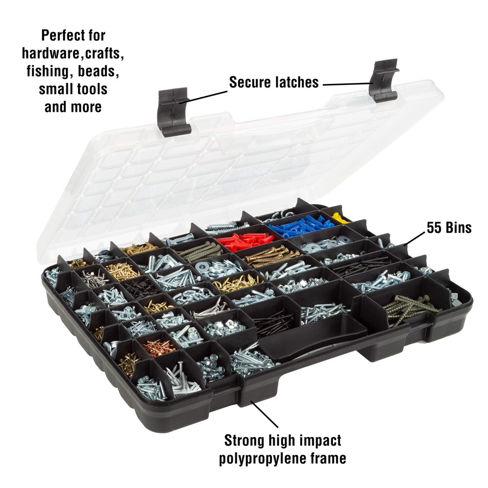 MULTIPLE USE OPTIONS - The durable construction and transparent design of this organizer allow you to extend your garage storage options, declutter a storage cabinet, carry fishing lures, or simply get random stuff collected in one convenient holder. PORTABLE DESIGN - A carrying handle built in to the top of the case makes it easy to take on the road. SECURE LATCHES - Locking the latches when the case isn't in use ensures the contents stay safely inside. TRANSPARENT AND DURABLE - The transparent plastic lid allows you to check the container's contents at a glance, while the polypropylene frame is resilient enough to easily withstand impacts from normal use. PRODUCT DETAILS - Material: Polypropylene, Plastic. Dimensions: (L) 16" x (W) 12.25" x (H) 2.5". Color: Black, Clear.