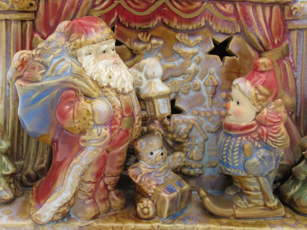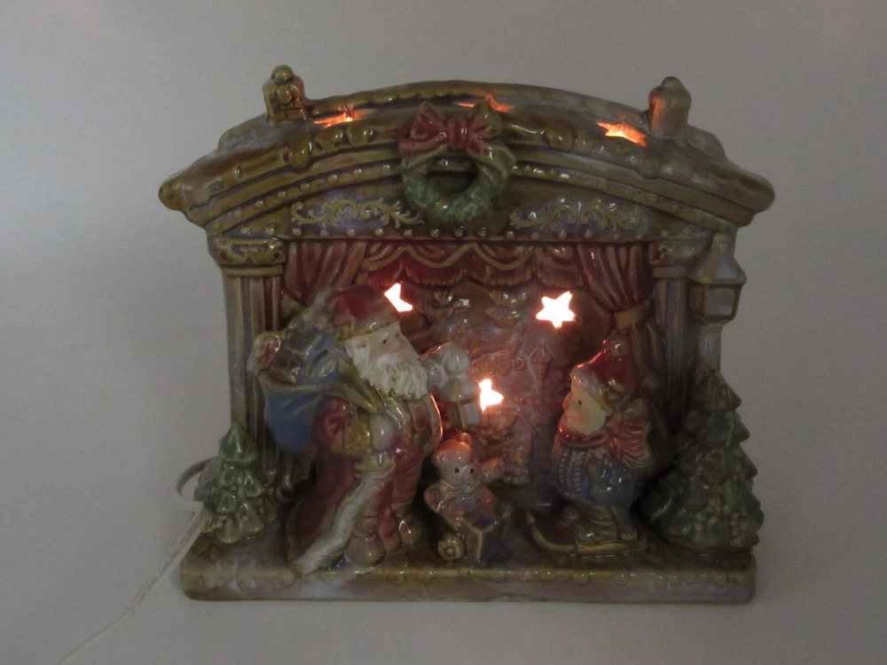 Seasonal Elements 7.5" Santa & Snowman at Fireplace Night Light Figurine Product Description: Bring holiday cheer to your home with this charming Seasonal Elements Christmas scene featuring Santa and a snowman standing by a cozy fireplace. Made of porcelain, this festive piece can be illuminated with a separate C9 bulb and light cord ( not included ) for a warm holiday glow. Approximate Dimensions: Height: 7.5 inches Width: 8.5 inches Depth: 5 inches Condition: Pre-owned. Please see photos for detailed condition. Feel free to ask any questions! Explore more festive finds in our store, K&T Gems!