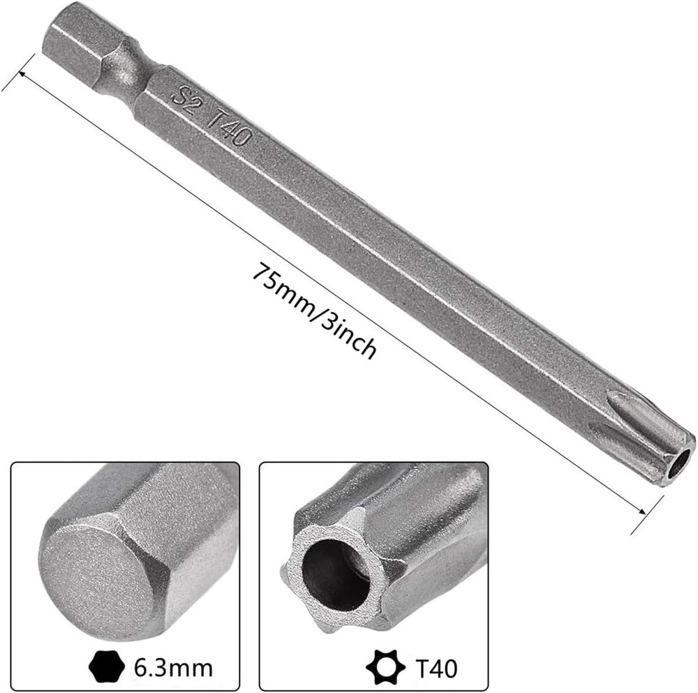 XMHF 10Pcs 75mm/3inch Long 1/4 Inch Hex Shank T40 Torx Head T40, Gray Description: Product Name: Torx Screwdriver Bits; Materials: S2 alloy steel; Type of head: Torx; Type of shank:6.4mm / 1/4 inch hex; Total Length: 75mm/3 inch ; Torx Tip: T40; Product Size: S2H1/4 x 75L x T40; Package Content : 10 x Torx Screwdriver Bits Features: These security bits are made of S2 steel with a smooth, wear-resistant surface and overall reflection hardening. 10Pcs T40 Magnetic Screwdriver Bits in a Pack; Shank Type: Hex shank; Hex Shank Diameter: 6.4mm/ 1/4inch. Easy to use,magnetic torx security head easy to suck the screw and firmly fixed on pneumatic screwdrivers, electric screwdriver or rechargeable drill. Excellent manufacture,thanks to the wonderful workmanship, the bit not only obtain a smooth surface but also achieve high precision. Wide using application, can be used with electric screwdriver, manual screwdriver, electric drill, group general tools, ect. SHIPPING: We are always working hard to ensure your package arrives as soon as possible. Please understand that some factors like weather, high postal traffic, and the performance of shipping companies are outside of our control. We offer free shipping to the lower 48 states and ship within 3 business days of payment, usually sooner. We do not accept P.O. Boxes. Please provide a physical address. For shipping outside of the continental USA, we only use eBay's Global Shipping Program. The item is shipped to KY and then sent to the rest of the world. International customers are responsible for all duties and taxes. Continue to check out in order to calculate costs for shipping the item to your country. Messages regarding eBay's Global Shipping Program MUST be directed at eBay EXCLUSIVELY. PAYMENT: We accept payment by PayPal only (Can accept all kind of credit cards). Please pay as soon as possible after winning an auction, as that will allow us to post your item to you sooner. Payment must be received within 3 business days of auction closing. Before buying, please make sure your PayPal and eBay address is correct. If not, please correct it before payment. We have confidence in our products, but if you are not fully satisfied please contact us within 30 days of purchase and you will get full refund of your money. Return the product in the same condition you received it. Please note - return shipping will be paid by the buyer.