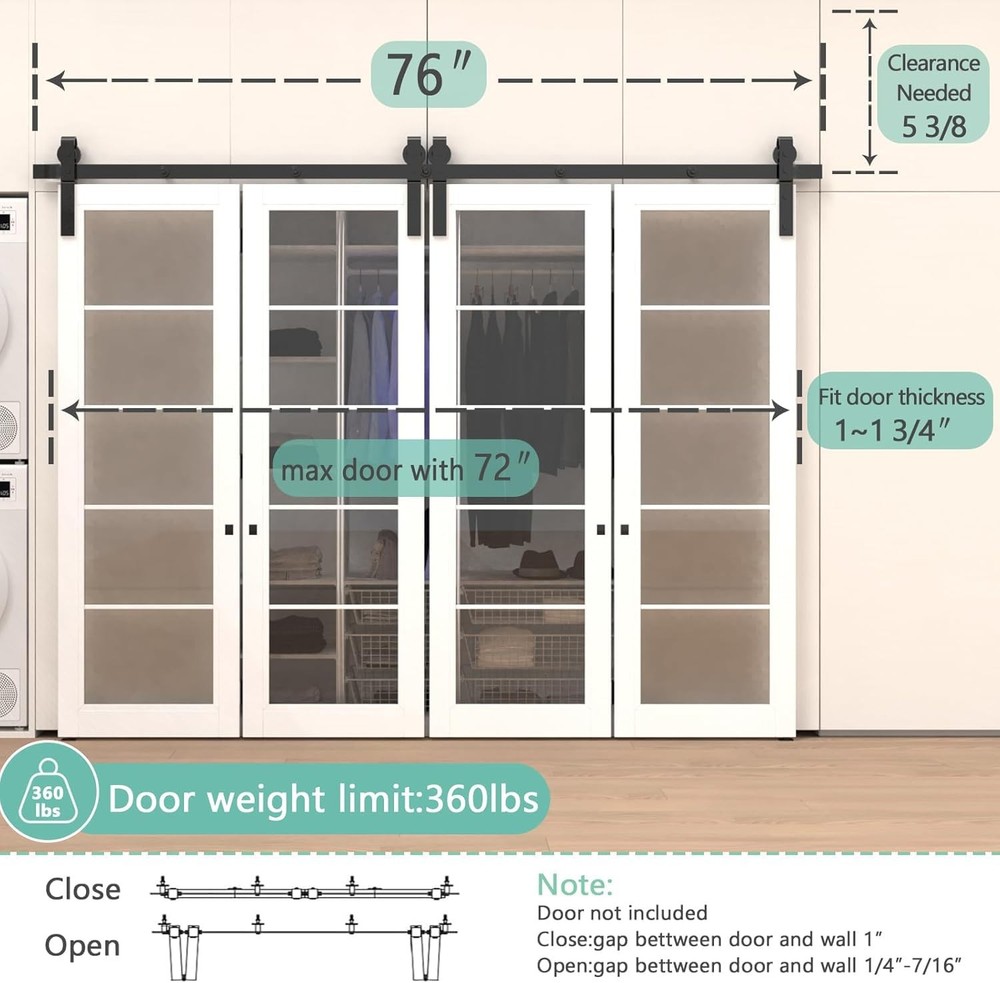Bi-Folding Sliding Barn Door Hardware Kit 【Superior Quality】Made of black heavy-duty steel, it has the benefits of sturdy, durable, wear-resistant and corrosion-resiatant. The roller is a combination of high-quality bearings and nylon wheels, matched with 6mm thick track to improve the bearing capacity of the product. And it has undergone 120,000 tests to ensure quiet and smooth sliding. 【Unique Design】Different from the traditional hardware kit on the market, the folding door kit can greatly save you space. And the scope of application is wide, can be used in a variety of living occasions, such as living room, dining room, study, etc. 【Package List】Packing: 2x 3.2FT track, 4x roller, 4x roller rotating bracket, 2x roller fixator, 5x spacer, 6x hinge, 2x floor guide, 1x Sealing Strip. Fit Door Thickness: 1-3/8"~1-3/4"(35mm~45mm). [Friendly reminder: DOOR NOT INCLUDED] 【Easy to Install】The total width of the door panel plus 4" is the length of the track. We provide detailed Bi-Fold sliding barn door kit instructions with pictures and text, which can be intuitively installed by yourselves, saving the time and cost of finding an installation team for you. 【Easy Install & 24 Hours Stand By】We have a professional customer service team 24 hours online to help you. If there is any problem about our products, please let us know and we will try our best to solve your problem.