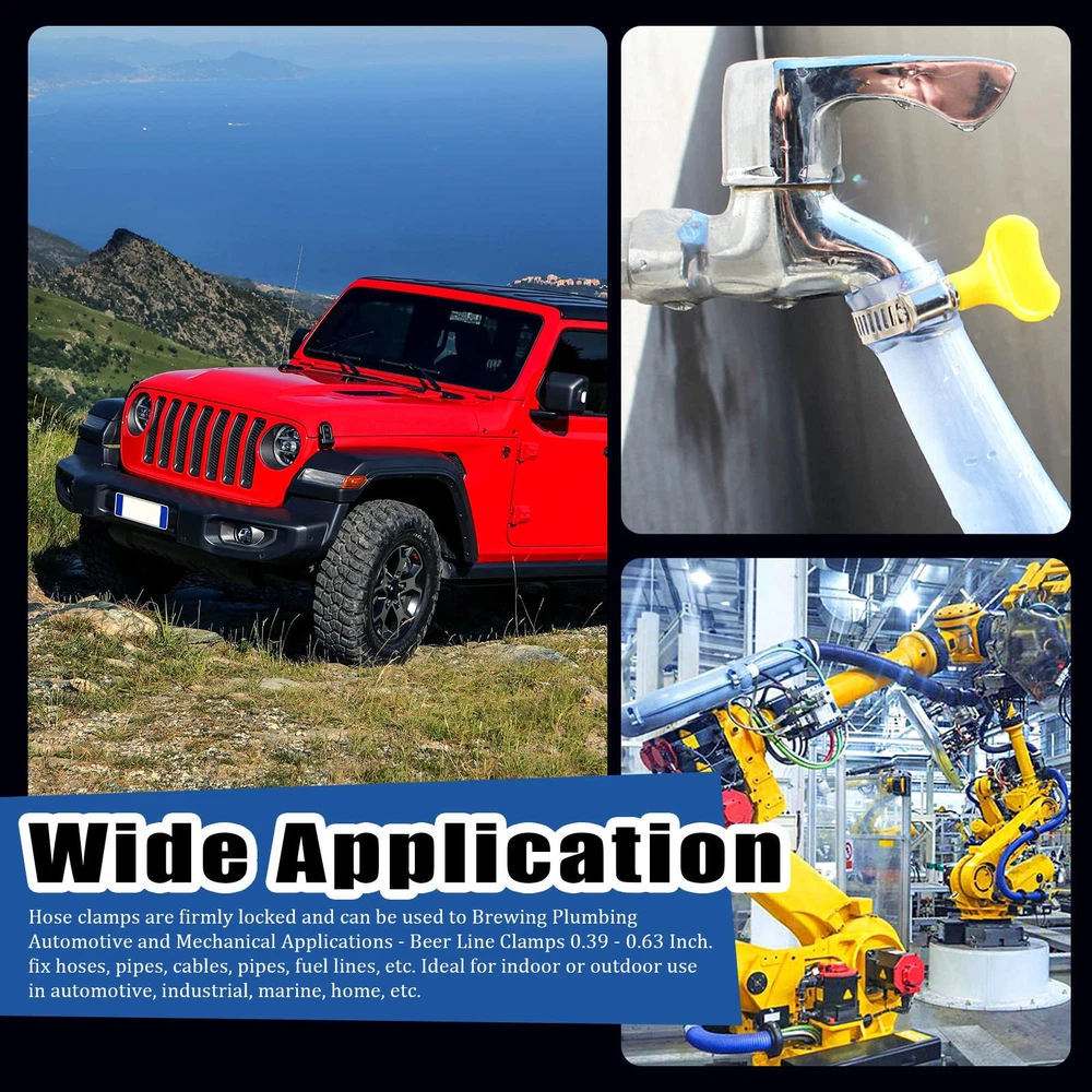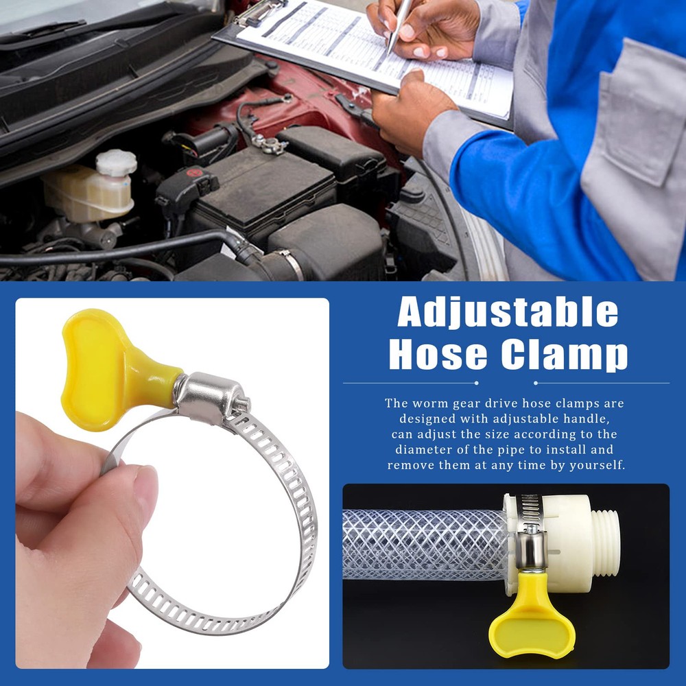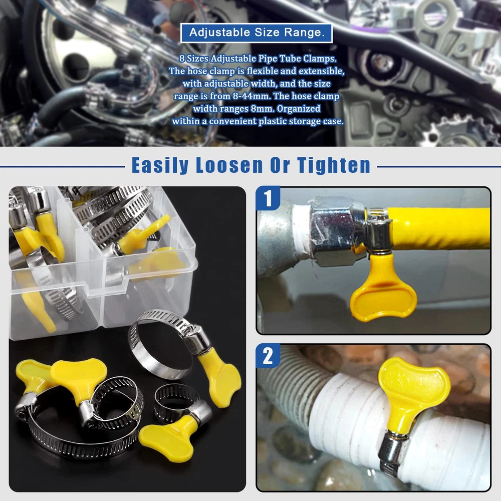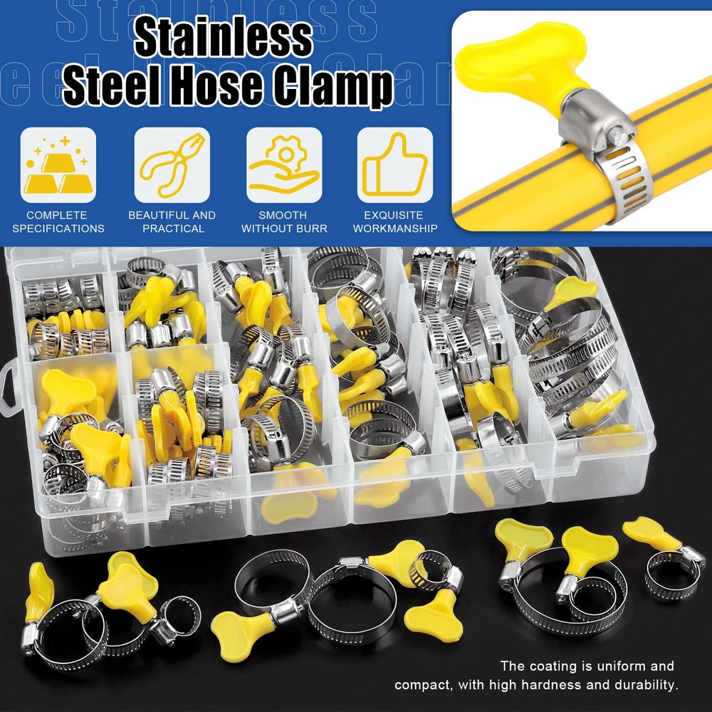 76Pcs Adjustable 8-44MM Range Hose Clamps Assortment Kit Key-Type Stainless Steel Worm Gear Hose Clamp with Plastic Handle for Water Pipe, Plumbing, Automotive and Mechanical Application 【Specifications】 ♥ Product Type: Key-type hose clamps assortment kit ♥ Material: 304 Stainless Steel ♥ Size: 8-12MM, 10-16MM, 13-19MM, 16-25MM, 19-29MM, 22-32MM, 25-38MM, 32-44MM ♥ Quantity: 76pcs 【Product Feature】 √ 8 sizes adjustable hose clamps can meet your various needs in different occasions. √ Made of 304 stainless steel, resistant to salt, rust, corrosion, water, and oil, which can be applied in the complex environment. √ Adjustable handle make it easy to use without any screw drivers or socket wrench. √ Applied for securing hose, cable, pipe, tube, fuel lines, beer line and so on. 【Package Detail】 10pcs x 8-12mm hose clamps 10pcs x 10-16mm hose clamps 10pcs x 13-19mm hose clamps 10pcs x 16-25mm hose clamps 9pcs x 19-29mm hose clamps 9pcs x 22-32mm hose clamps 9pcs x 25-38mm hose clamps 9pcs x 32-44mm hose clamps 76pcs in total 【Note】 ※Manual measurement, please allow 0.01-0.03mm errors on size. ※The color might exist slightly difference due to different displays. ♛【Package Includes】: This package contains 76pcs key-type worm gear clamps packed in a convenient box, which are 10pcs 8-12mm, 10pcs 10-16mm, 10pcs 13-19mm, 10pcs 16-25mm, 9pcs 19-29mm, 9pcs 22-32mm, 9pcs 25-38mm, 9pcs 32-44mm. Sufficient number to meet your different needs and enough to use for a long time. ♛【High Quality Material】: All the hose clamps are Made of high quality 304 stainless steel, which features great performance of corrosion resistance and acid resistance. Resistant to salt, rust, corrosion, water, and oil. No more worrying about rusting and cracking when installing on pipes. ♛【Easy to Use】: All the hose clamps with screws allow you adjust the size according to the diameter of the pipe, key-type desingn with adjustable handle make it easy to use, you can easily release or tighten without a screwdriver to adjust the band diameter range by using the handle without screw drivers or socket wrench. ♛【Save Time and Money】:These stainless steel hose clamps can be attached on hoses pipe joints to fittings to prevent liquid leakage, saving your time and money on costly repairs the pipe. ♛【Wide Application】: Key-type Worm gear hose clamps are used to lock the hose tightly with a view to prevent flow leakage. Widely applied to fix hoses, pipes, cables, pipes, fuel lines, etc. Ideal for use in automotive, industrial, mechanical, agriculture, boat/marine, shield, recreational vehicles, household and more.