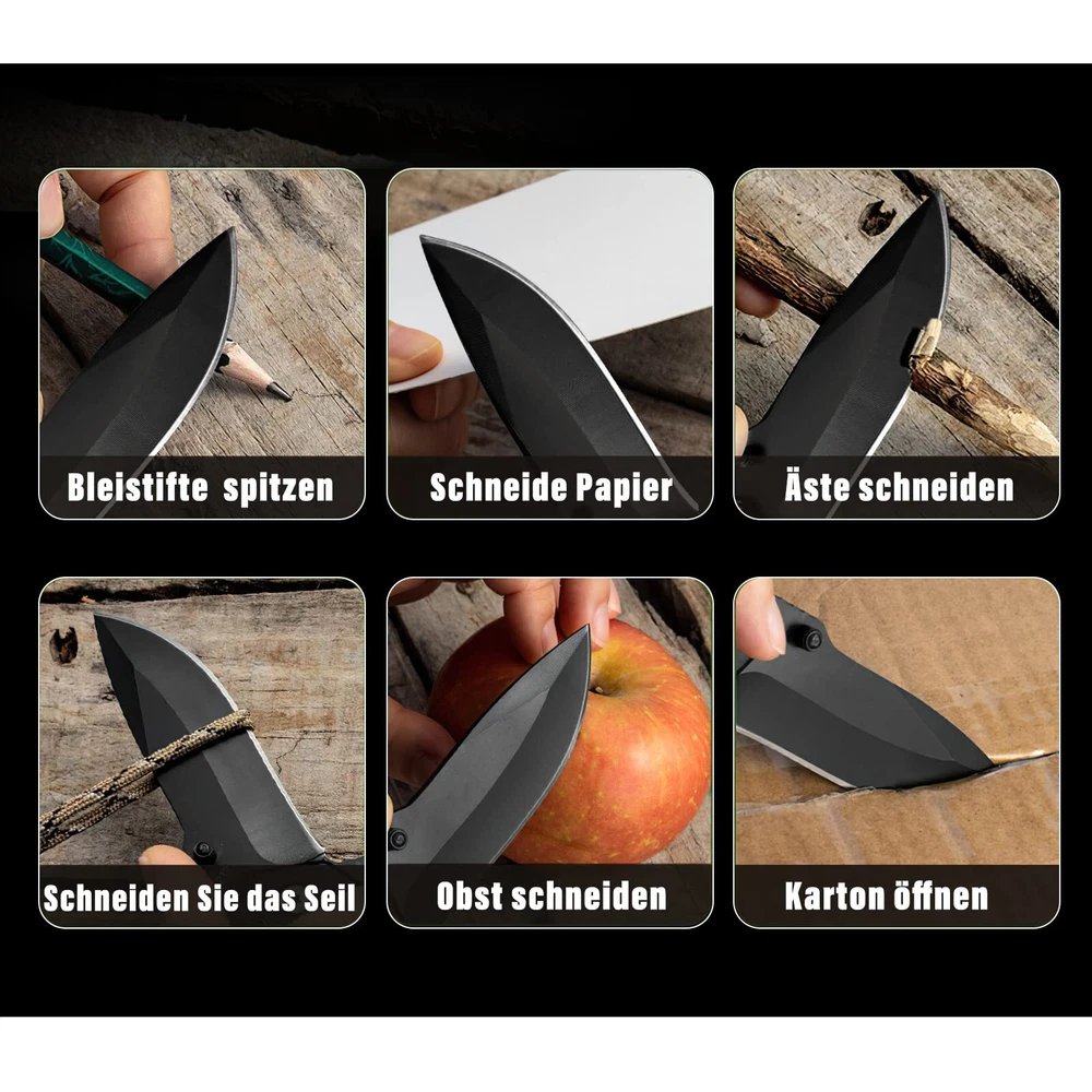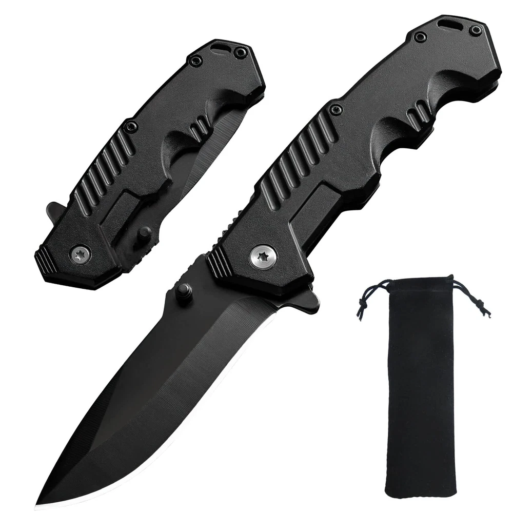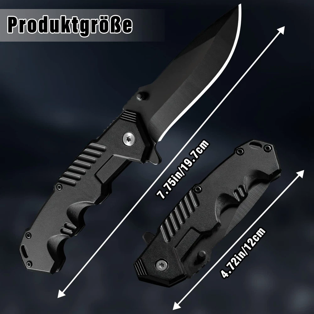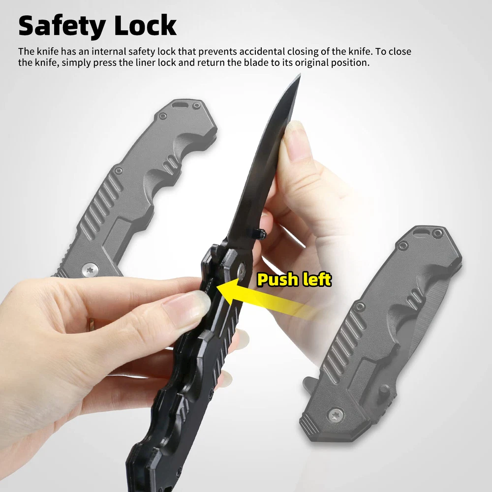 COMPACT- The folding knife unfolded length is 210mm, the folded length is 120mm, the length of the blade is 90mm, and the weight is 140g, Easy to fold to attach belt for one is portable. HIGH QUALITY MATERIAL- The folding knife is made of stainless steel 3CR13 and is the hardness 52HRC; The surface is blackening treated to bring beautiful appearance. It is the two-handed version, both left and right-handers can use the knife comfortably. SAFE & EFFICIENT- The blade in the pocket knife has a safety lock inside to prevent accidental closing of the knife, To close the knife, just press the liner lock and return the blade to the position. 4 IN 1 MULTIFUNCTIONAL OUTDOOR SURVIVAL- With sharp knife, bottle opener, cutter for rope and glass breaker, Not only for camping, hiking but also for hunting, survival, emergency. Perfect for cutting carpet, paper, plastic leather and cardboard etc. Type: Folding knife Overall length: 20CM Blade length: 8CM Handle length: 12CM Knife thickness: 0.3CM Blade width: 2.8CM Blade material: 3Cr13 Handle material: aluminium Hardness: 58HRC Net weight: 150g Surface finish: blackened 1 X Folding Knife