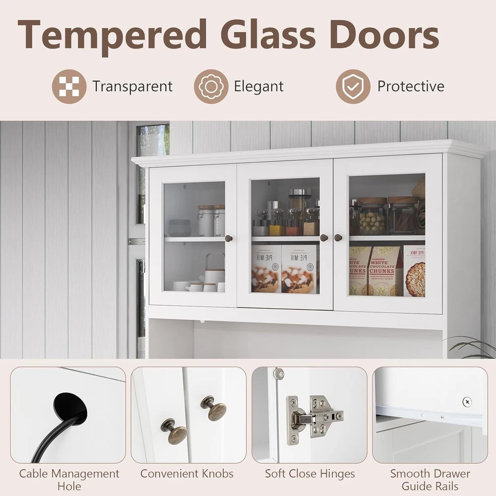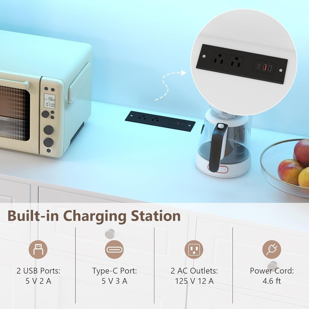 Product Description About this item Customizable Storage: Flexibly customize the storage space with our kitchen hutch cabinet, featuring 3 drawers and 4 doored cupboards. Each of the 4 shelves within can be adjusted among 3 positions at an increment of 2.5”, providing tailored storage space for items of varying sizes. Enhanced Workspace: With a wide countertop, our kitchen utility cabinet doubles as an additional workspace. The built-in charging station offers 2 AC outlets, a USB port and a type-C port, so that you can keep your essential kitchen appliances charged up and ready for use. Adjustable LED Lights: The dynamic LED lighting system integrated within our pantry storage cabinet features 21 dynamic modes and 20 static colors. Additionally, it comes with 8 levels of brightness and speed adjustments, ensuring the ambiance is perfectly suited for any occasion. Sturdy Design for Safety: Our freestanding hutch cabinet, fortified with anti-toppling devices and an additional support leg, is more stable and safe for your family and belongings than the traditional cabinets. The cabinet's see-through tempered glass doors blend style with strength, providing enhanced durability. Effortless Maintenance: Maintain your doored pantry cabinet with ease—its easy-to-clean surface requires little effort. The spacious 5" clearance facilitates the smooth passage of vacuum robot underneath, eliminating the necessity to bend or kneel during cleaning. Description: Our kitchen buffet cabinet offers 3 spacious drawers for easy access to your kitchenware, complemented by 4 doored cupboards with adjustable shelves for your versatile storage needs. The dual tempered glass doors on the upper cupboards exude a modern elegance, offering both a clear view of your organized contents and an added layer of strength and safety. The large countertop of this tall cupboard serves as an additional workspace, and is equipped with a built-in charging station, which enables you to plug in your household appliances at all times. Safety is prioritized with anti-toppling devices and a support leg for stability, and cleaning is made easy with generous ground clearance for vacuum robots. Upgrade your kitchen with our stylish and practical utility pantry cabinet! Features: Ample storage space with 3 drawers and 4 doored cabinets All 4 shelves are 3-position adjustable for item of different heights Wide countertop expands your kitchen workspace Included charging station to keep your kitchen appliances ready 8-level adjustable brightness and speed for dynamic ambience Increased stability with anti-toppling devices and central support leg See-through and unbreakable tempered glass doors are as stylish as they are sturdy Abundant ground clearance for vacuum robots to enter at ease Round metal knobs and slide rails facilitate easy opening and closing Easy-to-clean cabinet surface minimize maintenance efforts Comes in 3 boxes and you may receive them on different days Specifications: Color: White Materials: MDF, Engineered Wood Product Dimensions: 47" x 18" x 77" (L x W x H) Size of Countertop: 46" x 17.5" (L x W) Height of Countertop Part: 19" Ground Clearance: 5" Length of Power Cord: 4.6 ft Net Weight: 152 lbs Max Weight Capacity: 365 lbs 2 USB Ports: 5V 2A Each Type-C Port: 5V 3A 2 AC Outlets: 125V 12A Each Package Includes: 1 x Pantry Cabinet 1 x User Guide