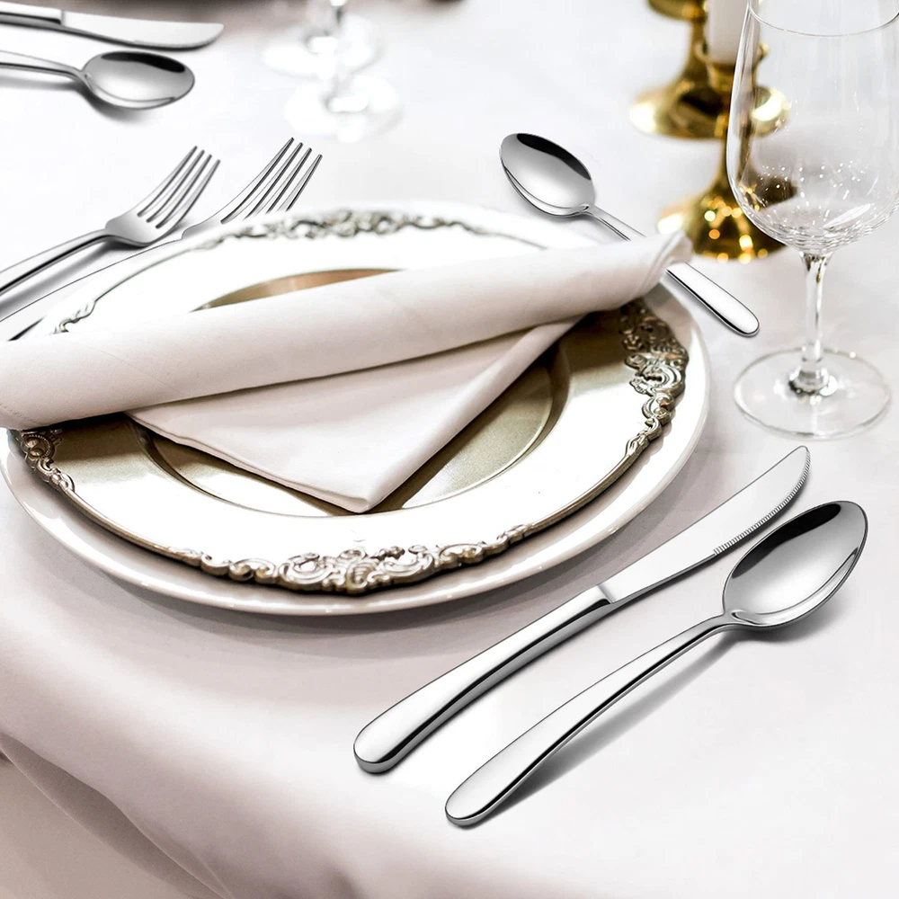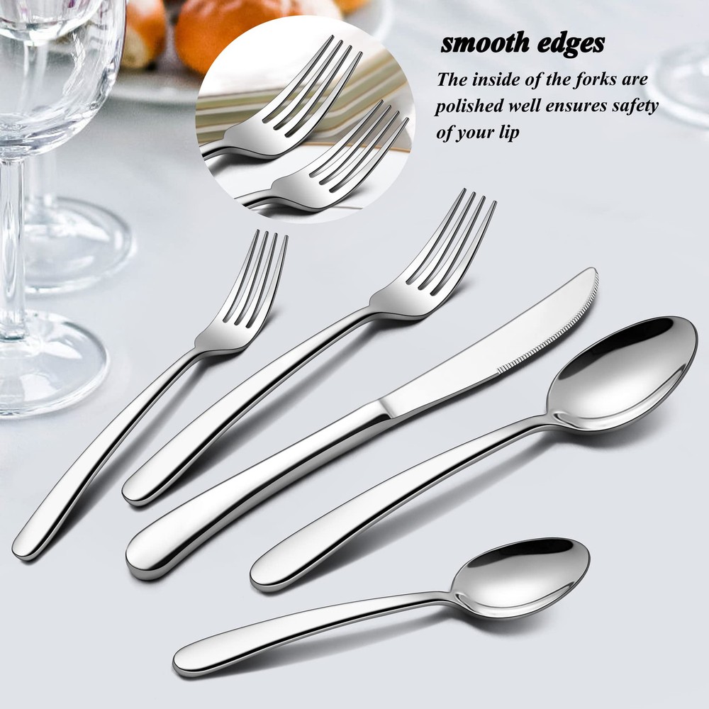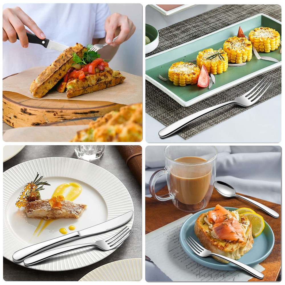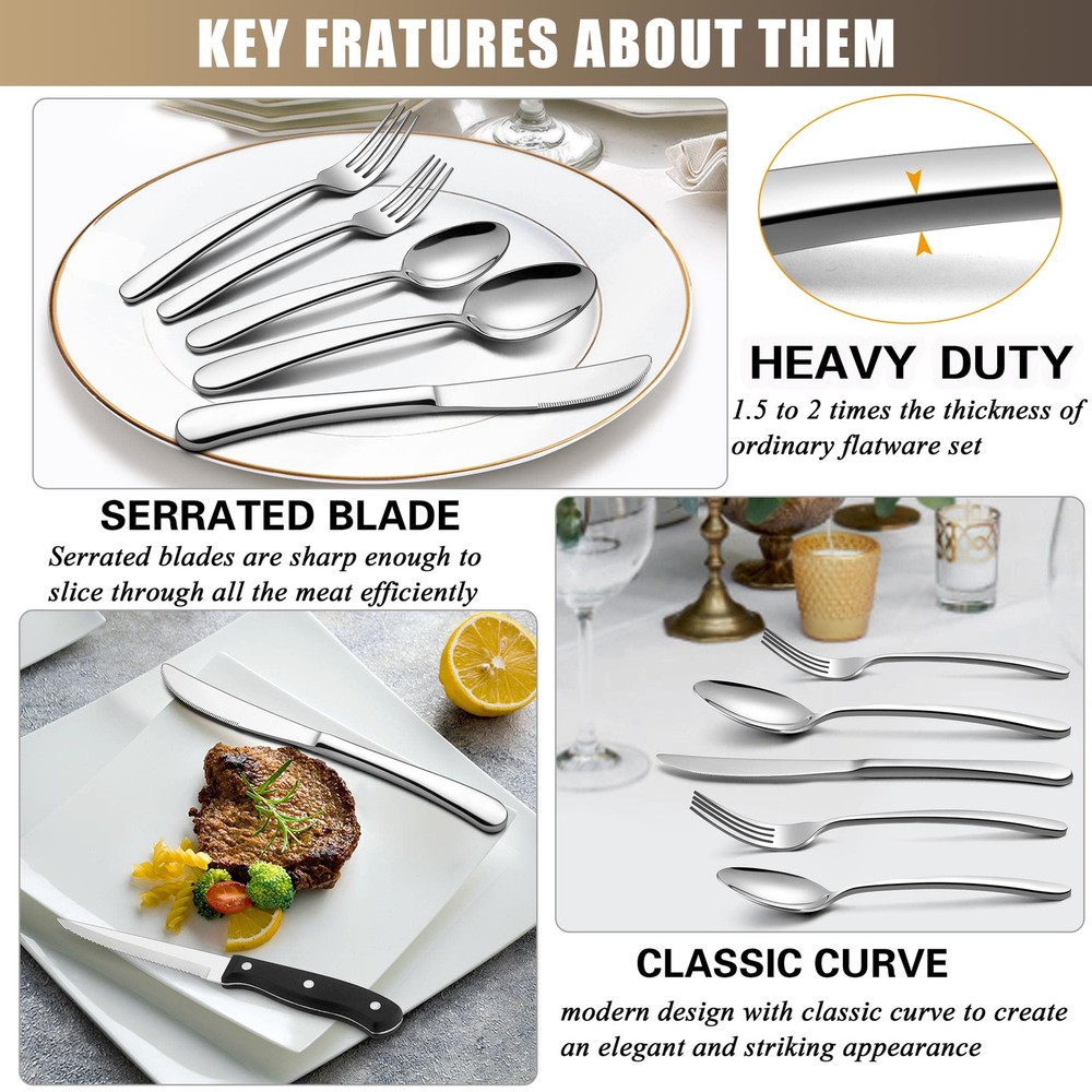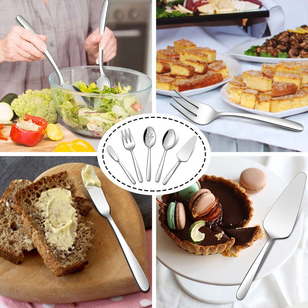 Sturdy structure, this heavy duty cutlery set with hostess set are constructed by thick gauge stainless steel, solid construction with heavy weight, high hardness to make sure stands up well to years of use, rust resistant and without any harmful substances ensures and safety Plus serving utensils and steak knives, steak knife with ergonomic full-tang handle for precision control and maintain a good balance, high-carbon stainless steel blades with micro-serrated edges allow you to slice through all the meat efficiently, serving utensils set with sturdy stainless steel construction, ideal for serving salads, fruit, soups, dessert, cake, vegetables, appetizer Heavy duty, this 65 pieces heavy flatware with serving set have a substantial weight to them, heavy weight but not clunky, suitable size and nice heft allow you to hold comfortably, solid construction and absolutely not bend and flimsy, well balanced and feel sturdy in your hand Smooth finish, 65pcs fancy silverware set with serving utensils features with highly mirror polished surface for keeping its gloss persistent and shiny, smooth edges without burrs ensures safety of daily use, easy to clean and washes up nicely in the dishwasher, modern design with classic curve to create an elegant and striking appearance, gorgeous look fits any style cutlery Flatware set for 12, this 77 pieces stainless steel silverware set includes 12 of each: dinner knives, dinner forks, dinner spoons, salad dessert forks, teaspoons and steak knives, plus 5 pieces serving utensils of serving spoon, slotted serving spoon, serving fork, pie server, butter spreader, perfect for home daily use, wedding, restaurant, hotel, party, entertaining