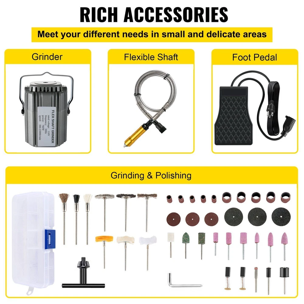 780W Flex Shaft Grinder Powerful Motor & Three-Jaw Chuck & Flexible Steel Shaft Our flex shaft grinder comes with a complete accessory kit to perform numerous grinding, sanding, polishing, deburring, and cleaning tasks. With a strong copper motor, high-precision chuck, and variable speed foot pedal, the tool is suitable for different processing places and materials, such as metal, wood, stone, jewelry, etc. High performance and versatility have all come together to bring you a high-quality shaft grinder. Get ready to grind away projects and get things done right with VEVOR. Full Copper Motor High Precision Flex Shaft Stepless Speed Foot Pedal Multi-Purpose Accessories VEVOR is a leading brand that specializes in equipment and tools. Along with thousands of motivated employees, VEVOR is dedicated to providing our customers with tough equipment & tools at incredibly low prices. Today, VEVOR has occupied markets of more than 200 countries with 10 million plus global members. Why Choose VEVOR? Premium Tough Quality Incredibly Low Prices Fast & Secure Delivery 30-Day Free Returns 24/7 Attentive Service VEVOR is a leading brand that specializes in equipment and tools. Along with thousands of motivated employees, VEVOR is dedicated to providing our customers with tough equipment & tools at incredibly low prices. Today, VEVOR has occupied markets of more than 200 countries with 10 million plus global members. Why Choose VEVOR? Premium Tough Quality Incredibly Low Prices Fast & Secure Delivery 30-Day Free Returns 24/7 Attentive Service 780W Powerful Motor The powerful motor turns bits at high speeds with the high concentricity of the electric hanging grinder carver. Also, the cooling vents can stop the machine from overheating. The external carbon brush port makes it easy to replace worn-out brushes. Three-Jaw Chuck The three-jaw chuck of the rotary carving tool enhances its versatility with its compatibility with accessories with a shank size up to 0.3-6.5 mm. In addition, it accommodates a wide variety of fittings to accomplish various processing works. No matter what the project requires, you will be prepared. Premium Stainless Steel Shaft The flexible shaft is constructed of upgraded stainless steel, which features high strength, heat resistance, and tenacity. Besides, the hanging design of the jewelry grinder makes it easy to maneuver in your backyard, garage, or workshop. ABS Stepless Foot Pedal The foot pedal adopts high-quality ABS plastic with durable solid-state electronics. In addition, you can adjust the constant speed and rotation speed through the screw on the pedal, which will change the speed smoothly and automatically, allowing you to work faster and more conveniently. Complete Accessories The flex shaft grinder kit provides all kinds of rotary tool accessories to fulfill grinding, sanding, polishing, and cleaning requirements. They will significantly improve your work efficiency and meet your different needs. Extensive Application This rotary carving tool is ideal for both professionals and jewelry hobbyists. It's excellent for carving, buffing, drilling, polishing, sanding, cutting, cleaning, finishing, adding textures, and reaching small spaces and delicate areas. Specifications Model: 780W Flex Shaft Grinder Power: 780W Speed: 500-25000 RPM Voltage: 110-220V Chuck Type: Three-Jaw Chuck Chuck Range: 0.012-0.26 in / 0.3-6.5 mm Shaft Length: 39.4 in / 100 cm Foot Pedal Size: 4.5 x 7.1 in / 115 x 180 mm Grinder Size: 3.15 x 5.7 in / 80 x 145 mm Net Weight: 6.6 lbs / 3 kg Package Content 1 x Flex Shaft Grinder 1 x Flexible Shaft 1 x Foot Pedal 5 x Small Sanding Discs 5 x Large Sanding Discs 1 x Small Rubber Ring Rod 1 x Large Rubber Ring Rod 1 x Pin 6 x Grinding heads 1 x Cotton Wheel 2 x Rubber Wheels 6 x Sandpaper 1 x Carbon Brush 3 x Cloth Wheels 3 x T-Type Brushes 3 x Brushes 1 x Chuck Key VEVOR is a leading brand that specializes in equipment and tools. Along with thousands of motivated employees, VEVOR is dedicated to providing our customers with tough equipment & tools at incredibly low prices. Today, VEVOR has occupied markets of more than 200 countries with 10 million plus global members. Why Choose VEVOR? Premium Tough Quality Incredibly Low Prices Fast & Secure Delivery 30-Day Free Returns 24/7 Attentive Service VEVOR is a leading brand that specializes in equipment and tools. Along with thousands of motivated employees, VEVOR is dedicated to providing our customers with tough equipment & tools at incredibly low prices. Today, VEVOR has occupied markets of more than 200 countries with 10 million plus global members. Why Choose VEVOR? Premium Tough Quality Incredibly Low Prices Fast & Secure Delivery 30-Day Free Returns 24/7 Attentive Service 780W Flex Shaft Grinder Powerful Motor & Three-Jaw Chuck & Flexible Steel Shaft