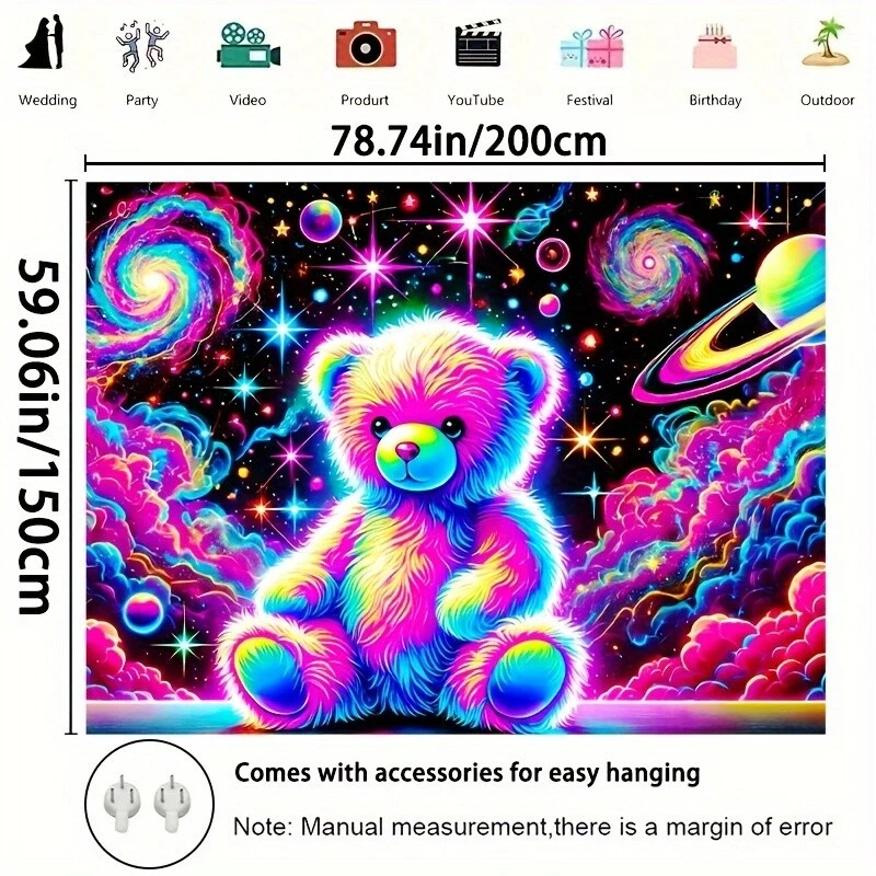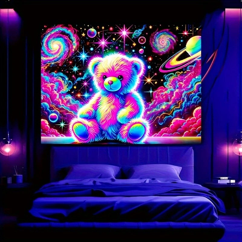78.74"x59.06" Large Bear & Space-Themed UV Black Light Reactive Polyester Fluore