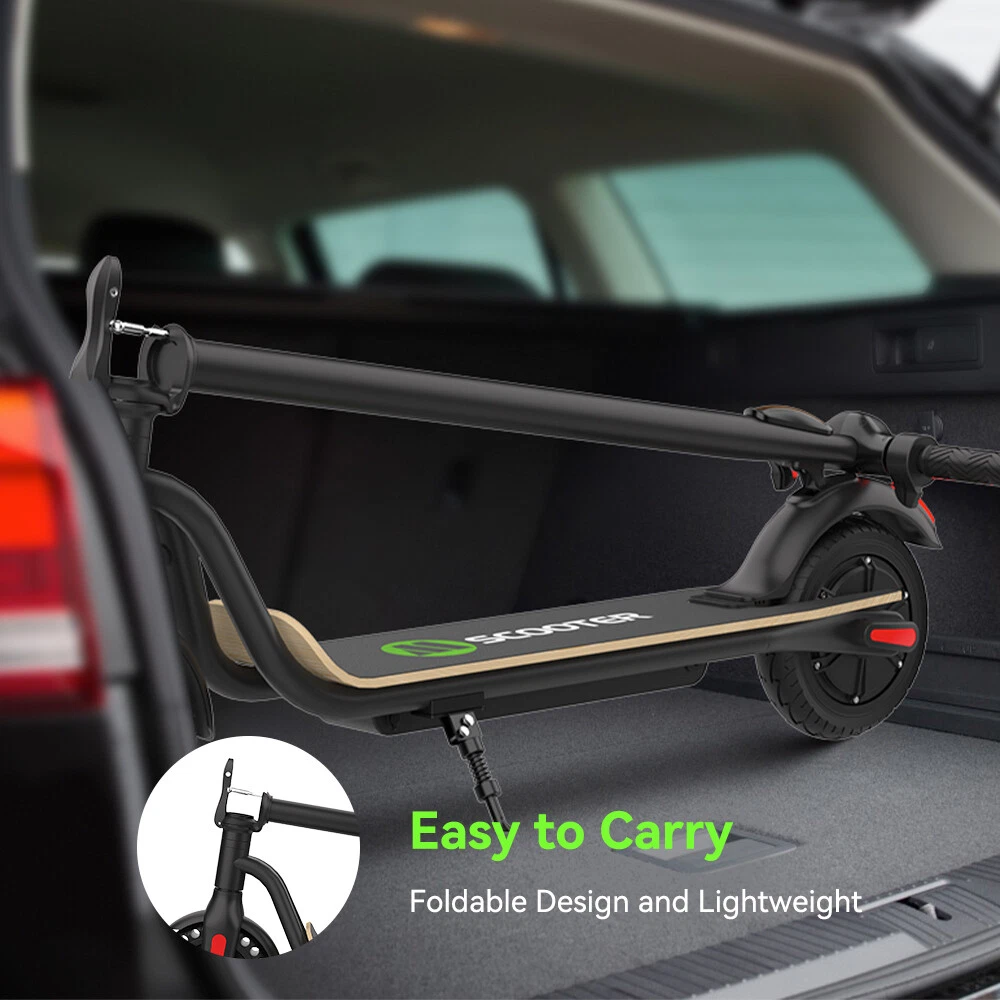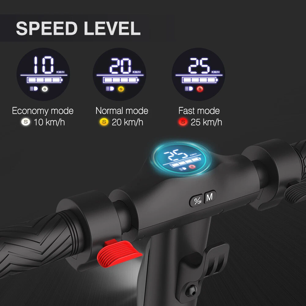 Features: LONG RANGE BATTERY LIFE Powerful 250W motor and 7.8 Ah/36V lithium battery pack that supports a speed of up to 15 Mph with a range up to 13 Miles. Updated large-capacity battery life, designed for commuters and longer distances. 8.0" HONEYCOMB & SOLID TIRES - Shock-absorbing rubber tires offer a smooth ride even over bumpy surfaces. PORTABLE FOLDING DESIGN Electric scooter can be folded easily in 3 seconds with quick folding latch for easy carrying and storage. BATTERY INDICATOR AND LIGHTS Battery indicator keeps to track battery life. Ultra bright LED headlight and taillight. Fast recharging about 5 hours. GEAR SHIFT SETTING 1st gear for a 7 Mph comfortable ride or 3rd gear to get the 15 Mph fast experience. Extremely fun to ride and end boring commutes. Specification: Brand: Megawheels Model: S10 Dimension: Unfolding 105 x 43 x 118 cm; Folding: 105 x 43 x 48 cm Net Weight: 11.9kg Color: Black Frame Material: Aluminium Tires: 8.0" Honeycomb Front Tire & Solid Rear Tire Max Load: 100kg Max speed: 25KM/h Speed level: Gear 1--Max 10km/h ; Gear 2--Max 20km/h; Gear 3--Max 25km/h Mileage: 17-22km Grade Ability: 20 degree slope Working Temperature: -15°C-50°C Storage Temperature: -20°C-25°C Mode Type of Motor: Brushless hub motor Battery Type: High quality lithium battery Battery Capacitiy: 7.8 Ah Battery Voltage: 36V Charger Input Voltage: 100V-240V Charger Frequent: 50Hz/60Hz Charging time: 5 hours Package Contents: 1 * Folding Electric Scooter 1 * Battery Charger 1 * User's Manual Riding Skills: -Put your foot in the front of the scooter and the other foot on the floor before riding. -Make sure that the riding route is smooth. -Slide forward with the food standing on the floor before starting (like riding the scooter without power). -Immediately press the acceleration button and lean forward to avoid falling over backward due to inertia, so that the electric scooter will enter the working status. -Avoid pressing the handle with your body in the acceleration and deceleration process. Put one foot ahead and the other behind (like on the sliding plate/surfboard, put one foot ahead and the other behind by 70-90 for better comfort). -Turning – The turning principle of the electric scooter is the same with that of surfboard/sliding plate/skis. The handle shall be balanced with the body. Observe and make sure that turning is safe before turning. NOTE:The appearance of the product you receive may vary slightly from the image shown due to differing production batches! Tips: Before riding the scooter, please put one foot on the scooter deck and the other foot on floor and push the scooter forward by kicking the floor for some distance, in this way, the scooter will get some impulse to run forward. Note: This products have been certified under UL2272 safety standards.