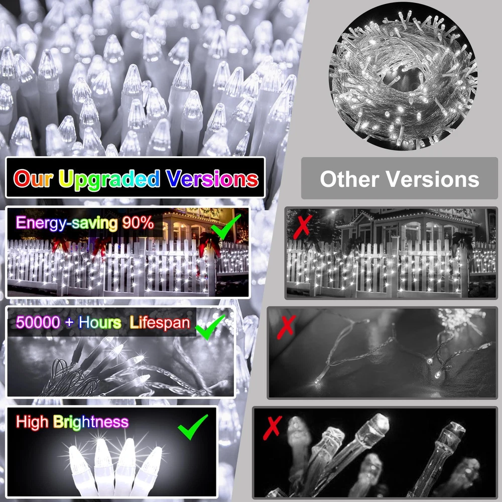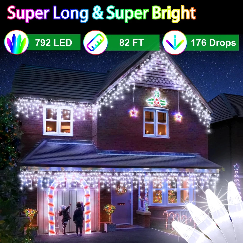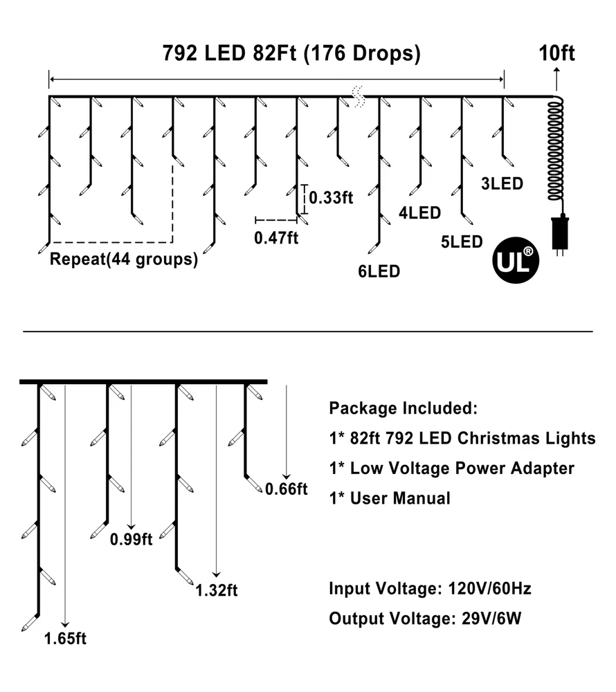 Elevate Your Christmas Decor: 792 LED 82ft ultra-long hanging fairy Christmas lights with 176 Drops are ideal for adding to your holiday decorations, creating a festive ambiance with their beautiful and twinkling lights. They can be hung on eaves, walls, windows, trees, or any other desired spots, enabling you to create stunning displays both indoors and outdoors. Each set of Christmas lights offers extensive coverage, allowing you to decorate large areas. Elevate Your Christmas Decor: 792 LED 82ft ultra-long hanging fairy Christmas lights with 176 Drops are ideal for adding to your holiday decorations, creating a festive ambiance with their beautiful and twinkling lights. They can be hung on eaves, walls, windows, trees, or any other desired spots, enabling you to create stunning displays both indoors and outdoors. Each set of Christmas lights offers extensive coverage, allowing you to decorate large areas Multiple Lighting Options: 8 distinct lighting modes, including Combination, In waves, Sequential, Slo-glo, Chasing/flash, Slow fade, Twinkle/flash, and Steady on. You can effortlessly control the modes using the button on the plug. Additionally, the lights come with a timer function that automatically turns them on for 6 hours and off for 18 hours. The built-in memory chip saves your last mode setting. Installation is a breeze and hassle-free, with user-friendly designs that require minimal effort and time Safer and Energy-Efficient: Our LED Christmas lights provide a safe lighting solution for your holiday decor, especially with their soft and gentle glow. And with a 29v low voltage design and advanced safety features, they offer peace of mind for families with children and pets. Engineered with energy-saving LED bulbs, our LED lights consume less electricity, helping you save on your energy bills while still enjoying brilliant illumination Weather-Resistant: Crafted to withstand diverse weather conditions, our Christmas lights are resistant to rain, snow, and other outdoor elements, ensuring their durability. The LED features faceted cone lenses for enhanced visibility, making them more beautiful, sturdy, and bright. Besides Christmas, these LED lights can also be utilized for other occasions, such as weddings, parties, or any other festive celebrations, adding a touch of magic and sparkle to any event You'll receive 1 x Christmas Light, 1 x Power Plug, 1 x User manual. And 24-hour friendly customer service. If you have any questions, please don't hesitate to contact us. Our Christmas lights are a perfect addition to your holiday decor, creating a festive atmosphere with their beautiful and twinkling illumination