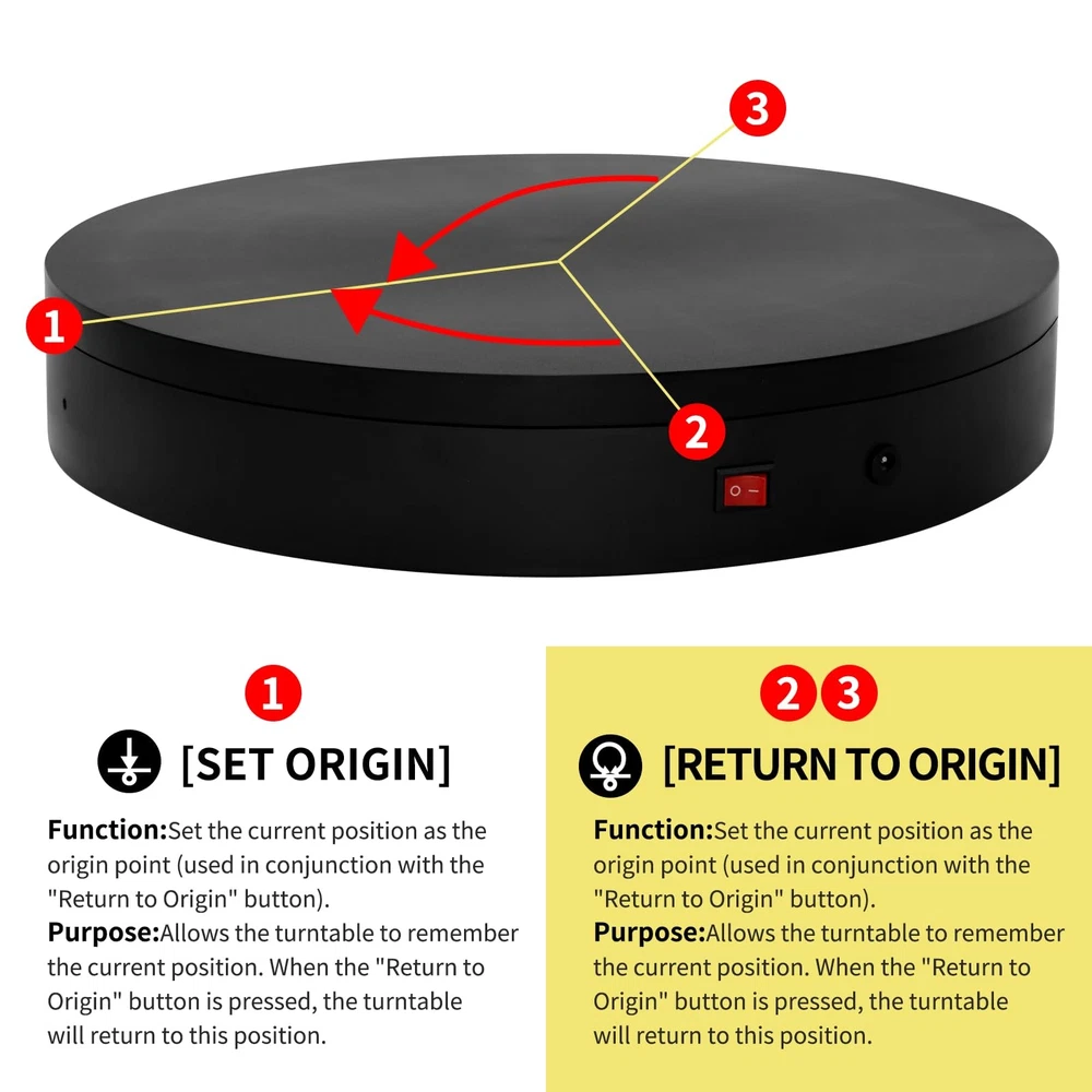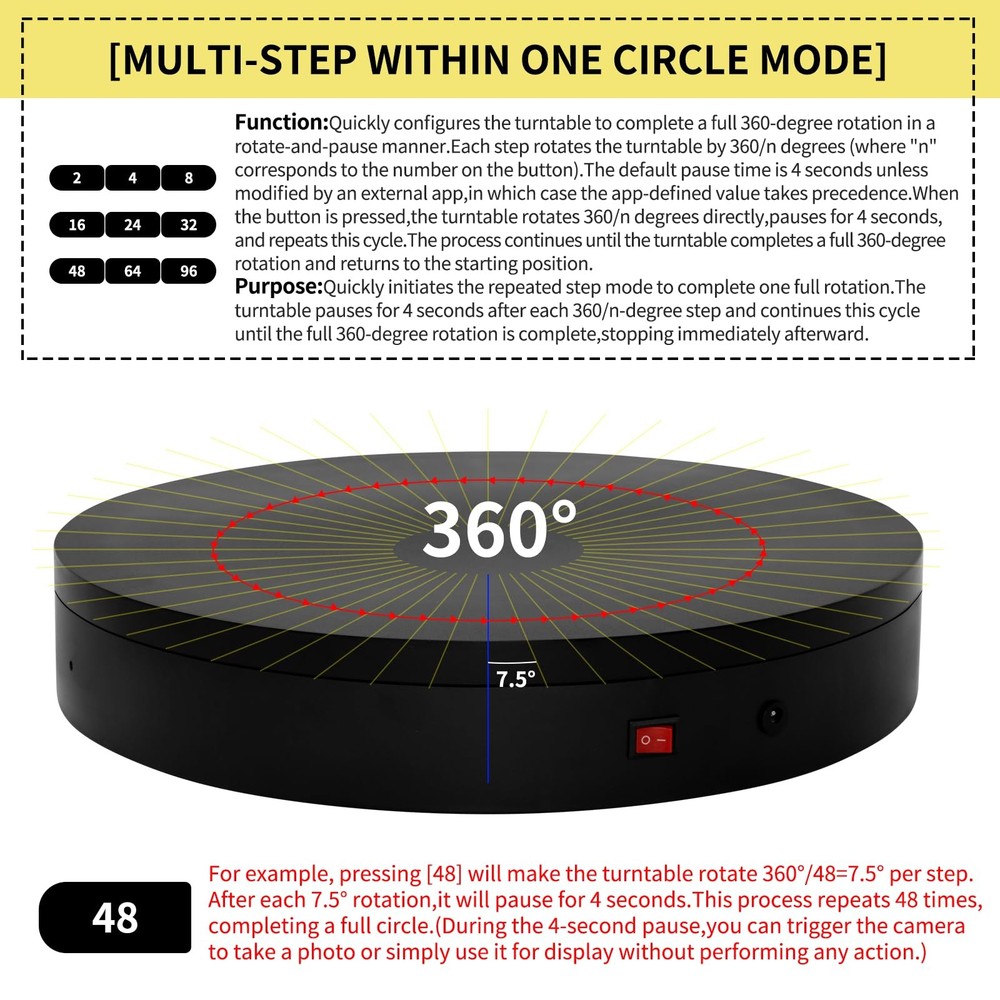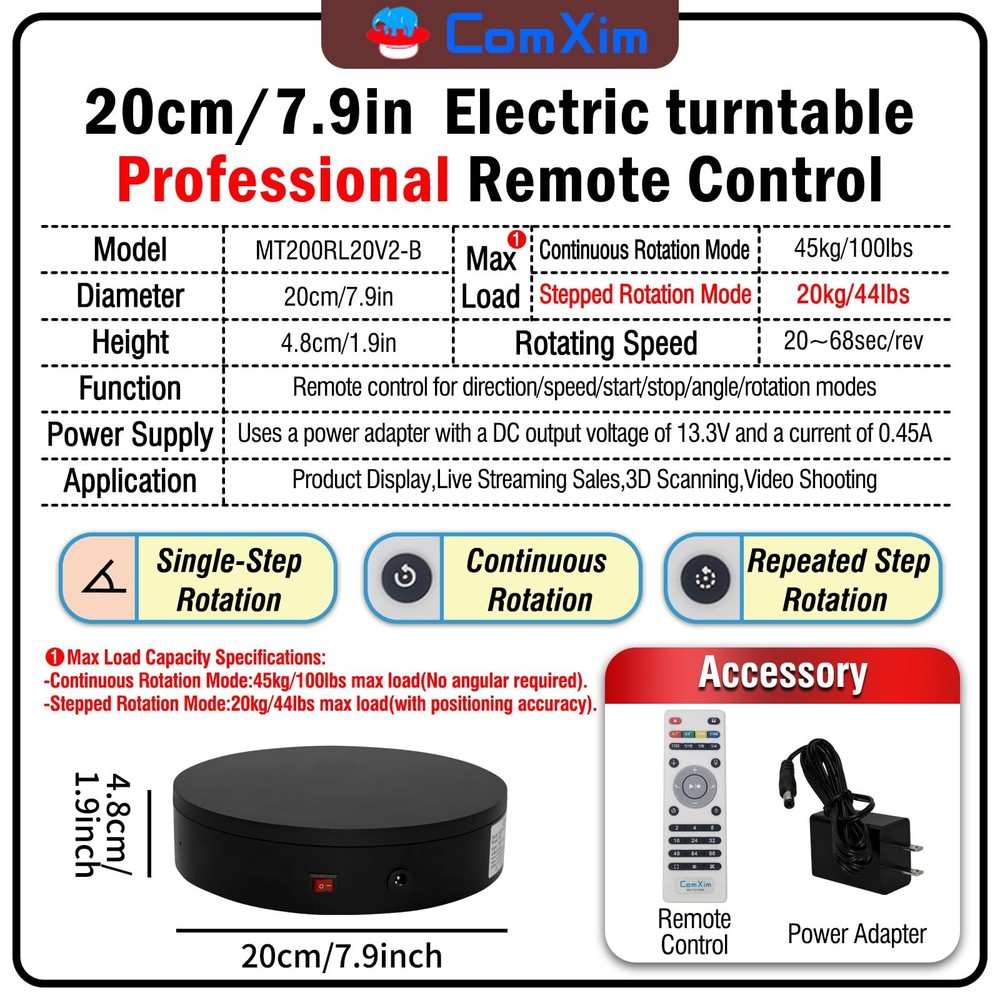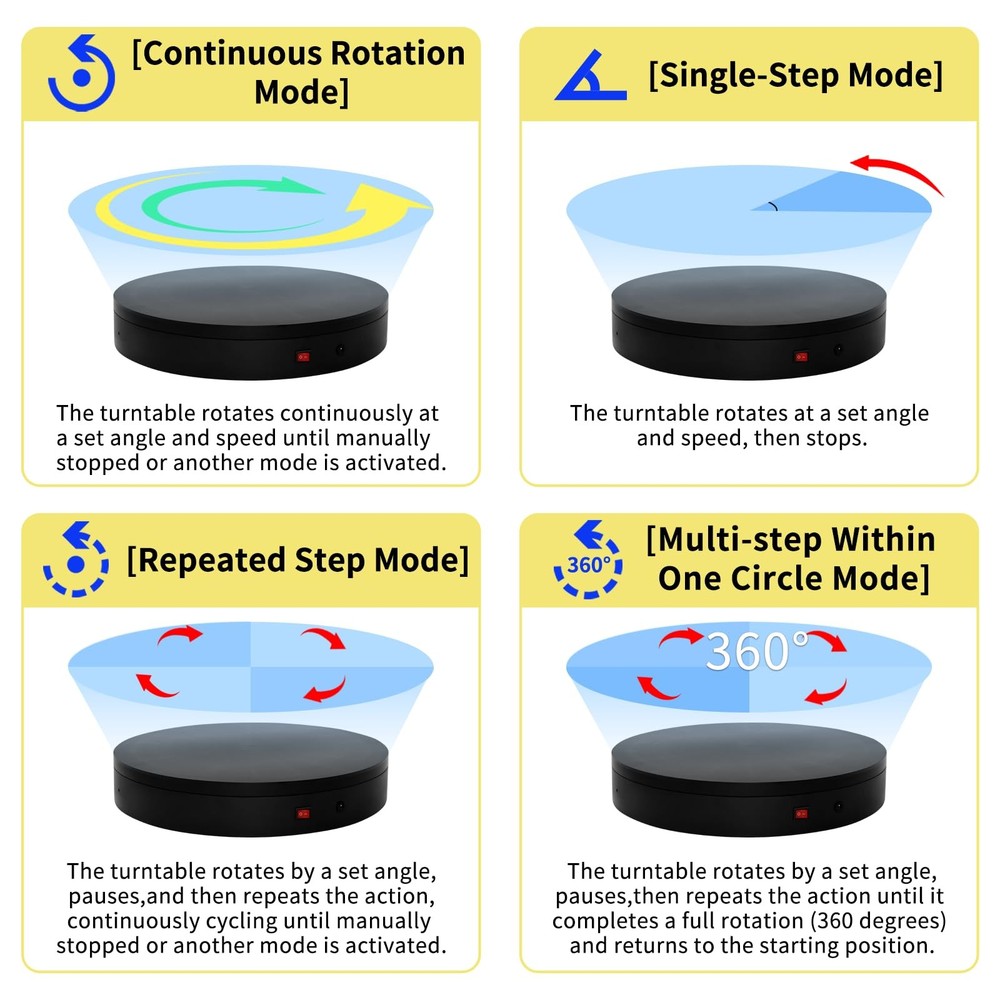 Multi-Rotation Modes: [Continuous Rotation Mode] : The turntable rotates continuously at a set angle and speed until manually stopped or another mode is activated. [Single-Step Mode] : The turntable rotates at a set angle and speed, then stops. [Repeated Step Mode] : The turntable rotates by a set angle, pauses, and then repeats the action, continuously cycling until manually stopped or another mode is activated. [Multi-step Within One Circle Mode] : The turntable rotates by a set angle, pauses, then repeats the action until it completes a full rotation (360 degrees) and returns to the starting position. about [Set Angle] : Purpose: 1. Single-Step Mode: Rotates the specified angle and then stops. 2. Repeated Step Mode: Rotates the specified angle, pauses, and repeats the cycle until interrupted by another operation. about [Set Origin] :Purpose: Allows the turntable to remember the current position. When the "Return to Origin" button is pressed, the turntable will return to this position. about [Return to Origin] : Purpose: When the "Return to Origin" button is pressed, the turntable moves back to the previously set origin position. about [Speed Up] : Purpose: Adjusts the turntable's rotation speed, taking effect immediately. about [Speed Down] :Purpose: Adjusts the turntable's rotation speed by one level, taking effect immediately. about [Clockwise Direction] : Purpose: Adjusts the turntable's rotation direction to clockwise, taking effect immediately. about [Counterclockwise Direction] :Purpose: Adjusts the turntable's rotation direction to counterclockwise, taking effect immediately. about [Start/Stop] :Purpose: Starts the turntable if it was stopped, or stops it if it was rotating. The state toggles between rotating and stopped each time this button is pressed. !NOTE:【Max Load】: Max Loading range is 40~100lbs(20~45kg) - Continuous Rotation Mode: "45kg" max load(No angular positioning required). - Stepped Rotation Mode: "20kg" max load(With positioning accuracy). 【Specifications of this Display Platform】 Diameter: "20cm/7.9 inches." Rotation Speed Range: "Adjustable speed range of 20 to 68 seconds per revolution". Direction: "Supports clockwise and counterclockwise rotation". 【Professional Display Platform Remote Control】Precise angle settings and user-friendly combination key design enable support for a wider range of applications. Support: Set the current position as the origin point (used in conjunction with the "Return to Origin" button). Support: Save the current settings to the turntable's internal flash. More versatile angle buttons and mode button combinations provide greater flexibility for various applications. 【The Rotating display stand Supports four rotation modes】: 【Continuous Rotation Mode】for Live Video Show.【Single-Step Mode】for Product Display and Live Demonstration.【Repeated Step Mode】 for Automated Product Display .【Multi-step Within One Circle Mode】for 360-Degree Multi-Angle Photography and 3D Scanning. The intelligent multi-step within one circle mode makes shooting more streamlined and automated. 【Excellent Structural Design】 The Rotating Platform is equipped with a flat thrust bearing inside, enabling it to support heavier loads. It features a high-precision reduction stepper motor (a type of brushless motor), offering high torque, long lifespan, stable rotation, quiet operation, and reliable performance. 【The Rotating Platform Application Scenarios】Widely used for 3D scanning, body scanning and modeling, product display, video shooting, product photography, 360-degree photography, and large-scale product displays both in-store and online, such as clothing mannequins, Christmas trees, digital products, and household items. A High-Precision Photography Turntable supporting Multi-step Within One Circle Mode enables effortless automatic multi-angle capture. 【Power Adapter】The adapter input is AC 100~240V, and the output is DC 13.3V/0.5A. US Standard Plug. UL-certified power adapter. The electric turntable has passed the US FCC certification, EU CE and ROHS certification.