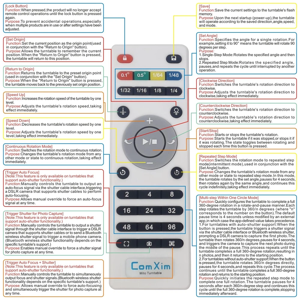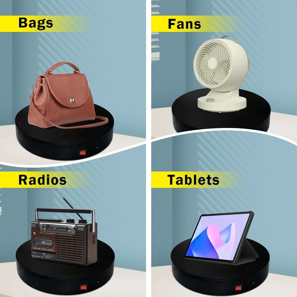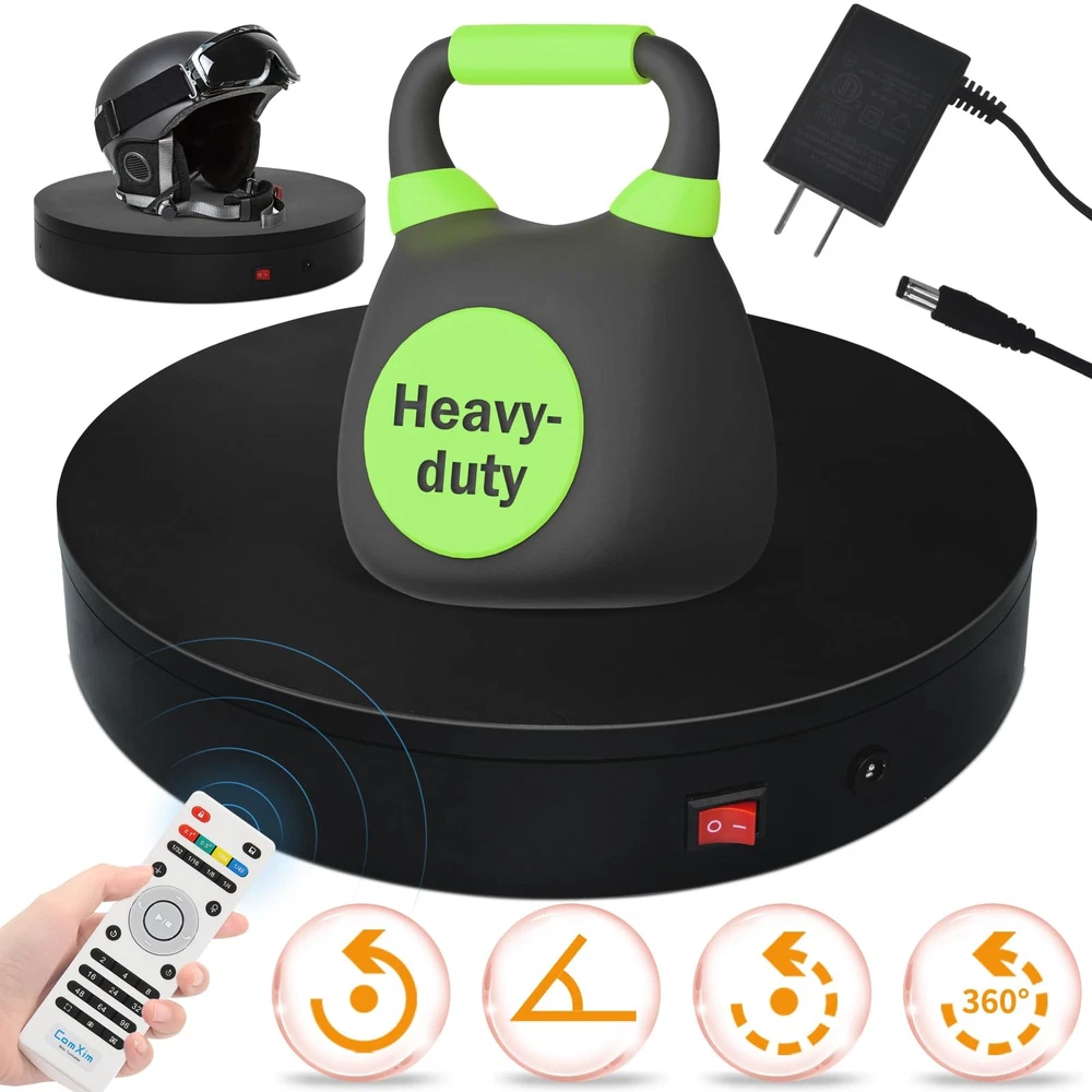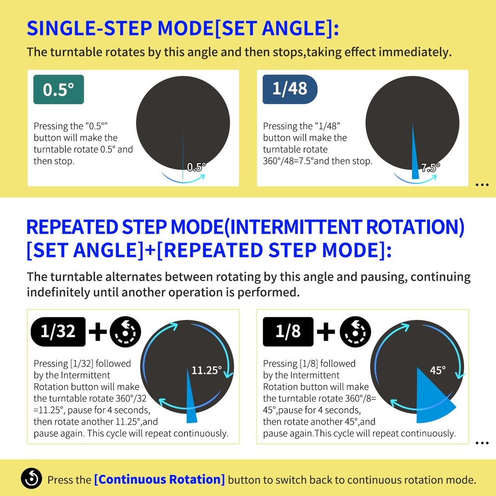 Multi-Rotation Modes: [Continuous Rotation Mode] : The turntable rotates continuously at a set angle and speed until manually stopped or another mode is activated. [Single-Step Mode] : The turntable rotates at a set angle and speed, then stops. [Repeated Step Mode] : The turntable rotates by a set angle, pauses, and then repeats the action, continuously cycling until manually stopped or another mode is activated. [Multi-step Within One Circle Mode] : The turntable rotates by a set angle, pauses, then repeats the action until it completes a full rotation (360 degrees) and returns to the starting position. about [Set Angle] : Purpose: 1. Single-Step Mode: Rotates the specified angle and then stops. 2. Repeated Step Mode: Rotates the specified angle, pauses, and repeats the cycle until interrupted by another operation. about [Set Origin] :Purpose: Allows the turntable to remember the current position. When the "Return to Origin" button is pressed, the turntable will return to this position. about [Return to Origin] : Purpose: When the "Return to Origin" button is pressed, the turntable moves back to the previously set origin position. about [Speed Up] : Purpose: Adjusts the turntable's rotation speed, taking effect immediately. about [Speed Down] :Purpose: Adjusts the turntable's rotation speed by one level, taking effect immediately. about [Clockwise Direction] : Purpose: Adjusts the turntable's rotation direction to clockwise, taking effect immediately. about [Counterclockwise Direction] :Purpose: Adjusts the turntable's rotation direction to counterclockwise, taking effect immediately. about [Start/Stop] :Purpose: Starts the turntable if it was stopped, or stops it if it was rotating. The state toggles between rotating and stopped each time this button is pressed. !NOTE:【Max Load】: Max Loading range is 40~100lbs(20~45kg) - Continuous Rotation Mode: "45kg" max load(No angular positioning required). - Stepped Rotation Mode: "20kg" max load(With positioning accuracy). 【Specifications of this Display Platform】 Diameter: "20cm/7.9 inches." Rotation Speed Range: "Adjustable speed range of 20 to 68 seconds per revolution". Direction: "Supports clockwise and counterclockwise rotation". 【Professional Display Platform Remote Control】Precise angle settings and user-friendly combination key design enable support for a wider range of applications. Support: Set the current position as the origin point (used in conjunction with the "Return to Origin" button). Support: Save the current settings to the turntable's internal flash. More versatile angle buttons and mode button combinations provide greater flexibility for various applications. 【The Rotating display stand Supports four rotation modes】: 【Continuous Rotation Mode】for Live Video Show.【Single-Step Mode】for Product Display and Live Demonstration.【Repeated Step Mode】 for Automated Product Display .【Multi-step Within One Circle Mode】for 360-Degree Multi-Angle Photography and 3D Scanning. The intelligent multi-step within one circle mode makes shooting more streamlined and automated. 【Excellent Structural Design】 The Rotating Platform is equipped with a flat thrust bearing inside, enabling it to support heavier loads. It features a high-precision reduction stepper motor (a type of brushless motor), offering high torque, long lifespan, stable rotation, quiet operation, and reliable performance. 【The Rotating Platform Application Scenarios】Widely used for 3D scanning, body scanning and modeling, product display, video shooting, product photography, 360-degree photography, and large-scale product displays both in-store and online, such as clothing mannequins, Christmas trees, digital products, and household items. A High-Precision Photography Turntable supporting Multi-step Within One Circle Mode enables effortless automatic multi-angle capture. 【Power Adapter】The adapter input is AC 100~240V, and the output is DC 13.3V/0.5A. US Standard Plug. UL-certified power adapter. The electric turntable has passed the US FCC certification, EU CE and ROHS certification.