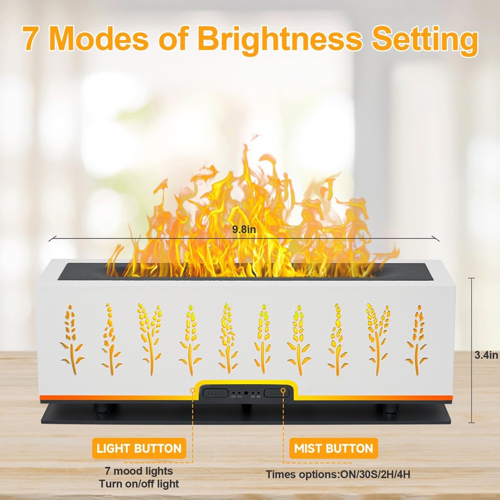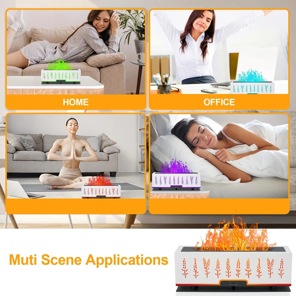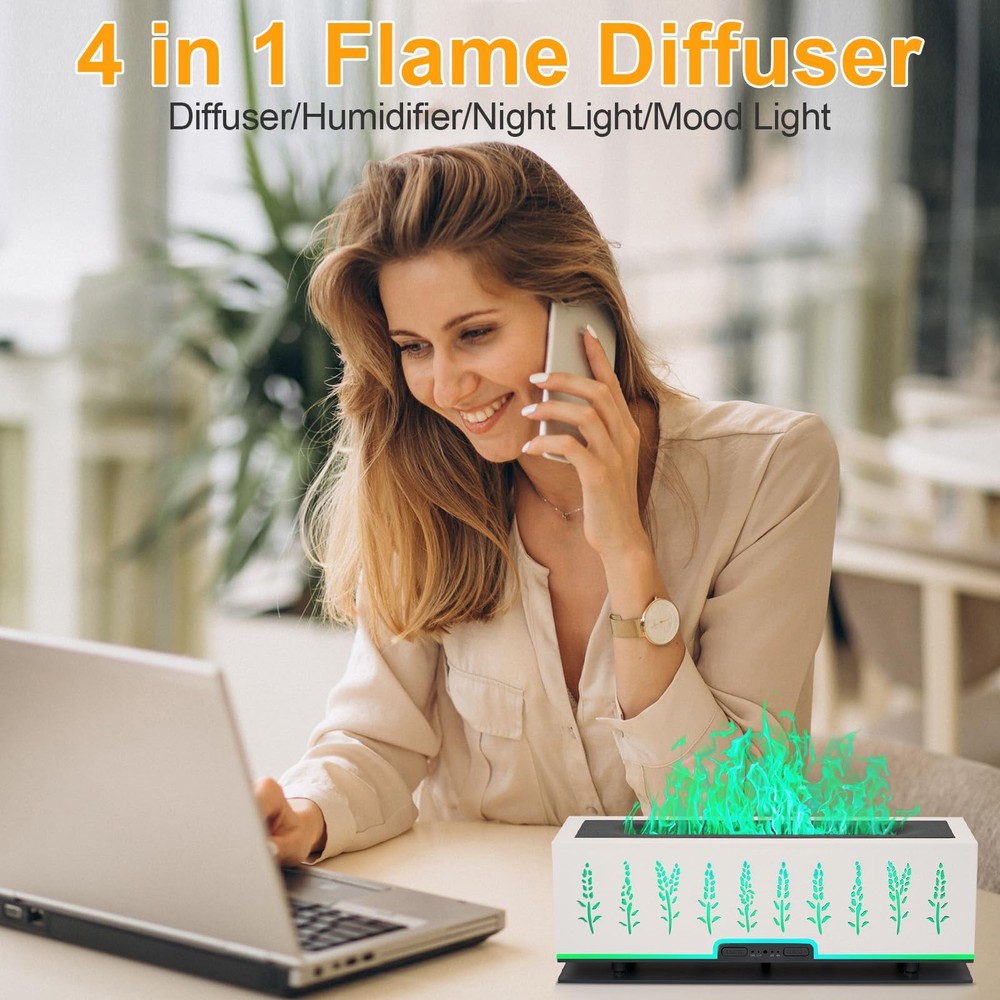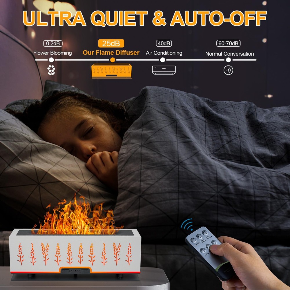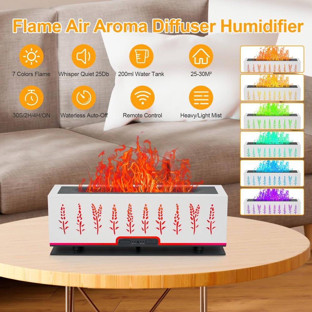 【Essential Oil Diffuser】- More than just filling your home with aroma,essential oil diffuser can enjoy fragrant & soothing atmosphere 【Natural Aromatherapy】 - Moisturize your skin and ensure a pleasing atmosphere for you to relax. 【Multi-function aroma 360 diffuser for home】: Diffuser, Night Light, Humidifier, Home Decor 【Ideal Gift】: For Birthday, Anniversary, Mother's Day, Father's Day, Christmas,Housewarming.. 【Product Description】: *Product Name: Flame lamp aromatherapy humidifier *Material: PP+ABS *Color:White *Tank Capacity: 200ML *Noise Level: less than 30 dB *Ultrasonic frequency: 2.4MHZ *Essential oils: Supported *Fog adjustment: support (strong/weak gear) *Intermittent/Continuous spray:supported *Length of Cord:150CM 【Package Included】: 1 x Aroma Diffuser 1 x Remote Control 1 x AC Adapter 1 x User Manual 【CAUTIONS】: Note1:Please do not exceed the max Water Line of 200ml, otherwise it will affect the mist or leak water and cause damage to the host. Note2:Do not open the diffuser cover when use . Note3:Use clean water before use. Clean the diffuser at least once a week and do not leave water or moisture in the device. 7 COLORS FLAME LIGHT DIFFUSER---- Upgraded flame oil diffuser featuring two modes of seven-color cyclic lighting (orange, red, yellow, green, blue, blue, purple) and fixed-color lighting. Use LED light combination with flame humidification effect, making the whole diffuser look like a burning fireplace. It is not only a aromatherapy diffuser, can also be mist diffuser , romantic mood light and night light. Perfect Christmas Gift Idea -Looking for a unique Christmas gift? This cute flame diffuser is a great gift for your family, friend, colleague in Christmas, Xmas, birthday, thanksgiving, wedding gifts, Valentines, housewarming, or other special holiday. They always squeals with delight when they open the fire diffuser. It is suitable for various production places such as home, living room, bedroom, office, ready to create a soothing atmosphere wherever you desire. 200ML Capacity & Timing --- Upgraded aroma diffuser with 200ml water tank allows you to humidify continuously up to 8 hours, . The color changing diffuser has Intermittent mist mode and continuous mist that keep misting until water runs out, auto shut-off when working once lacks water, making it very safe and reliable. Timing function supports 30/120/240 minute timers and steady ON mode to meet daily diversified needs. Super Quiet& Safe-- The noise can be controlled below 25dB when the aroma diffuser runs, Late night humidification will not disturb your res. And our oil diffuser essential oils as it runs emits a gentle subtle water sound that mimics the soothing sound of white noise, creating a tranquil environment perfect for relaxation, study or meditation. Flame diffuser with cool mist which is cool to touch without overheating, it’s safe even for baby and the pregnant. Enjoy a Healthy Aroma Life: Built-in ultrasonic atomization device. after adding water, add 3-5 drops of your favorite essential oils to relieve fatigue, moisturize your skin, and ensure a pleasing atmosphere for you to relax, It has a good humidification and aromatherapy effect. And it comes with an easy to use remote control, lying down can also enjoy the fragrance experience at your leisure.