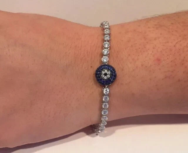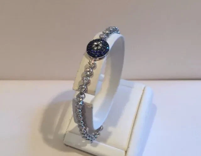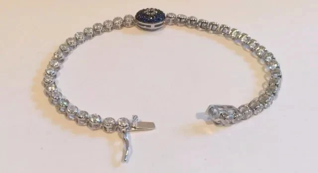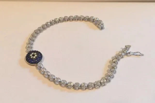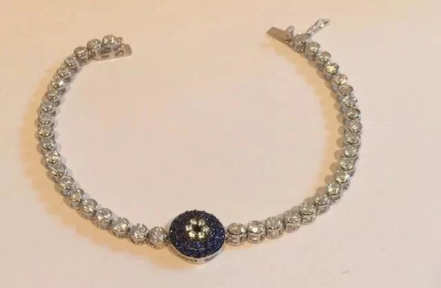 Metal: Sterling Silver Main Stone Shape: Round Secondary Stone: Diamond Material: Stone, Metal Item Length: As per picture Country/Region of Manufacture: India Era: Undated Type: Bracelet Sizable: Yes Base Metal: Sterling Silver Color: White Personalize: Yes Main Stone Width: As per picture Number of Gemstones: As Per Picture Main Stone Length: As per picture Customized: Yes Vintage: No Signed: No Shape: Round Country of Origin: India Antique: No Main Stone Depth: As per picture Setting Style: Prong Closure: Snap Cut Grade: Excellent Wholesale: Yes Brand: karunas-76 Style: Tennis Occasion: Anniversary, Birthday, Christening, Christmas, Engagement, Graduation, Mother's Day, Valentine's Day, Wedding Seller Warranty: Yes Metal Purity: 925 Handmade: Yes Charm Type: Snap Main Stone Creation: Simulated Main Stone Treatment: Not Enhanced Main Stone: Sapphire Gemstone Clarity Grade: NA Chain Type: Cable Features: Engraved Theme: Beauty Main Stone Color: Blue