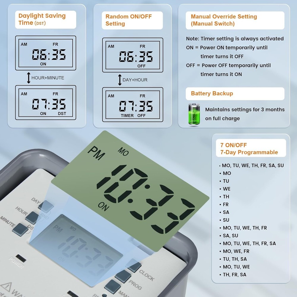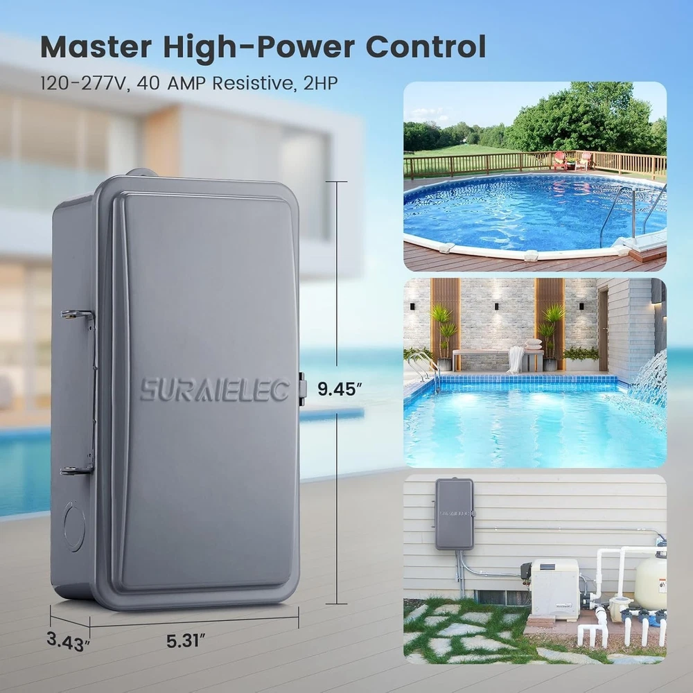 Pool Timer, 7-Day 24-Hour Digital Pool Pump Timer, 40 AMP Heavy Duty, 120/240/277 VAC, Outdoor Metal Casing, Electric Timer Switch Box for Swimming Pool Pump, Hot Water Heater, Spa, Lights Heavy Duty 40 AMP Digital Pool Timer: 1HP 120V, 2HP 240V; Supports 120 to 277 VAC; Handles 40A resistive loads; Ideal for controlling pool filter pumps, water heaters, and patio lighting; ETL Listed; Conforms to UL Versatile Timer Function: Offers 7 ON/OFF program settings; Includes 15-day combinations, single-day 24-hour settings, Daylight Saving Time (DST) adjustment, and a Random function; Meets diverse scheduling needs for pool pump timers and water heater timers Built-in Battery Keeps Time and Settings: Features a rechargeable battery backup; Retains settings and current time for up to three s when fully charged; No need to reset the swimming pool timer after power outages Weatherproof Heavy Duty Metal Casing: Constructed with a sturdy metal casing; Resists abrasion, moisture, and direct sunlight; Lockable, raintight, and rust-proof metal box cover protects the pool timer from rain, snow, and dust, preventing tampering Easy to Install and Program: Simple setup and operation; Keeps pool pumps or other electrical devices on a regular schedule; Eliminates manual ON/OFF switching; Saves time, money, and hassle with this automatic outdoor digital pool timer