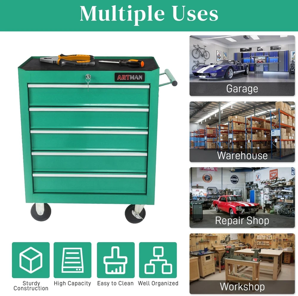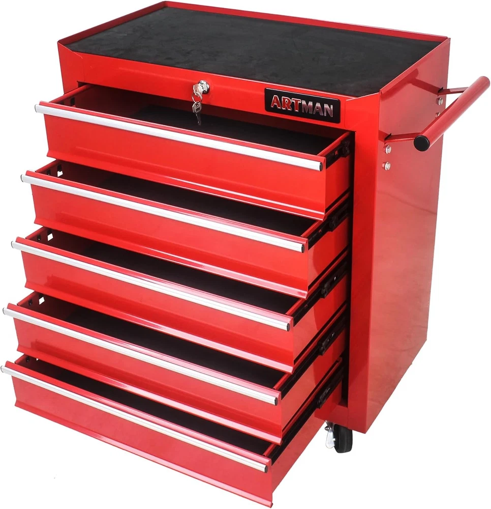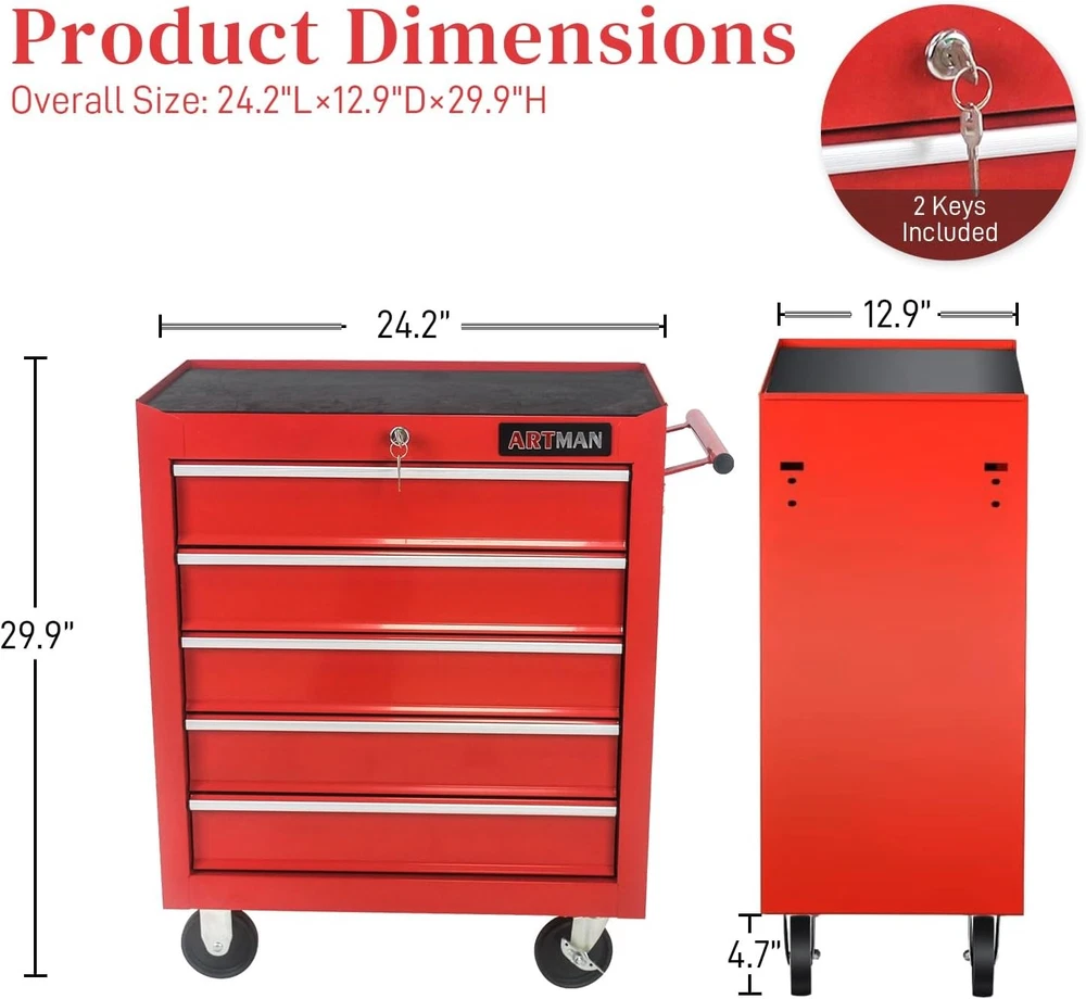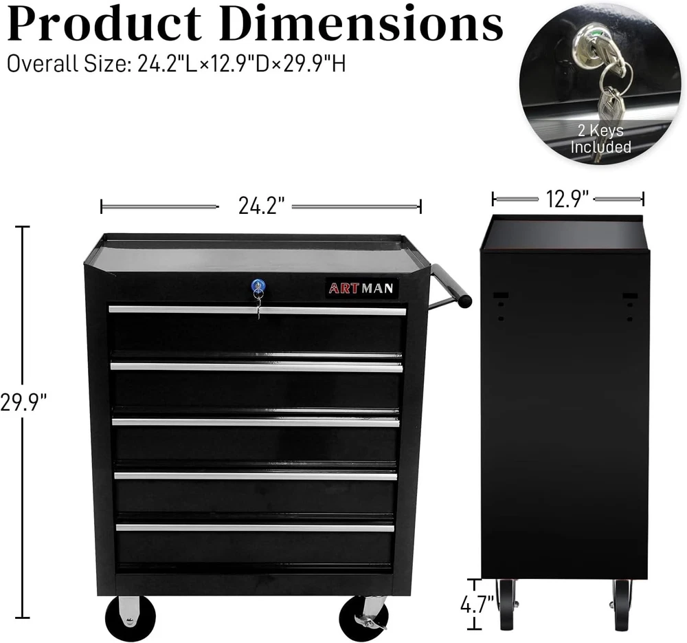 Features: 【100% Brand New Quality】 【Large Capacity】 - Equipped with 5 drawers of 10.8"D×20.0"W×3.9"H, the rolling tool chest creates more ample storage space for all your tools. And the flat top also provides extra space for your frequently used tools and parts. 【Durable Material】 - Our tool cart is carefully polished and powder-coated to ensure wear and rust resistance and will not chip paint. Made of high-quality steel, the structure is strong and stable, which greatly improves the durability. The drawers use ball bearings for smoother opening and closing. 【Multi-Purpose】 - 1 tubular handle, 4 heavy-duty wheels, 2 of which are with brakes, improve the mobility so that the tool cart can be easily moved to any position you want. Our rolling tool box is suitable for garage, warehouse, workshop, repair shop and other places, widely used in gardening and auto maintenance. 【Storage Organizer】- Large storage space, easier mobility features, multiple color options, comes with lock to protect the tools, with excellent functionality and appearance, the tool cabinet will be a good choice for storage in the workshop or at home! 【Easy to Assemble】 - Pre-drilled mounting holes allow for easy assembly in a short time. If you have any questions about the item, please feel free to contact us, we will provide you with 24/7 help. 【Good After-sales Service】 If the damage occurred in transit or the product is broken, please take a photo and contact us, we will solve all the problems for you. Have a nice life! Note: Product colors may vary slightly depending on the phone screen. It is just a very small difference. Size: 12.9"D x 24.2"W x 29.9"H Specification: 5 Drawers Rolling Tool Chest with wheels Our rolling tool box is made of precision cut steel for durable construction and great mobility. The surface is processed by anti-rust paint coating, which is more wear-resistant and easy to clean! With stylish appearance and sufficient capacity, the tool chest can be used in garages, warehouses, workshops, repair shops and other places, which is the best choice for storing all your tools! Just enjoy this tool cart with wheels to customize your own tool organization system and get ready to work! Main Specifications Package: 1* Rolling Tool Chest with 5-Drawer Tool Box 1* Instruction Books 🥇 Please check if your address is correct, we cannot change the address once sent. ●Delivery details 🚚 We have 3 warehouses in the United States: LA warehouse, NY warehouse, CA warehouse; when the warehouse near you is out of stock, we will use the warehouse far away from you to deliver the goods. 🚚Shipping from the United States, door-to-door delivery by UPS or FedEx.1-3 business days with tracking number provided. 3-12 days delivery. It depends on logistics and shipping. Sometimes there may be delays. 🚚We cannot ship to PO Box/Hawaii/Alaska/Puerto Rico/APO ●Return Policy ❤️ 1. We generally do not accept returns! ❤️ 2. If there is a problem with the product quality or it is damaged during transportation, you can contact us by email. I can replace it with a new one for you free of charge. Please do not make a return request lightly. Thanks. ❤️ 3. You can easily contact us by email and we will reply you within 24 hours, except holidays. ❤️ 4. We are more than happy to answer any questions you may have, please contact us via email. ●About Fundiy 👍 1. We hope to be a 100% satisfied seller. 👍 2. We provide high-quality after-sales service, you can contact me at any time. 👍 3. We have extremely fast response to deal with your problems. For example, if the product has quality problems or the product is damaged during transportation, please contact us 👍 4. Please give me ⭐⭐⭐⭐⭐feedback! Thank you!