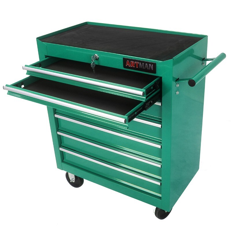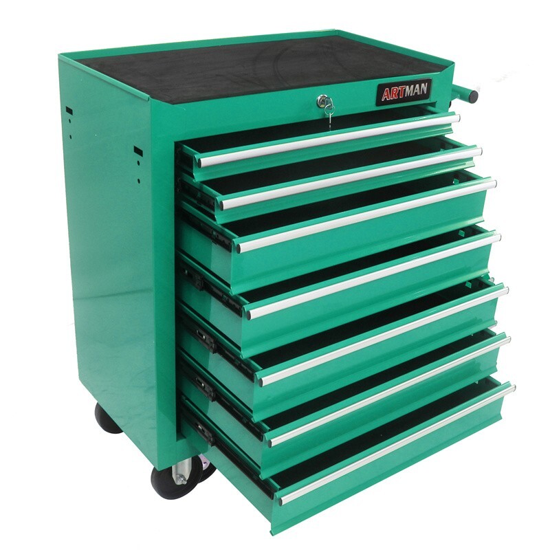 7 Drawers Tool Cart Workshop Rolling Tool Chest Storage Cabinet w/Lock & Key Features and Details : The ARTMAN tool trolley is equipped with a total of 7 drawers . The tool box is also lockable and can be used as a removable, attachable and mobile case attachment The opening and closing of the drawers of the tool cabinet is very gentle thanks to the ball-bearing drawers. The robust and powder-coated steel construction is used for high wear resistance. This assembly trolley has 4 steering wheels, 2 of which with parking brakes, so you can move the trolley freely in the garage, but also stop in one place Specification: Color:Green Material:Cold Rolled Steel Surface Finish :Powder Coating Casters:4" Casters (2PCS with brake and 2PCS without brake) Size :24.2*12.9*29.9inch Drawers Dimension :19.9*10.9*3.1inch Net Weight:25KG
