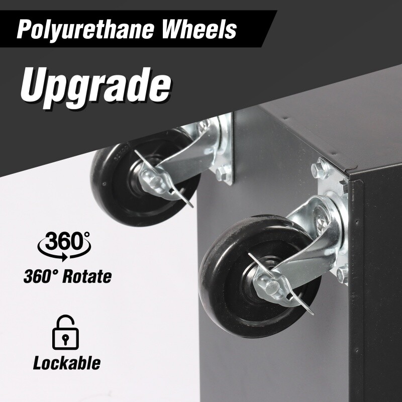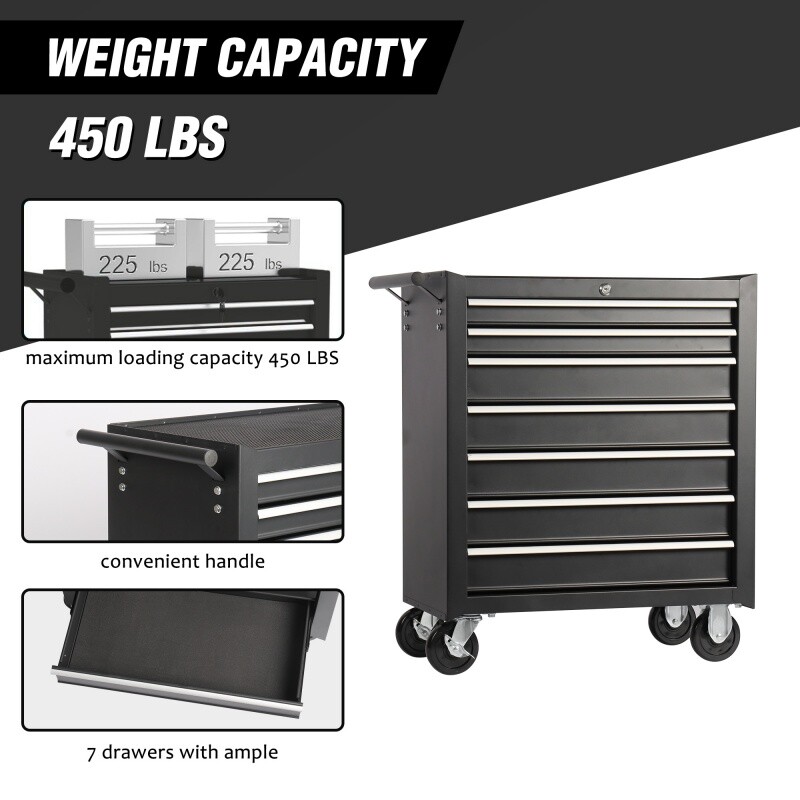 Product Features Large Storage Space: The tool cart is equipped with 5+2 drawers of different sizes, and a large storage space on the bottom. The top storage rack provides additional space for arranging the workshop accessories you need Easy to Move: Our rolling tool box has 4 steering wheels, 2 of which with parking brakes, so you can move the trolley freely in the garage, but also stop in one place. The tool cabinet with 360° flexible and sturdy universal wheels, rolling tool chest cart are padded and smooth ball-bearing drawer slides to reduce slip during movement, protecting tools and reducing noise Practical Rolling Tool Cart: Tool cart is Made of steel, the structure is strong and stable, durability. polished and powder-coated to ensure wear and rust resistance and will not chip paint Storage Drawers: Tool chest with wheels can hold many commonly used tools. The top drawer with interlock. Only one drawer can be opened at a time, the other three drawers will automatically lock to protect your tools from theft and prevent tipping Easy Installation : The toolbox is very easy to install, with detailed instructions and videos to help you with the installation. This rolling toolbox is great for home workshops and some professional environments and could be placed in the garage, workshop, warehouse, etc. Description