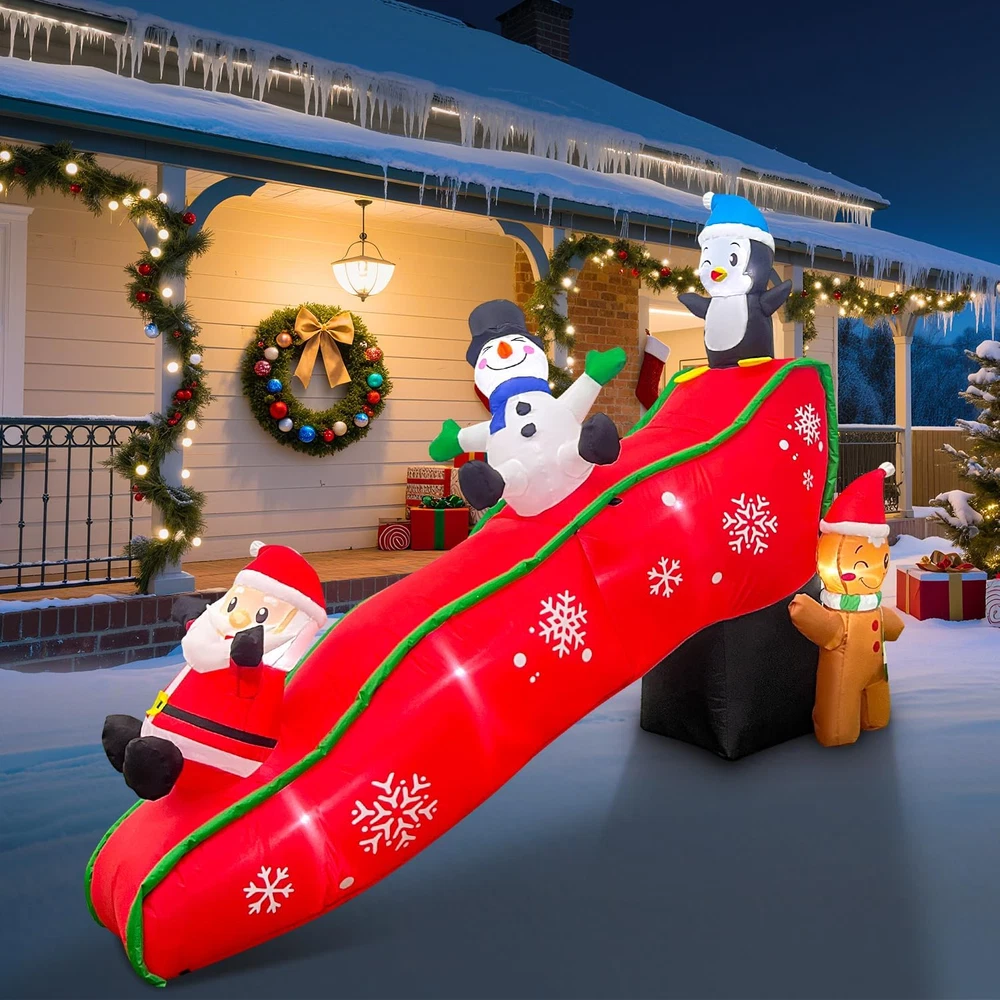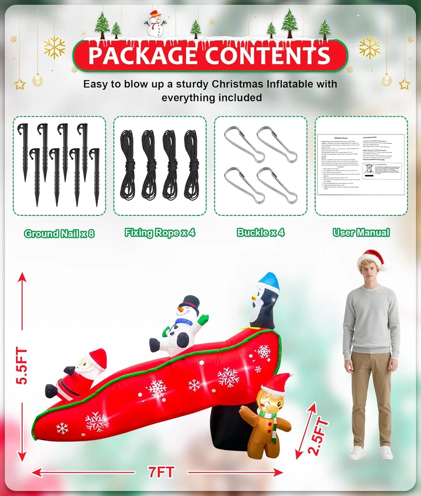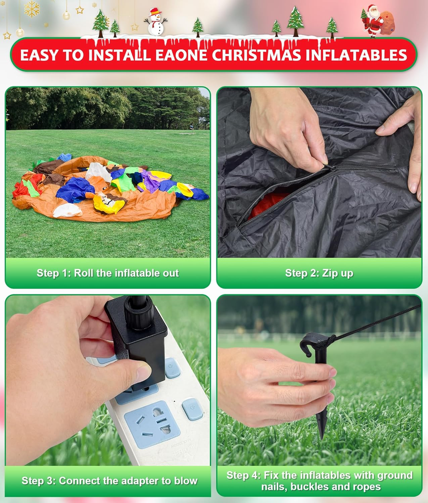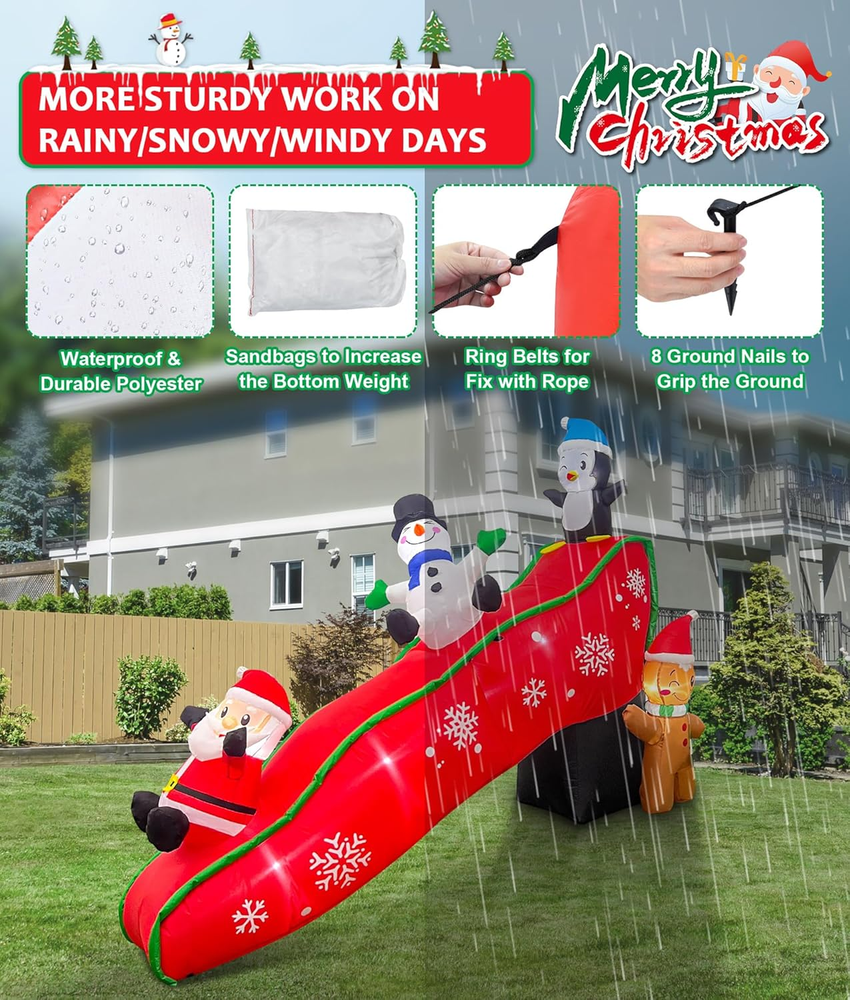 Christmas Fun Slide Party: Adorable Santa Claus, cute snowman, playful penguin, and sweet gingerbread man gather together, sliding down joyfully from the slide, instantly transforming your yard into a magical Christmas paradise straight out of a fairy tale, bringing to life a Christmas story full of childlike fun Affordable & Reusable: Made of premium waterproof polyester fabric with upgraded and excellent sewing craftsmanship, this Christmas funny slide party features long-lasting, fade resistant, weather resistant and air leakage, available for reuse to decorate Christmas in next year More Sturdy from Wind: To improve the stability of the Christmas inflatables when working outdoors, there are several sandbags for filling with sands to increase its bottom weight. Combined with belt loops, rope, and ground nails, the overall design of the inflatable Santa Claus makes it more sturdy, ensuring normal use, even in windy,snowy, and rainy weather Easy Setup & Fast Inflation: EAONE Christmas inflatables is equipped with a strong blower, easy to operate. Unfold and zip up the Santa inflatable in an open area, plug in the adapter, you will got a unique and attractive Christmas decoration in a few minutes Built-in LED Light: To enhancing the viewing experience and decorative effect, the Christmas blow ups is designed with 6pcs LED lights inside to light up its body, making it better viewing at night and creating strong festival atmosphere for Christmas. It's a great Xmas ornament for both indoor and outdoor party decorations in this New Year Worry-Free Warranty: We stand behind our products. Enjoy 24/7 customer support and a straightforward 30-day return policy. If you have any questions, our team is here to help ensure a smooth and satisfying experience Product description The video showcases the product in use. The video guides you through product setup. The video compares multiple products. The video shows the product being unpacked. EAONE Christmas Inflatables Funny Slide Party Merchant Video