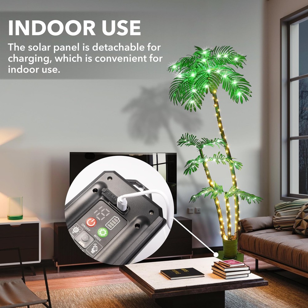 Product Description Solar lighted palm tree is a solar decorative light with the theme of palm trees. The light pole is designed in the shape of a simulated palm tree. The trunk presents a natural brown color. The leaves are made of high-quality plastic material, which is beautiful in simulation. At night, lights peek through the leaves and trunks of the palm trees, creating a unique visual effect. Features 1. Two power supply methods: the christmas palm tree has a built-in high-efficiency solar panel, which can be charged by sunlight during the day without an external power supply, which is environmentally friendly and energy-saving; The battery panel is detachable for charging and can be used indoors after charging. 2. Long working time: Palm tree decor can work for 8-10 hours on a single charge, which is enough for a whole night. 3. Multiple Lighting Modes: The artificial palm tree has a total of 8 light modes, which can be switched by the remote control. 4. IP55 waterproof: the palm tree light is designed with waterproof material, which can be used outdoors in most weather conditions. 5. Simple installation: The installation of the palm tree light is very simple, just assemble it and place it vertically on a flat ground, and then use the attached water bag to fix it. Instructions for use 1. Before using it outdoors, please place the palm tree light in sufficient sunlight to charge. 2. When using indoors, the battery board can be removed and charged in the sun, or an additional indoor plug can be purcha Premium Material And Stable Structure - lighted palm tree Compared with other plastic materials, the palm tree has a metal trunk wrapped in PVC material, equipped with a heavy-duty base and a weighted water bag, which can adapt to most outdoor weathers, ensuring high safety and long-lasting durability. Two Power Supply Modes - The outdoor garden palm tree lights have two power supply methods, when using the palm tree lights outdoors, just put the solar panel in a sunny place to charge; if using it indoors, you can use the included charging It can be used normally indoors by charging the solar panel with a cable. Multiple Lighting Modes - The fake palm tree has 8 pre-programmed lighting modes, you can click the button on the plug to adjust the light mode for various occasions. It can also be controlled with the included remote control. Indoor And Outdoor Usable - Palm tree have IP55 waterproof technology, can adapt to various outdoor weather, suitable for indoor, courtyard, garden, porch, beach, swimming pool, etc. Besides, it can not only be used as yard decoration, but also a perfect decoration for birthday party, Valentine's Day, Christmas, Easter, wedding, anniversary or other festivals. Easy Assembly And Storage - The palm tree light comes with a simple and easy to understand user manual, the artificial palm tree assembly is quick and easy. When not in use, it can be disassembled for storage without taking up space.