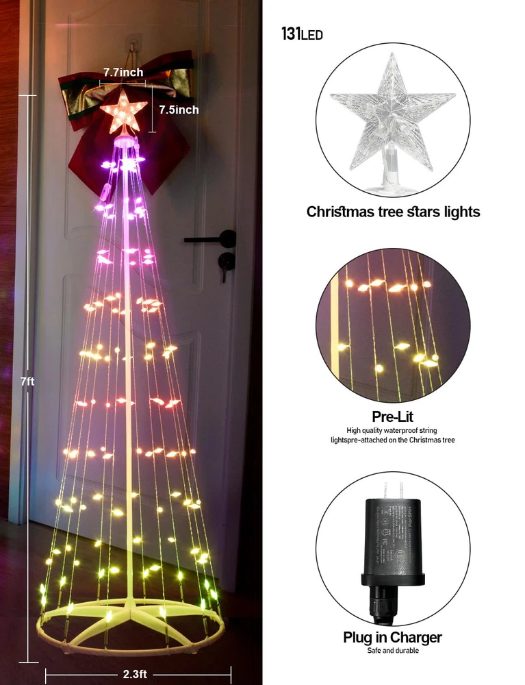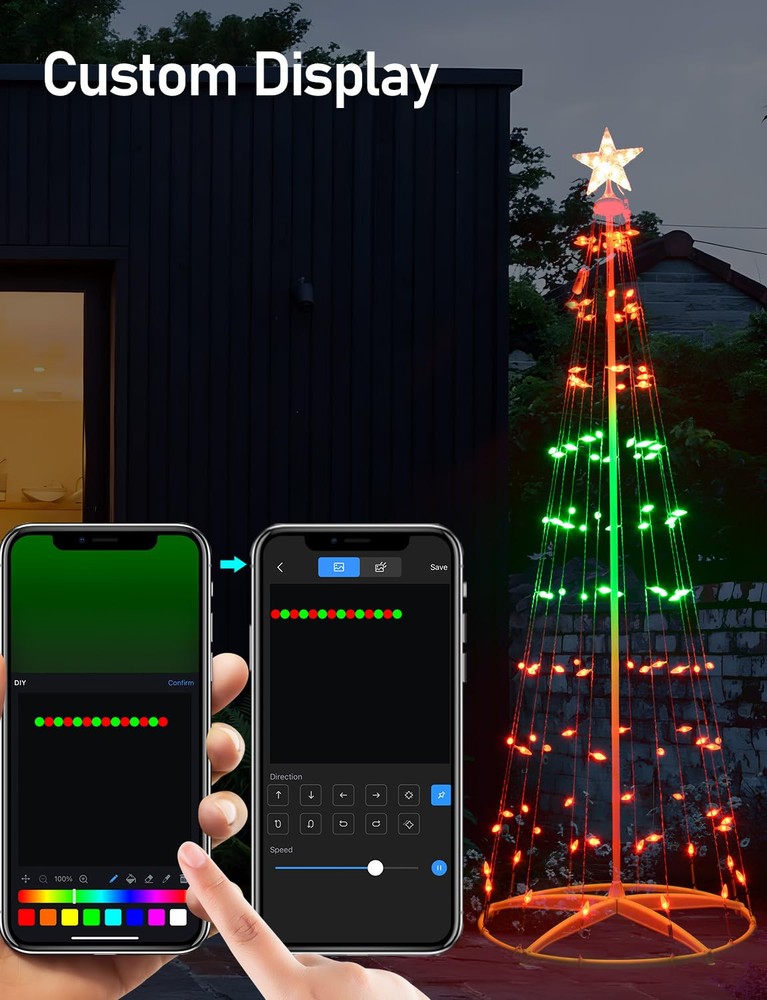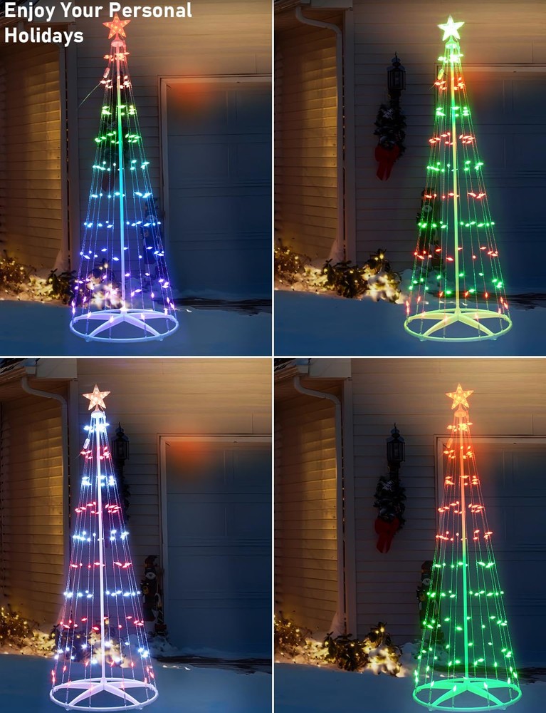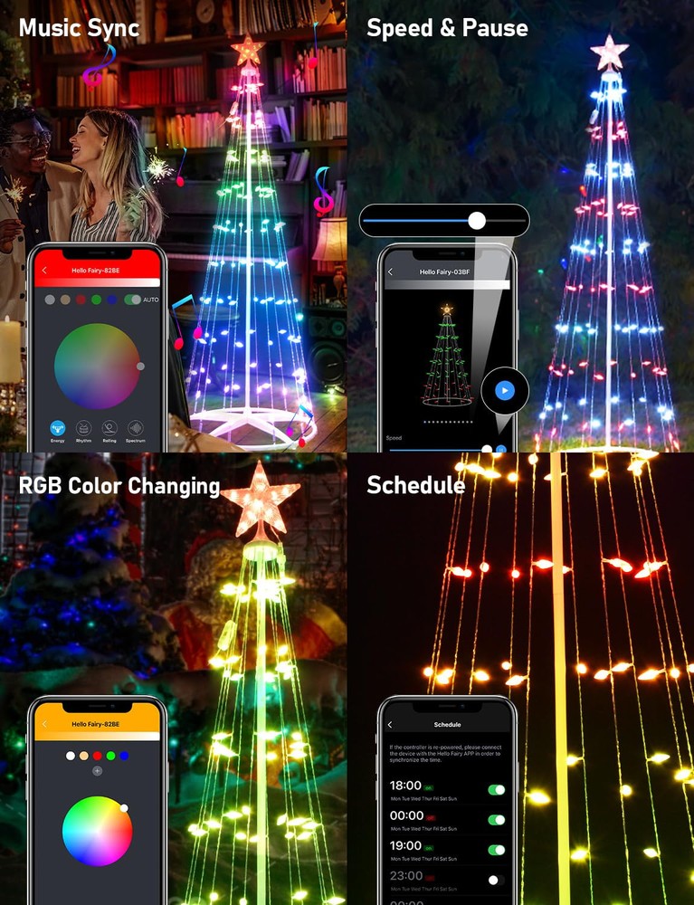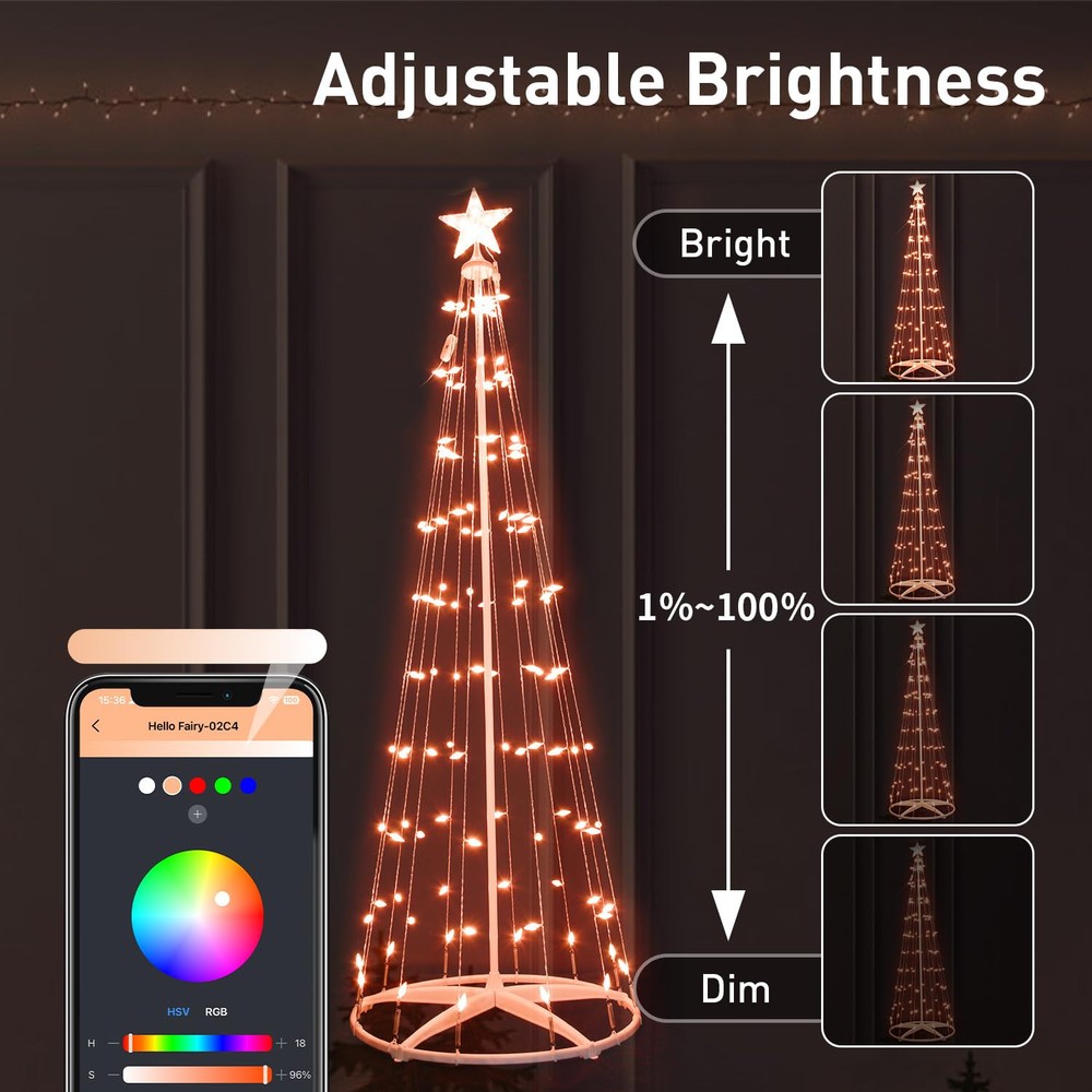 Unique Design:Smart C6 Cone Christmas Tree features C6 string lights designed in a nut-shape, crystal-clear and translucent, distinct from other Cone Christmas trees. Its base is crafted in a round shape, providing stability and reliability while making it easy to assemble. Smart C6 Cone Christmas Tree has a stylish and appealing design, enhancing the warm and romantic ambiance of the Christmas Days Personalize your holidays:With the latest 2024 tech, Smart C6 Cone Christmas Tree let you customize colors, effects, and scenes for your holiday decor using the Hello Fairy app. It also offers 57 preset lighting modes for your decorating needs Make your holiday decor pop: With upgraded IC LEDs, Outdoor Christmas Tree with Lights offer smooth, uniform lighting in 16 million colors, including cool and warm white, enhancing both aesthetics and security Easy enjoy your lighting decor: The outdoor Christmas tree with lights lets you adjust brightness and flashing speed from 1% to 100% via the Hello Fairy app. It also allows you to save and recall your favorite holiday lighting effects for easy enjoyment Timer & Schedule : Create customized timer to automatically turn on or off your outdoor christmas tree with lights. Helps you to prevent power-hungry christmas yard decorations from being left on longer than needed. The controller has memory function, which could recover from the previous setting mode when you restart. Makes your life safer and money saving.