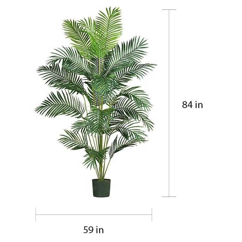 Bring the lush feel of the tropics to your home or office with this beautiful paradise palm tree. This plant features realistic details and is crafted of fine silk to imitate nature without the fuss of routine watering and maintenance. At a soaring seven-feet tall, this lovely palm makes a spectacular impression in any large living room, master suite or professional waiting room. This tree comes ready to display in a plastic pot or add a decorative vase or basket to create your own unique display.Feel the warm tropical breeze in your own home as you gaze at a vibrant silk palm treeDecorative accessory stands 7 feet tallMake a bold statement in your home decor with a realistic treeIncludes a dozen sprawling fronds extend outward in every direction, each covered with a mix of lush feathery Free Shipping Over $49.99* Details Paradise Palm 7-foot Silk Tree - Green Product Description: Bring the lush feel of the tropics to your home or office with this beautiful paradise palm tree. This plant features realistic details and is crafted of fine silk to imitate nature without the fuss of routine watering and maintenance. At a soaring seven-feet tall, this lovely palm makes a spectacular impression in any large living room, master suite or professional waiting room. This tree comes ready to display in a plastic pot or add a decorative vase or basket to create your own unique display. Feel the warm tropical breeze in your own home as you gaze at a vibrant silk palm tree Decorative accessory stands 7 feet tall Make a bold statement in your home decor with a realistic tree Includes a dozen sprawling fronds extend outward in every direction, each covered with a mix of lush feathery pinnate styled leaves