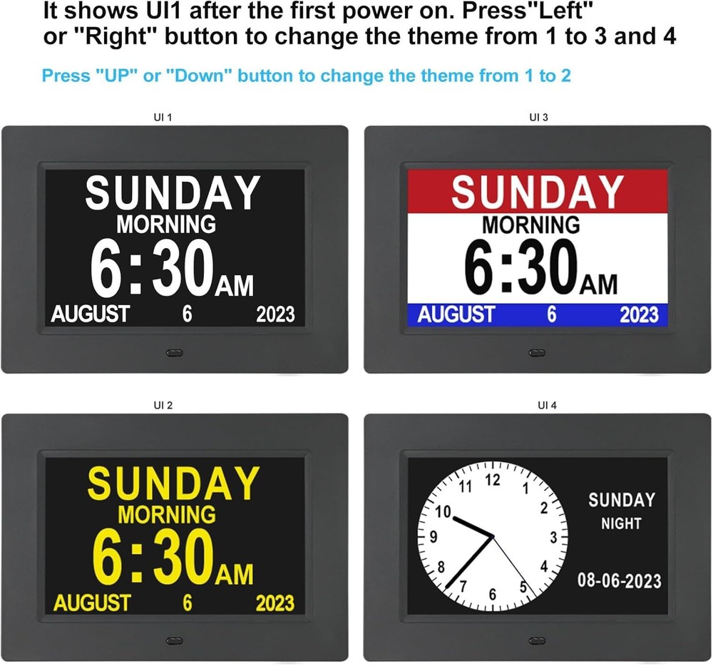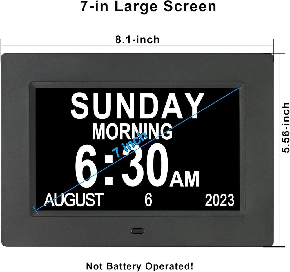 【UNIQUE AM PM CLOCK】-Day date time clock clearly spells out DAY DATE TIME MONTH and YEAR in large,Time mode [ 12 or 24 hours], 5 time period: 6:00am - 11:59am (MORNING), 12:00pm - 5:59pm (AFTERNOON), 6:00pm - 8:59pm (EVENING), 9:00pm - 11:59pm (NIGHT) and 12:00am - 5:59am (PREDAWN) 【12 ALARMS OPTIONS】-Dementia clock with 12 Alarm Modes Easy set, Single Alarm, Every Day, Mon. to Fri. or Weekends Only. & tag: Meal, Medicine, Clinic, Shower, Gardening, Cleaning, Appointment and Walk dog. It is quickly becoming a perfect Senior Care and In Home Care necessity 【AUTO DIMMING 】- Memory loss clock Automatic brightness conversion during the 7:00 PM and the 7:00 AM(Mid, Low or High Brightness); also can adjust brightness by yourself (level 1-5) 【BATTERY BACKUP & 8 LANGUAGES】- In case of the power outage, Alzheimer Clock will be reset to the correct time and date when the power returns. Seniors clock is with 8 Languages: English, French, Italian, Dutch, Spanish, Polish, Nederland and Welsh 【SATISFACTION PROMISED & IDEAL GIFT】-We believe in our products. That's why we 30 days 100% money-back and provide friendly, easy-to-reach support. The words Dementia, Alzheimer's or Memory Loss are ‘not’ printed on the clock itself so it makes a great gift for those special loved ones, especially Grandma & Grandpa