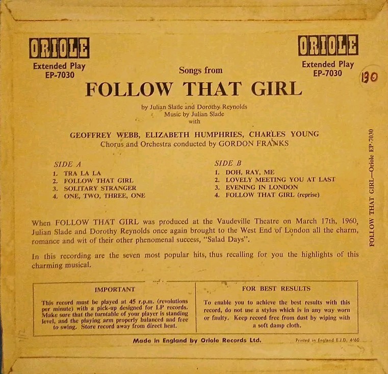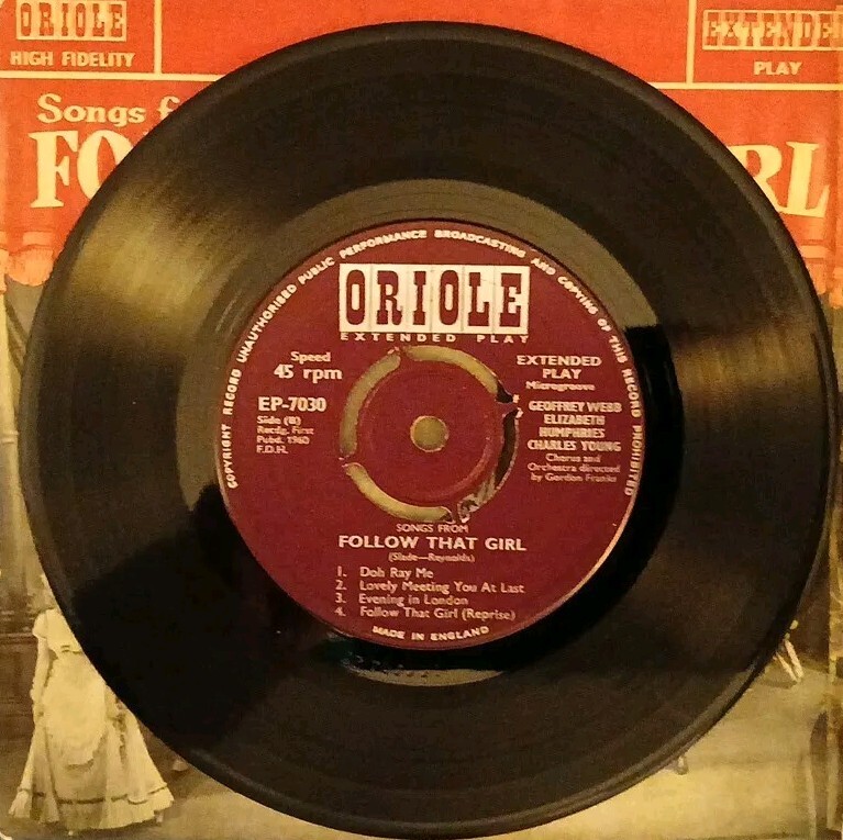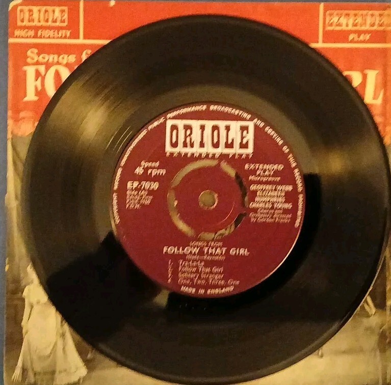 This 7" vinyl EP features songs from the popular soundtrack 'Follow That Girl',by Julian Slade and Dorothy Reynolds. The record label is Oriole and the catalogue number is EP 7030. The vinyl material is of very good plus (VG+) grading, the sleeve also has a VG+ grading. The EP includes an original cover and features English language lyrics. This item is perfect for collectors of easy listening and soundtrack music.