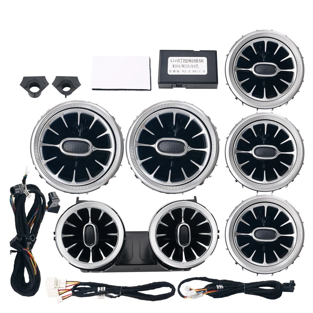 Features: 100% Brand New in Box W205 7PCS/Set 64 Colors NEW Version High Quality Plug and Play Interior Front and Rear Dashboard Air Vent with Ambient Light 1:1 Replacement; NO Modification Required Fitment: For Mercedes Benz C-Class W205 2017 2018 2019 2020 2021( 64 Colors ) - OEM design, fit original air vent position perfectly - Light color is synchronized with original ambient light - Light color and brightness can be controlled by original Command knob Package included: 7 PCS/Set Front and Rear Air Vents with Ambient Light NOTE: NOT Including Installation Guide or Manual. Professional installation is highly recommended .