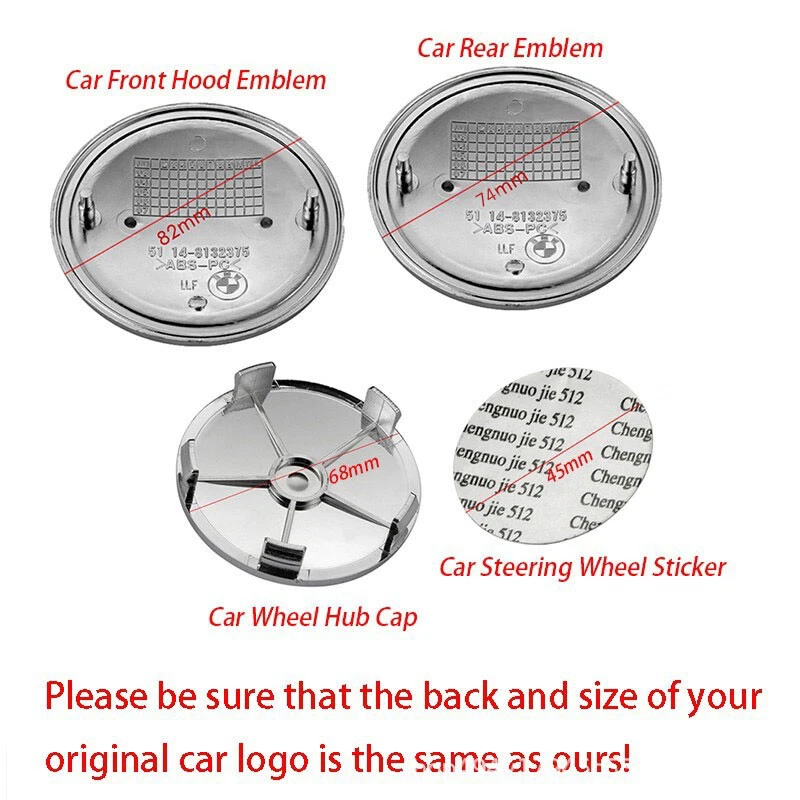 Features: DIY manual installation,bring the fun of modification, make your car look new and feel more comfortable.The emblem is made of high-impact ABS and Aluminum which are waterproof and anti-rust. Easy to Install,Remove film/plastic cover before installing this badge.Remove the old badge and attach the new badge to it. Fits most B-M,W models,the size is Hood/Trunk emblem 82mm/74mm, Wheel center caps hub caps 68mm, Steering wheel emblem decal 45mm, ,please check the dimensions of your original emblem to make sure this emblem fits your car. Package: 1x Hood emblem(82mm) 1x Trunk emblem(74mm) 4x Wheel center hub cap (68mm) 1x Steering wheel emblem (45mm) Note: Please check diameter of existing caps to be extra sure Cap diameter = 68mm Features: Made from a High Strength ABS plastic with a gloss surface High quality replacement Easy Installation, Direct Fit, Perfect Replacement BMW Fitment Guide List BMW 1 Series (E82,E88) 128i 2006, 2007, 2008, 2009, 2010, 2011, 2012 BMW 1 Series (E82,E88) 135i 2006, 2007, 2008, 2009, 2010, 2011, 2012 BMW 1 Series (E82,E88) eDrive 1 2011, 2012 BMW 1 Series (E82,E88) M Coupe 2011, 2012 BMW 3 Series (E21,E30,E36,E46,E90,E91,E92,E93) 318i 1991, 1992, 1993, 1994, 1995, 1996, 1997, 1998, 1999 BMW 3 Series (E21,E30,E36,E46,E90,E91,E92,E93) 318ti 1994, 1995, 1996, 1997, 1998, 1999, 2000 BMW 3 Series (E21,E30,E36,E46,E90,E91,E92,E93) 320i 1992, 1993, 1994, 1995, 2000, 2001, 2002, 2003, 2004, 2005, 2011, 2012 BMW 3 Series (E21,E30,E36,E46,E90,E91,E92,E93) 323Ci 1998, 1999, 2000, 2001 BMW 3 Series (E21,E30,E36,E46,E90,E91,E92,E93) 323i 1996, 1997, 1998, 1999, 2000, 2001, 2005, 2006, 2007, 2008, 2009, 2010,2011, 2012 BMW 3 Series (E21,E30,E36,E46,E90,E91,E92,E93) 325Ci 2000, 2001, 2002, 2003, 2004, 2005, 2006, 2007 BMW 3 Series (E21,E30,E36,E46,E90,E91,E92,E93) 325i 1990, 1991, 1992, 1993, 1994, 1995, 1996, 2000, 2001, 2002, 2003, 2004,2005, 2006,2007 BMW 3 Series (E21,E30,E36,E46,E90,E91,E92,E93) 325is 1990, 1991, 1992, 1993, 1994, 1995, 1996 BMW 3 Series (E21,E30,E36,E46,E90,E91,E92,E93) 325xi 2000, 2001, 2002, 2003, 2004, 2005, 2006, 2007 BMW 3 Series (E21,E30,E36,E46,E90,E91,E92,E93) 328Ci 1998, 1999, 2000 BMW 3 Series (E21,E30,E36,E46,E90,E91,E92,E93) 328i 1994, 1995, 1996, 1997, 1998, 1999, 2000, 2004, 2005, 2006, 2007, 2008,2009, 2010,2011, 2012 BMW 3 Series (E21,E30,E36,E46,E90,E91,E92,E93) 328xi 2005, 2006, 2007, 2008, 2009, 2010, 2011, 2012 BMW 3 Series (E21,E30,E36,E46,E90,E91,E92,E93) 330Ci 1999, 2000, 2001, 2002, 2003, 2004, 2005, 2006, 2007 BMW 3 Series (E21,E30,E36,E46,E90,E91,E92,E93) 330i 1999, 2000, 2001, 2002, 2003, 2004, 2005, 2006, 2007 BMW 3 Series (E21,E30,E36,E46,E90,E91,E92,E93) 330xi 1999, 2000, 2001, 2002, 2003, 2004, 2005, 2006, 2007 BMW 3 Series (E21,E30,E36,E46,E90,E91,E92,E93) 335d 2007, 2008, 2009, 2010, 2011, 2012 BMW 3 Series (E21,E30,E36,E46,E90,E91,E92,E93) 335i 2005, 2006, 2007, 2008, 2009, 2010, 2011, 2012 BMW 3 Series (E21,E30,E36,E46,E90,E91,E92,E93) 335is 2009, 2010, 2011, 2012 BMW 3 Series (E21,E30,E36,E46,E90,E91,E92,E93) 335xi 2006, 2007, 2008, 2009, 2010, 2011, 2012 BMW 3 Series (E21,E30,E36,E46,E90,E91,E92,E93) BMW 3 Series (M3) 1993, 1994, 1995, 1996, 1997, 1998, 1999, 2000, 2001, 2002, 2003, 2004,2005, 2006,2007, 2008, 2009, 2010, 2011, 2012 BMW 5 Series (E12,E28,E34,E39,E60,E61) 525i 1988, 1989, 1990, 1991, 1992, 1993, 1994, 1995, 1996, 2000, 2001, 2002,2003, 2004,2005, 2006, 2007 BMW 5 Series (E12,E28,E34,E39,E60,E61) 525xi 2004, 2005, 2006, 2007 BMW 5 Series (E12,E28,E34,E39,E60,E61) 528i 1995, 1996, 1997, 1998, 1999, 2000, 2001, 2005, 2006, 2007, 2008, 2009,2010, 2011,2012 BMW 5 Series (E12,E28,E34,E39,E60,E61) 528iX 2010, 2011, 2012 BMW 5 Series (E12,E28,E34,E39,E60,E61) 528xi 2005, 2006, 2007, 2008, 2009, 2010 BMW 5 Series (E12,E28,E34,E39,E60,E61) 530i 2000, 2001, 2002, 2003, 2004, 2005, 2006,2007 BMW 5 Series (E12,E28,E34,E39,E60,E61) 530xi 2004, 2005, 2006, 2007 BMW 5 Series (E12,E28,E34,E39,E60,E61) 535i 1988, 1989, 1990, 1991, 1992, 1993, 2006, 2007, 2008, 2009, 2010, 2011,2012 BMW 5 Series (E12,E28,E34,E39,E60,E61) 535iX 2009, 2010, 2011, 2012 BMW 5 Series (E12,E28,E34,E39,E60,E61) 535xi 2006, 2007, 2008, 2009, 2010 BMW 5 Series (E12,E28,E34,E39,E60,E61) 540i 1992, 1993, 1994, 1995, 1996, 1997, 1998, 1999, 2000, 2001, 2002, 2003,2004 BMW 5 Series (E12,E28,E34,E39,E60,E61) 540iP 1997, 1998, 1999, 2000, 2001 BMW 5 Series (E12,E28,E34,E39,E60,E61) 545i 2002, 2003, 2004, 2005, 2006 BMW 5 Series (E12,E28,E34,E39,E60,E61) 550i 2005, 2006, 2007, 2008, 2009, 2010, 2011, 2012 BMW 5 Series (E12,E28,E34,E39,E60,E61) 550iX 2009, 2010, 2011, 2012 BMW 5 Series (E12,E28,E34,E39,E60,E61) Hybrid 5 2011, 2012 BMW 5 Series (E12,E28,E34,E39,E60,E61) M5 1999, 2000, 2001, 2002, 2003, 2004, 2005, 2006, 2007, 2008, 2009, 2010,2011, 2012 BMW 5 Series (E12,E28,E34,E39,E60,E61) M5 3.6 1989, 1990, 1991, 1992, 1993 BMW 6 Series (E24,E63,E64) 640i 2011, 2012 BMW 6 Series (E24,E63,E64) 645Ci 2002, 2003, 2004, 2005, 2006 BMW 6 Series (E24,E63,E64) 650i 2005, 2006, 2007, 2008, 2009, 2010, 2011, 2012 BMW 6 Series (E24,E63,E64) 650iX 2011, 2012 BMW 6 Series (E24,E63,E64) M6 2004, 2005, 2006, 2007, 2008, 2009, 2010, 2011, 2012 BMW 7 Series (E23,E32,E38,E65,E66,F01,F02) 735i 1986, 1987, 1988, 1989, 1990, 1991, 1992 BMW 7 Series (E23,E32,E38,E65,E66,F01,F02) 735iL 1988, 1989, 1990, 1991, 1992, 1993 BMW 7 Series (E23,E32,E38,E65,E66,F01,F02) 740i 1992, 1993, 1994, 1995, 1996, 1997, 1998, 1999, 2000, 2001, 2002, 2009,2010, 2011,2012 BMW 7 Series (E23,E32,E38,E65,E66,F01,F02) 740iL 1992, 1993, 1994, 1995, 1996, 1997, 1998, 1999, 2000, 2001, 2002 BMW 7 Series (E23,E32,E38,E65,E66,F01,F02) 740iLP 1998, 1999, 2000, 2001 BMW 7 Series (E23,E32,E38,E65,E66,F01,F02) 740Li 2009, 2010, 2011, 2012 BMW 7 Series (E23,E32,E38,E65,E66,F01,F02) 745i 2000, 2001, 2002, 2003, 2004, 2005 BMW 7 Series (E23,E32,E38,E65,E66,F01,F02) 745Li 2000, 2001, 2002, 2003, 2004, 2005 BMW 7 Series (E23,E32,E38,E65,E66,F01,F02) 750i 2004, 2005, 2006, 2007, 2008, 2009, 2010, 2011,