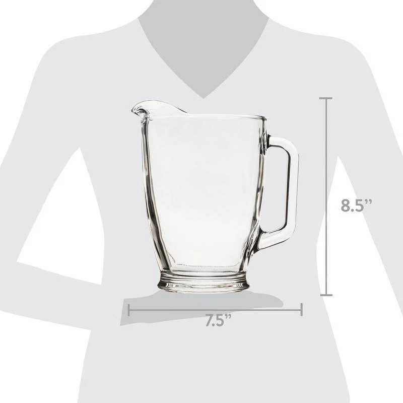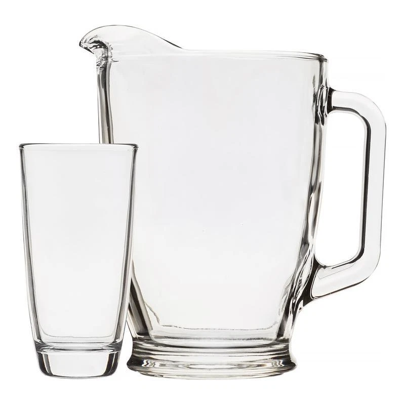 Featuring six tall cooler glasses and a generously-sized glass drink pitcher, this set is great for pouring, serving, and refilling your favorite beverages. Perfect for summer afternoons on the patio or entertaining friends and family, this pitcher set is made from clear glass in a clean and simple style. Use as a stand-alone serving set, or pair with your existing glassware and dinnerware for a relaxed, casual look. Set includes six 15. 8-oz. cooler glasses and one 67. 8-oz. drink pitcher Tall drinking glasses hold water, iced tea, soda, and more Use a pitcher to serve water, iced tea, lemonade, or fruit punch Beautiful, clear glass construction Tall, straight sides balanced by sturdy, clear bases The pitcher has a glass handle and curved pouring lip The water pitcher holds enough for multiple servings Good for everyday use as well as entertaining Classic design complements any table setting Use for cold beverages Pitcher measures 8. 6" H x 5. 75" diameter; cooler glasses measure 6. 2" H x 3. 2" diameter Dishwasher safe for easy cleanup Imported