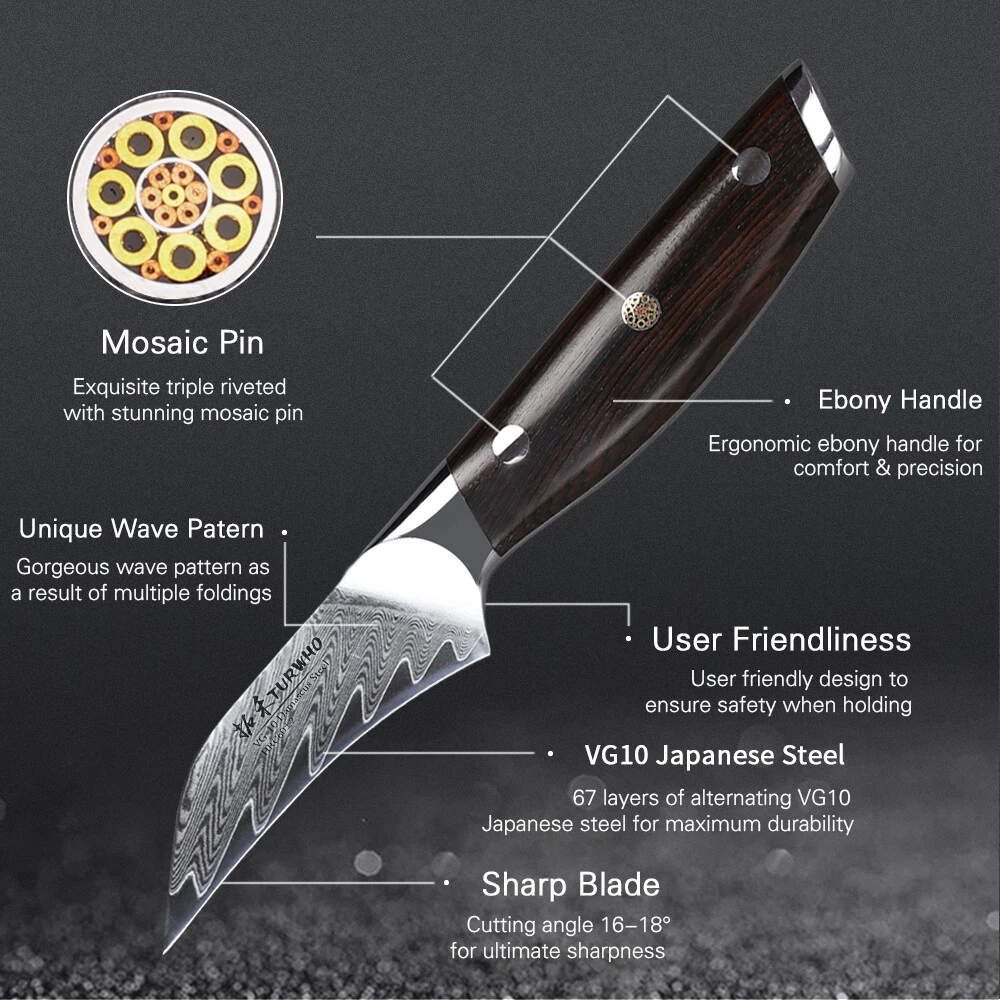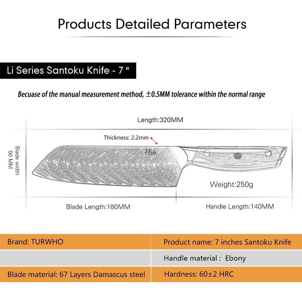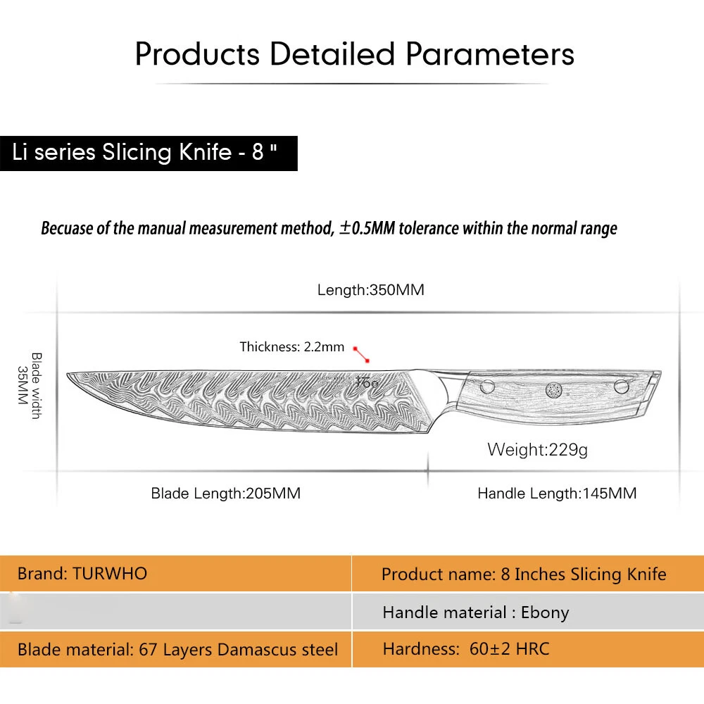 Feature:This kitchen knife set are made of high quality Japanese 67-layer Damascus steel and treated with 60HRC vacuum heat treatment and liquid nitrogen cooling. The Rockwell hardness of the cutting core is 60+. The cutting edge is 16-18 degrees, which means the blade is super sharp. Compared with similar products at this price, it has outstanding performance advantages.Exquisite appearance: beautiful and impressive fish bone pattern. Every time you pick it up, you can't help but taking cooking seriously. AND remember? Serious men are always handsome. Then don’t forget to wipe your chef knife after using, to make a perfect finish to your cooking.The chef Knife are one of the most useful and versatile designs available, which you can... DAMASCUS KNIVES 7x TURWHO Chef Knife Damascus Steel Santoku Kitchen Knife Block Set With Ebony Handle Feature: This kitchen knife set are made of high quality Japanese 67-layer Damascus steel and treated with 60HRC vacuum heat treatment and liquid nitrogen cooling. The Rockwell hardness of the cutting core is 60+. The cutting edge is 16-18 degrees, which means the blade is super sharp. Compared with similar products at this price, it has outstanding performance advantages. Exquisite appearance: beautiful and impressive fish bone pattern. Every time you pick it up, you can't help but taking cooking seriously. AND remember? Serious men are always handsome. Then don’t forget to wipe your chef knife after using, to make a perfect finish to your cooking. The chef Knife are one of the most useful and versatile designs available, which you can use to chop, slice, dice and mince all types of vegetables, fruits, meats, bread and fish. This chef knife will be your most valuable player, no matter what type you pick. So choosing an excellent chef knife is especially important. Design Characteristics: Ergonomic ebony wood handle. The shade of handle is designed based on the human engineering. This can lessen your tiredness, numbness, and soreness even if you grasp it for a long time. EASY CARE:All knives store safely In the acacia wood knife block. Simple appearance can decorate your kitchen without taking up space and reduce knife contact with air and risk of rusting.It is indispensable gift for Christmas parties. TURWHO Trust: We promise a superior product that will give you a lifetime of exemplary service, try it risk free, we know you'll love it. Specification: Brand: TURWHO Blade Material: Japanese VG10 67-layer Damascus Steel Handle Material: Ebony Handle Color: Black Cutting edge: 16-18 degrees Food Compatibility: Universal Manufacturer Warranty: Lifetime Weight: 4.54KG (including box) Package included: 1x TURWHO 3.5-inch Paring Knife 1x TURWHO 6.5-inch Boning Knife 1x TURWHO 7-inch Santoku knife 1x TURWHO 8-inch Slicing Knife 1x TURWHO 8.2-inch Chef Knife 1x TURWHO Multi-Purpose Kitchen Scissors 1x TURWHO Acacia Wood Storage Block Holder 1x TURWHO Premium Package Gift Box 1x TURWHO Cleaning Cloth 1x TURWHO Operation Instructions Item Specifics Brand TURWHO Set Includes Chef's Knife Type Chef's Knife Food Compatibility Universal Material Japanese VG10 Damascus Steel Cutting edge 16-18 degrees Color Black MPN US112468 Blade Edge Straight Handle Material Ebony Handle Features Well Balance, VG10 Damascus Steel, Very Sharp Number of Items in Set 7 Custom Bundle Yes Manufacturer Warranty Lifetime Bundle Description 5x Knife, 1x Shears, 1x Knife Block In Gift Box Making Method Hot Air Room Kitchen Blade Length 3.5in, 6.5in, 7in, 8in, 8.2in Block Holder Material Acacia Wood Payment All purchases will go through eBay secured checkout to ensure that your order is processed without any delays. After you have made your purchase you can either click on 'Pay now' or follow the instructions in an automated email that you will receive shortly after your purchase. During the checkout, you can make an immediate payment by PayPal account, MasterCard, Visa or select an alternative method of payment, and receive the necessary payment details. Please note: If you have already marked payment as sent But actually not paid, then you MUST mark as payment not sent otherwise the PAY NOW button will not be available. Shipping 1.all orders will be Dispatched within 2 working days after payment. 2.orders are not processed on weekends or public holidays. 3.usually takes 3-6 business days to most US destinations. 4.Your patience would be much appreciated. 5.all items will be checked carefully and packaging well before send out. 6.All orders are including the tracking number. Any questions, please feel free to contact us. Returns Refund or replacement request is available only the requests within 60 days after parcel received & return the item as the same condition as received. Please contact us to request a return authorization. Your name, auction number, and reason for return should be included in the email. All items returned must contain all original packaging materials. Please repack the item carefully. Item returned will be tested and a new replacement will be shipped to the buyer immediately when found defective. In the event that a suitable replacement is not available then a refund will be issued. If the item is found non-defective and buyer just don't like it, we will still make you a full refund, but the return shipping fee at buyer's expense. All item return must have a RMA number, Please contact us to request a return detail address and the RMA number, this can help us identify return items accurate. Buyer is responsible for additional shipping costs for items that are returned refused or undeliverable. We do not accept any returns without an authorization number on the box or label it is being returned in. Contact Us We care about our valued buyers, if you have any questions, our Customer Service will be very glad to help you. For more information, please contact us through ebay message system. All questions would be answered within 48 hours. DAMASCUS KNIVES DESCRIPTION PAYME
