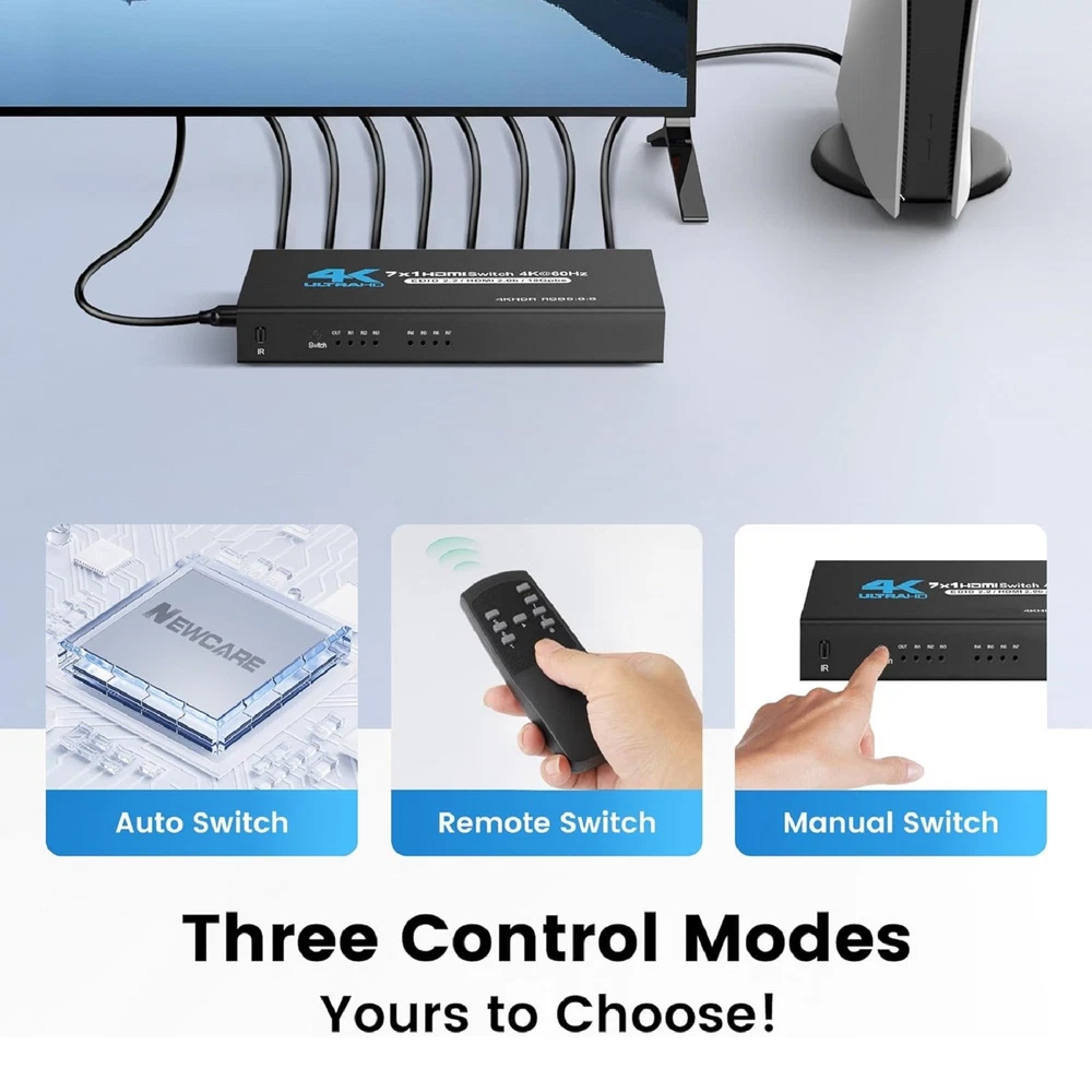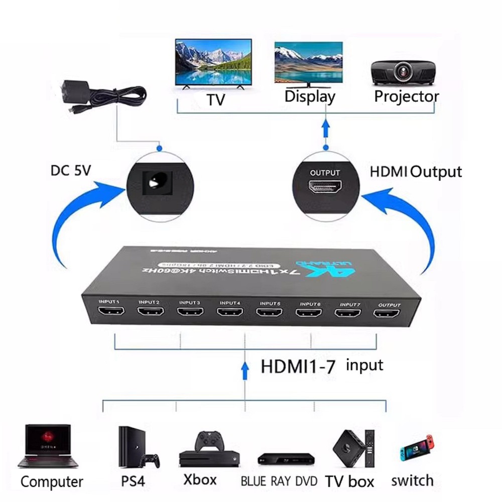 Product Description 7-Port HDMI Switch 2.0 4K@60Hz 7x1 HDMI 2.0 Switcher With IR Remote Support HDR 7 Port HDMI2.0 Switcher with IR Remote 4K@60Hz HDMI 2.0 7x1 Switch 7 in 1 out Switch Support HDR Specifications: HDMI Version: HDMI2.0b, HDCP2.2 HDMI Resolution up to 4K60Hz Supports resolution: 480P, 720P, 1080P, 1080p 3D, 4K30hz Support Video Format: 12 bit deep color Support Audio Format: DTS-HD/Dolby Max Bandwidth: 600MHZ Max Baud Rate: 18.5Gbps Power supply: DC5V1A Material: Iron Color: Black Features: 1. 7 In 1 Out 2.0 Switch: HDMI 7 in 1 Switch connects up to 7 HDMI source components to one HD Display, solving your multiple HDMI devices issue, Seamlessly switch between games, TV, desktop, creating a superb picture quality and seamless sound. NO lag, NO flash or drop in resolution 2. 4K High Resolution at 60Hz: 7 Port HDMI switch supports up to 4K@60Hz resolution, compatible with lower resolution: 4k@30Hz/Full HD 1080P/Full 3D 1080P/720P and more, It allows you to enjoy the crystal-clear display with incredible fluency while freely switching between the four devices 3. Auto-Switch with Remote Control: 4K HDMI Switch will automatically skip to the next port with a viable signal input; will automatically skip to the most recently inserted HDMI signal source, Manual switching can be done by IR remote 4. Wide Compatibility: HDMI switch For box works with all HDMI-integrated devices, such as for Fire TV, for Apple TV, for STB/ for IPTV, for LCD TV, for DVD Player, for Blu-Ray players, for PS3/ for PS4, for Xbox 360, for Roku and other HDMI capable devices. It supports DTS, DTS-HD, and Dolby compressed audios Package Included: 1 * HDMI Switch 7x1 1 * Remote Control(Not included 2*AAA batteries) 1 * Power Cable 1 * Power adapter 1 * User Manual Shipping Returns Contact Us Payment 1. Items sent from US warehouse. 2.Receiving time = Processing time + Shipping time 3. Processing Time: Around 1-2 business Days 4. Shipping Time: 3-5 business day it may have a little delay during some holiday (such as Christmas),any problem ,please feel free to contact 1. 30 days warranty from the purchased date. Please contact us via email before returning the defective item. 2.Our warranty does not extended to any product that are physically damaged or that are not under normal operating conditions as result of misuse or improper installation on the buyer/user's part. 3.Return items should include the original packaging and all accessories. buyers MUST contact us for the returning address. 4.In all cases, buyers pay shipping fees at their own cost to return products for exchange or refund. We will be responsible for the postage of replacements. Refund will be made upon receipt of the returned item. Pls contact us if you have any problems,we will try our best to solve for you We accept all verified payment from eBay. Shipping 1. Items sent from US warehouse. 2.Receiving time = Processing time + Shipping time 3. Processing Time: Around 1-2 business Days 4. Shipping Time: 3-5 business day it may have a little delay during some holiday (such as Christmas),any problem ,please feel free to contact Returns 1. 30 days warranty from the purchased date. Please contact us via email before returning the defective item. 2.Our warranty does not extended to any product that are physically damaged or that are not under normal operating conditions as result of misuse or improper installation on the buyer/user's part. 3.Return items should include the original packaging and all accessories. buyers MUST contact us for the returning address. 4.In all cases, buyers pay shipping fees at their own cost to return products for exchange or refund. We will be responsible for the postage of replacements. Refund will be made upon receipt of the returned item. Contact Us Pls contact us if you have any problems,we will try our best to solve for you Payment We accept all verified payment from eBay. You may also like 22.5W Fast Charging 8 x 18650 Battery DIY Detachable Power Bank Shell Case 15.14 USD 16.82 USD 10% off 2x 3-AAA Battery Holder Cylindrical Case Plastic For Flashlight Round Circular 8.19 USD 9.1 USD 10% off 4* 20x8mm Aluminum Isolation Feet Stand For CD Turntable Radio AMP Amplifier xx 11.57 USD 12.86 USD 10% off OEM AXV417WHP New Pool Cleaner Set Fit For Hayward Navigator Pool Vac Ultra Pool 19.06 USD 21.18 USD 10% off 2pcs Analog Stick Joystick Replacement For PS5 Dualshock Wireless Controller b 7.91 USD 8.79 USD 10% off 2* Ear Pads Cushion For ASTRO Gaming A50 Gen3 Gen4 Wireless Headset Accessories 13.09 USD 14.54 USD 10% off powered by