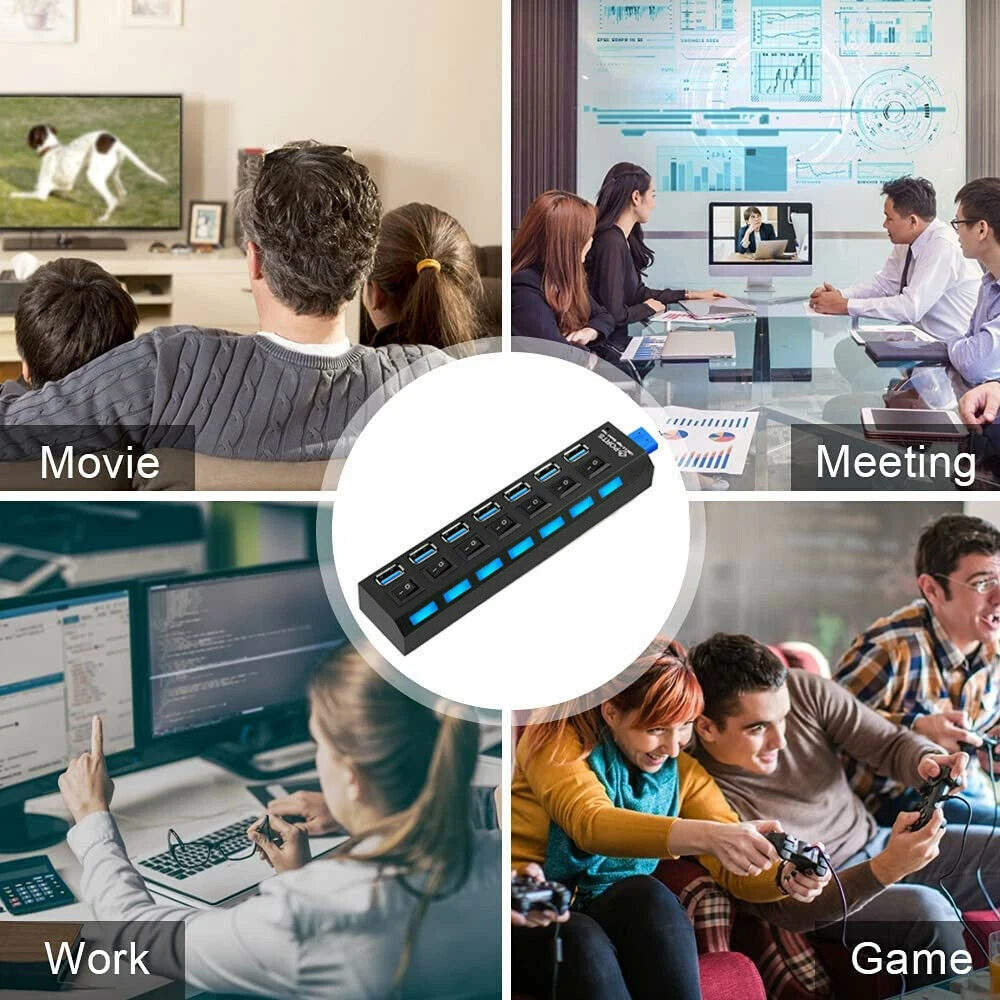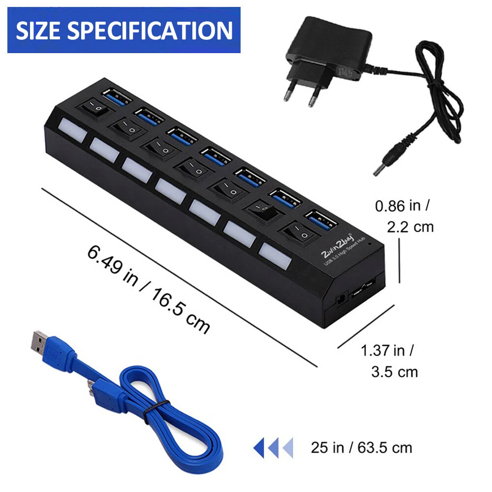 eBay 7 Port USB 3.0 Hub Splitter Adapter High Speed Extension For PC Laptop Mac Desktop USB 3.0 Hub(Support charging) Features: Hot plug & play USB device Fully compatible with USB specification version 3.0 LED indicator for power status ON/OFF switches activate or deactivate individual ports Designed with 7-port this compact USB3.0 high-speed hub is small enough for travel, and cable enough to meet your connectivity needs Cable: About 25 in Date Transfer Rate: Up to 5Gbps Compatible: WindowsXP /Vista/7 and MAC OS 9.1 or higher Size: 6.5x1.4x0.8in (L×W×H) Compliant with USB version: USB1.0 reaches 1.5Mbps (low speed). USB1.1 up to 12Mbps (full speed). USB2.0 reaches 480Mbps (high speed). USB3.0 reaches 5Gbps (speeding). 5gbps speed corresponding usb3.0 device Package includes: 1 x USB 3.0 7 Ports Hub OR 1 x USB 3.0 7 Ports Hub+1 x Po wer OR 1 x Power Adapter CONTACT US PAYMENT METHODS SHIPPING & HANDLING RETURNS / WARRANTY CONTACT US Contact Us We have always been trying to provide the best service and reliable products for every customer, however, accident may happen sometimes, please contact us to resolve any issue before leaving a negative feedback. Any question please click to contact us! Thanks for your visiting and purchasing! payment methods Payment Methods ● We only accept Paypal. Credit card payment can be made via Paypal. ● If you are paying through PayPal using eCheck, your item can be shipped only after eCheck has cleared ( it may take 5-10 working days to be cleared). ● All payments are expected within 7 days after the last winning auction is closed. A non-payment dispute will be opened if full payment is not received. ● Cancelling Your Order: If you happen to change your mind after placed the order, please send us the email to cancel it, we will do our best to help you. Shipping & Handling Shipping & Handling 1. W e will ship to worldwide from USA via USPS, UPS . 2. Ite m will be packed safely and protected by bubble sheets . All t he parcels have tracking number. 3. Items are generally shipped out within 24-48 hours after your payment has been cleared (Sat. & Sun. & Public holiday excluded.). 4. We only ship to the confirmed address provided by ebay. Before you pay, please make sure your address matches the address you would like us to ship to. 5. If you need the item urgently, please contact us for detail before purchase. ● UNITED STATES SHIPPING We ship our package with USPS first Class, O n av erage USPS first c la ss ta kes 2 -7 days for delivery. ● W ORLD WIDE SH I PPING We ship by USPS Mail, generally take 7-15 business days for delivery. Note: If you don't receive the items after 15 days, please contact me as soon as you can. I will do my best to resolve the problems. Returns / Warranty Warranty and Return : 60 Days Money Back Guarantee Return Policy for most products We offer a 100% satisfaction guarantee. In case you won't be 100% satisfied with your purchase, simply send an eBay Message to our customer service team . • You changed your mind and wish to request a return. • Your product was damaged during transit. • You are not satisfied with any product that you have purchased. • All items must be returned in exact condition as sent. All returns must be directed through Customer Service. Please do not return or post items before obtaining instructions from us. If you do, there is a risk that your returned item may not be identifiable and accepted. Please contact our customer service team firstly. SALES & EVENTS On May 3, 2024 at 06:20:54 PDT, seller added the following information: