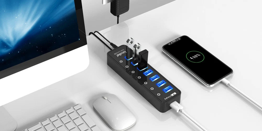 7-Port USB 3.0 Data Hub with Smart Charging and Individual Switch Control Instant Expansion and SuperSpeed Syncing - Instantly transform a single USB 3.0 port into 7 external USB 3.0 data ports, perfect for connecting keyboards, mice, printers, hard drives, and more. Enjoy blazing data syncing speeds of up to 5Gbps. Smart Charging Port - In addition to the 7 SuperSpeed USB 3.0 ports, this hub includes a dedicated charging port that charges your iPhone and iPad faster and safer. With the included 5V/4A power adapter, it delivers charging power up to 2.4A. Simple Switch Control - Each USB port is equipped with an individual on-off switch, allowing you to control each connection effortlessly without the need to unplug devices. This feature helps organize your workspace efficiently. Maximum Compatibility and Performance - Fully compatible with Windows 10, 8.1, 8, 7, Vista, XP, Mac OS X (10.x or above), Linux and above. Enjoy a hassle-free experience with plug-and-play functionality; no drivers required and supports hot swapping. In the Box - Includes a 7-port USB 3.0 hub (with a 100cm USB hub cord), a 5V/4A Power Adapter (with a 120cm electrical cord), and a Quick Setup Guide. Comes with an 18-Month Warranty for peace of mind.