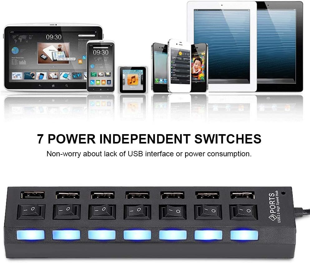 This USB hub is a game-changer for my workspace! The 7 ports with individual on/off switches make it super convenient to manage multiple devices without unplugging. The high-speed data transfer works flawlessly, and the sturdy build feels durable. Perfect for expanding connectivity on my laptop—no more struggling with limited USB slots. The included AC adapter ensures stable power, though it’s only for data, not charging. Works great across different OS versions. A must-have for anyone needing extra USB ports!