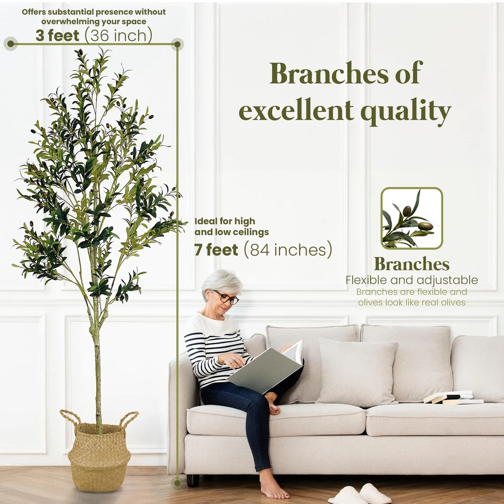 Enhaced Indoor Oasis - Elevate your home decor with our 7 Feet Tall Plant, blending seamlessly into any interior with its lifelike appearance and natural color, perfect for living room or office spaces. Transform any corner into a vibrant indoor plant haven effortlessly. Seamless Integration - Ideal as a sophisticated focal point, this Fake Olive Tree harmonizes with any home indoor garden, delivering a touch of elegance and tranquility to your personal or professional environment. Its stature makes it an ideal floor plant, enhancing the ambiance with its natural beauty. Exclusive Bonus - Receive a complimentary high-quality wicker olive tree pot with each purchase, valued at $15 plus. Perfect as a pot for olive tree indoor, enhancing your setup with a stylish, rustic touch that complements any decor. Effortless Elegance - Our artificial trees for home decor indoor requires no maintenance, freeing you from watering and sun exposure worries, while providing a refreshing, lifelike addition to your decor collection. Enjoy the timeless beauty of an artificial tree without any upkeep. Eco-Conscious Decor - Crafted with environmental friendliness in mind, our tall fake plant offers high simulation leaves and a safe, non-toxic design, ensuring a sustainable and safe enhancement to your indoor sanctuary. Add a touch of green with a faux tree that’s as environmentally conscious as it is beautiful.