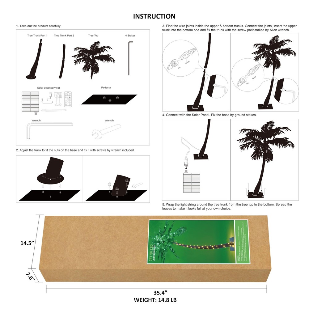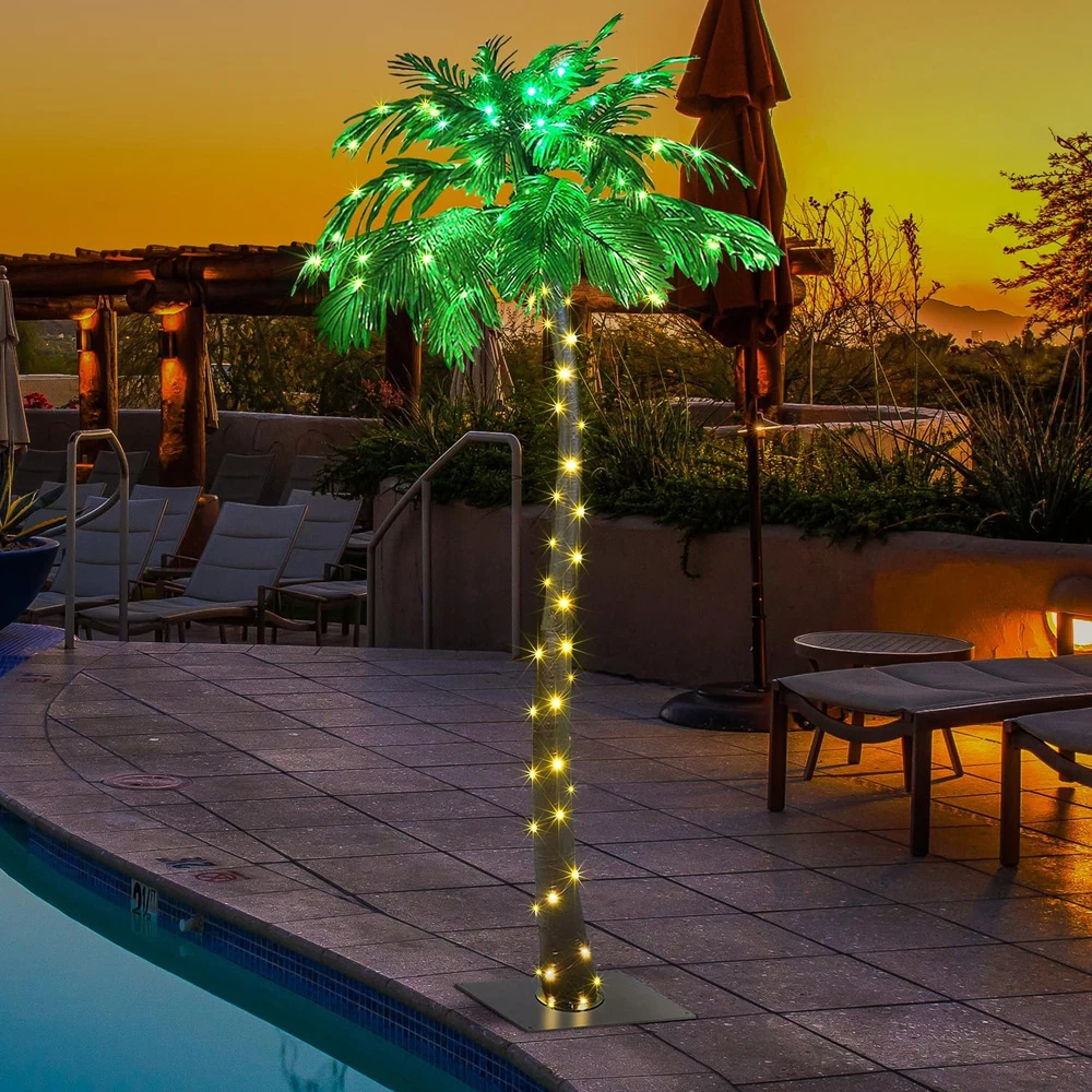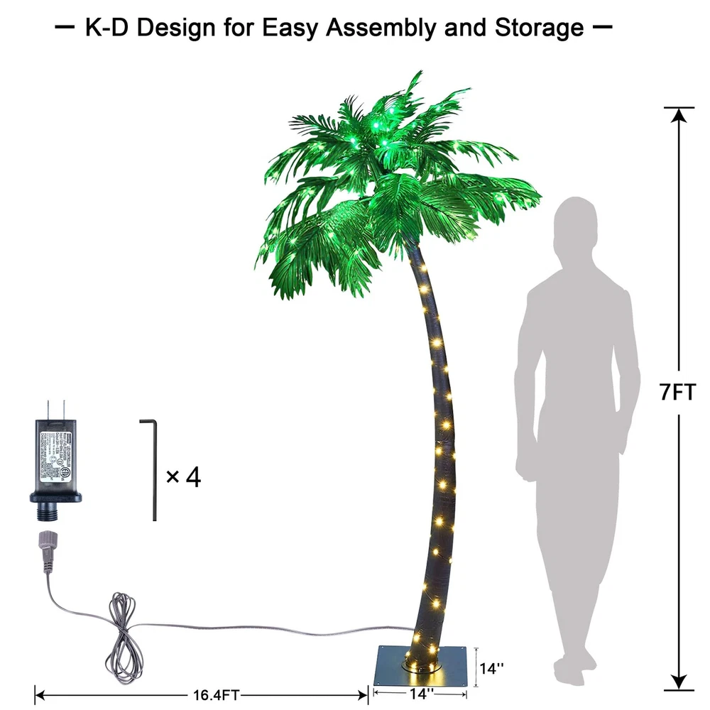 Lifelike Design: The tree features a metal trunk designed to mimic the growth characteristics of palm trees, providing a lifelike appearance. The gradual curve from large to small creates a natural and realistic look. Green LED Lights: The tree is adorned with 96 LED green lights placed under the leaves. This lighting arrangement creates a vibrant and enchanting glow, adding a touch of magic to any space. Mini Copper LED String Lights: The trunk of the tree is embellished with a string of 56L mini copper LED lights. These lights add a sparkling effect to the trunk, enhancing the overall visual appeal. Unique Curved Design and Natural Fabric Leaves: The tree's distinctive curved design adds an element of elegance to its appearance. The natural fabric leaves contribute to the tree's authenticity and create an attractive visual impact. Sturdy Metal Trunk and Base: The tree features a metal trunk and a heavy-duty base. The sturdy construction ensures stability and durability, making it more reliable than trees with plastic bases. Additionally, four ground stakes are provided to secure the tree firmly in place. Versatile Decorative Application: This tree is not limited to a specific season. It can be used across seasons to bring a sense of Hawaiian happiness or serve as a charming addition to your Christmas decorations. Its versatility makes it suitable for various occasions and themes.