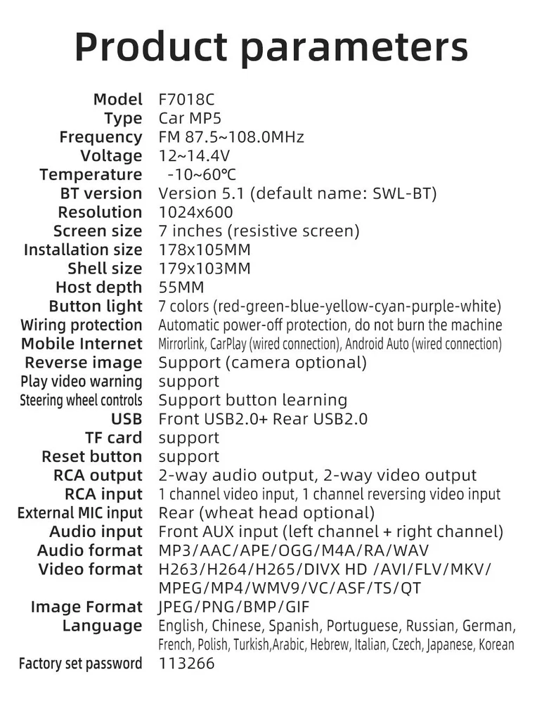 Home Payment Shipping About us Contact us Store Categories Store Categories Other Details 7" Double 2 DIN Car MP5 Player Bluetooth Touch Screen Stereo Radio Wired Carplay+Android Auto Product Introduction: Type: On board MP5 Radio frequency: FM 87.5~108.0MHz (can switch radio frequencies in China, America 1, America 2, Japan, Russia, Middle East, and Europe regions) Output power: 60Wx4 Working voltage: 12-14.4V Working temperature: -10~60 ℃ Bluetooth version: 5.1 version (default name: SWL-BT) Display resolution: 1024x600 Screen size: 7 inches Installation size: 178x105MM Single unit weight: 0.617KG Full container net weight: 12.34KG Number of full containers: 20 units Audio format: MP3/AAC/APE/OGG/M4A/RA/WAV Video format: H263/H264/H265/DIVX HD/AVI/FLV/MKV/MPEG/MP4/WMV9/VC/ASF/TS/QT Image format: JPEG/PNG/BMP/GIF Language parameters: English, Chinese, Spanish, Portuguese, Russian, German, French, Polish language, Türkiye, Arabic, Hebrew language, Italian, Czech language, Japanese, Korean Accessories: 1. Host 2. Instructions 3. Power cord 4. Remote control Shipping Policy Payment Method Returns Policy Shipping Policy Payment Method Returns Policy Home Payment Shipping About us Contact us Home Payment Shipping About us Contact us Store Categories Store Categories Other Details 7" Double 2 DIN Car MP5 Player Bluetooth Touch Screen Stereo Radio Wired Carplay+Android Auto Product Introduction: Type: On board MP5 Radio frequency: FM 87.5~108.0MHz (can switch radio frequencies in China, America 1, America 2, Japan, Russia, Middle East, and Europe regions) Output power: 60Wx4 Working voltage: 12-14.4V Working temperature: -10~60 ℃ Bluetooth version: 5.1 version (default name: SWL-BT) Display resolution: 1024x600 Screen size: 7 inches Installation size: 178x105MM Single unit weight: 0.617KG Full container net weight: 12.34KG Number of full containers: 20 units Audio format: MP3/AAC/APE/OGG/M4A/RA/WAV Video format: H263/H264/H265/DIVX HD/AVI/FLV/MKV/MPEG/MP4/WMV9/VC/ASF/TS/QT Image format: JPEG/PNG/BMP/GIF Language parameters: English, Chinese, Spanish, Portuguese, Russian, German, French, Polish language, Türkiye, Arabic, Hebrew language, Italian, Czech language, Japanese, Korean Accessories: 1. Host 2. Instructions 3. Power cord 4. Remote control Shipping Policy Payment Method Returns Policy Shipping Policy All items will be checked before packing. All items are new and of high quality. Item will be shipped within 1 business days upon receipt of payment, excluding weekends and public holidays. If to USA,we will ship your order by USPS,it will take about 2-6 working days to you,and you can track it on line. If to other country,we will ship your order by China Post or Singapore Registered Air Mail,it will take about 14-21 working days to you,you aslo can track it on line. Delivery time is about 14-28 business days and it may take up to 8 weeks. Payment Method We accept payment by PayPal ! Payment should be completed within 5 days after buyer places the order,or else an unpaid case will be opened in order to cancel the transaction. If you can not pay in time, please contact us. e-check from PayPal will only be processed once the payment clears. All of the items will be shipped to buyer's EBAY address,please confirm your address on Ebay before you buy.Your order will be usually shipped out the same or next business days once the payment is made and cleared. Returns Policy 30-day Warranty with Exchange for defective, malfunctioned, incorrect or parts-missing items. Please notify us and return the item with all parts and accessories packed and marked "FOR EXCHANGE" within 14 days of receipt. If defective, malfunctioned or parts-missing items are no longer available, a refund may be issued. Home Payment Shipping About us Contact us