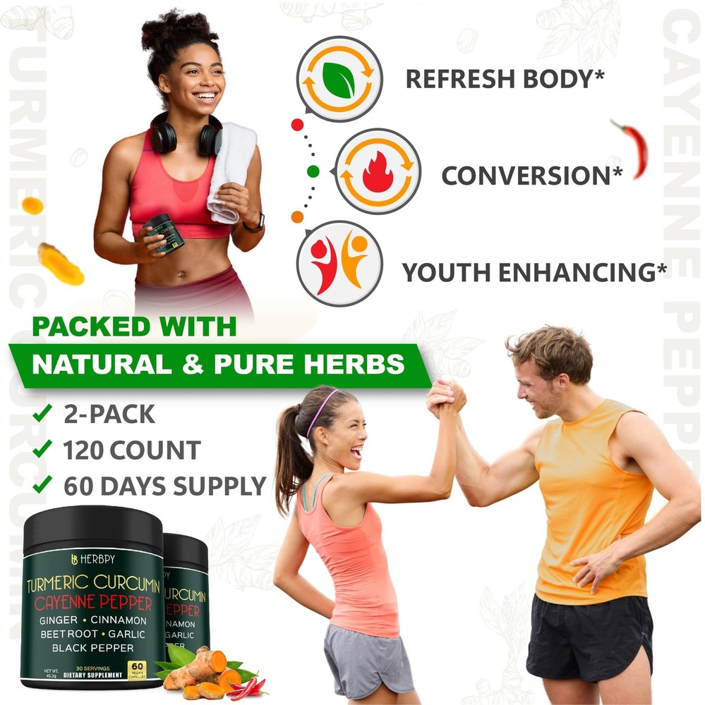 7in1 Turmeric and Cayenne Pepper Supplement - Digestion, Immune, Brain & Heart Health Support with Ceylon, Ginger, Garlic, Beetroot - 2Pack60 - Buy Now with Fast Shipping! 7in1 Turmeric and Cayenne Pepper Supplement - Digestion, Immune, Brain & Heart Health Support with Ceylon, Ginger, Garlic, Beetroot - 2Pack60 Product Details Brand: Herbpy Item Form: Capsule Manufacturer: HERBPY Item Package Quantity: 2 Package Information: Jar Package Dimensions : 5.43 x 5.12 x 2.56 inches; 7.05 ounces Date First Available : February 26, 2024 Manufacturer : HERBPY Country of Origin : India Best Sellers Rank: #80,349 in Health & Household (See Top 100 in Health & Household) #318 in Turmeric Herbal Supplements #318 in Turmeric Herbal Supplements Customer Reviews: 4.5 4.5 out of 5 stars 106 ratings Key Features ✅ 7-Herb Powerhouse: Turmeric & Cayenne Pepper with cinnamon, ginger root, beet root, garlic and black peppermade from pure herbs, gluten-free, non-GMO for premium natural health. Turmeric root supports digestion, vitality, and overall well-being.* Gifts from nature.* ✅ Digestive & Heart Health Support: Made from pure turmeric curcumin and cayenne pepper powder, this turmeric supplement naturally supports digestion and heart health with ginger and black pepper. Turmeric capsules support immunity for daily wellness.* ✅ Vegan-Friendly: Turmeric with black pepper supplement offers 60 quick-release turmeric pills in a 2-pack. Two turmeric curcumin with black pepper pills daily support natural health with a potent blend of turmeric extract, cayenne supplement, and more.* ✅ Expiration & Dosage: Turmeric and ginger supplement, encased in vegetable cellulose capsules, 2-year expiration. We recommend a serving of 2 turmeric curcumin supplement capsules daily, supplying a potent blend of 7 herbal ingredients, rigorously tested for purity and safety.* Product Description