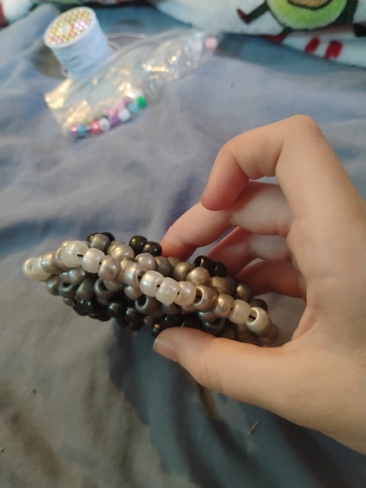 This cuff is absolutely stunning! The mix of pearl black, silver, and gray beads gives it such a cool, stylish look. It’s super comfortable to wear and perfect for raves, festivals, or just adding a fun touch to any outfit. The craftsmanship is great—durable yet lightweight. Love how it catches the light! A must-have for kandi lovers.