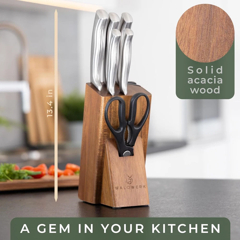 Product Description Knife Set - 7pcs Kitchen Knife Set with Block and Integrated Sharpener - Kitchen Knife Set - Knife Block Set - Kitchen Knifes - Knives Set for Kitchen - Knife Block - Knife Set with Block 🔪 NO CHEAP PLASTIC HANDLES - takes the greatest care on the materials used in its products. The stainless steel handles are durable and fit perfectly in your hand! 🔪 INTEGRATED KNIFE SHARPENER - Simply pull your knives through the knife sharpener 3-4 times if they lose their sharpness. This way your new kitchen knives always cut without compromise. 🔪 PRECIOUS MATERIALS - The acacia wood is a particularly blade-friendly support for your knives. In addition, the knife block with its elegant design is a piece of art in your kitchen. 🔪 ALL KNIVES READY TO HAND - You have all the important knives for every purpose at hand. You'll never have to look for knives while cooking or buy new knifes again. 🔪 MONEY BACK GUARANTEE - If you are not 100% satisfied with your knife set, we will immediately transfer the full amount back to your bank account for 60 days and without conditions. About Us We are a reputable seller with many years of experience selling on eBay. Our goal is to provide high-quality products and excellent customer service. Shipping Items will be shipped within 1-3 business days when we received payment. (Orders are not processed on weekends & holidays) Tracking information will be sent once item is shipped. Delivery time depends on destination and other factors Item is shipped to ebay address. Leaving correct address can minimize delay. For international shipping and shipping to Guam, Hawaii and Alaska, Please contact us before placing the order. International buyers please note: Import duties, taxes and charges are not included in the item price or shipping charges. These charges are buyer’s responsibility. We will try our best to reduce the risk of the custom duties. Local pick-up is unavailable at the moment. Contact Us We reply any email messages within 1 business / working days(off-duty at weekend). If you do not get a response from us, then please check your junk or spam mailbox. Our Business hours: Mon-Fri 9:00-18:00, UTC/GMT +8 hours. Please contact us either by clicking "contact seller" in the "purchase history" section or simply click "ask a question" at the bottom of this page. If you are unsatisfied with our item or service, please contact us before leaving any feedback. We are committed to resolve all issues in a friendly and satisfactory manner.