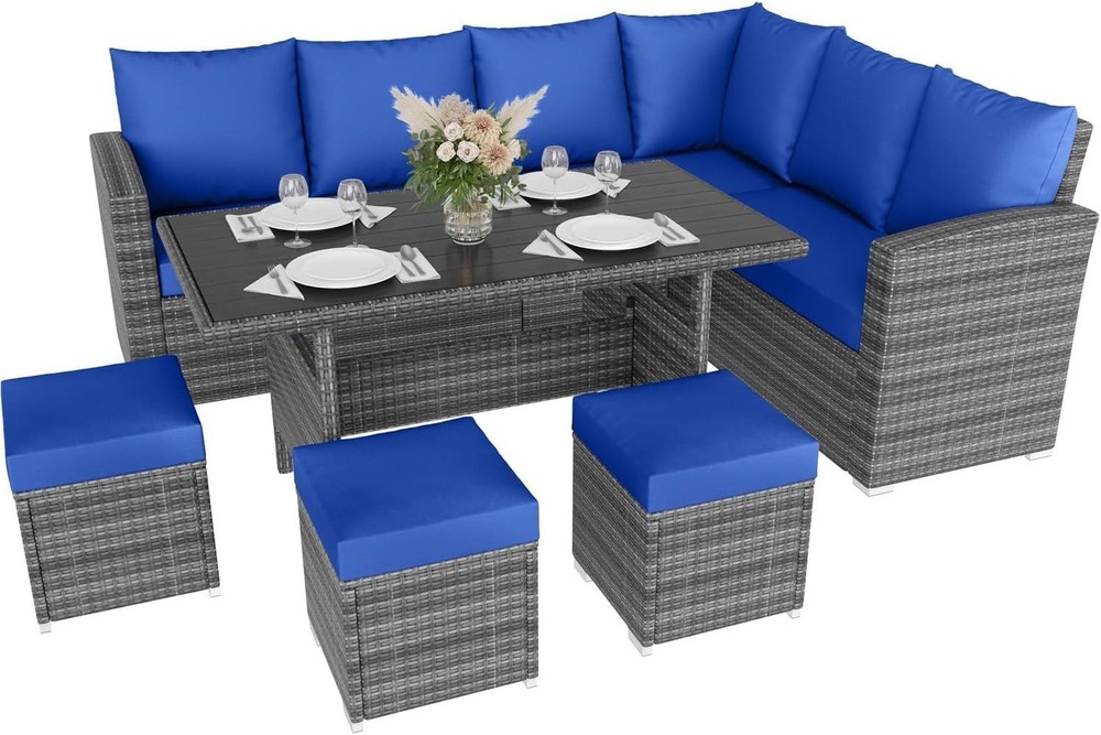 Cushions Included: Yes Style: Modern Table Shape: Rectangle Cushion Color: Blue Set Includes: Cushions, Table, Chairs, Seat Cushion/Pad Assembly Required: Yes Department: Adults Brand: Unbranded gtin13: 629831887316 Assembly Status: Part Assembled Seating Capacity: Up to 8 Type: Sofa Set Number of Items in Set: Seven-Piece Material: Rattan UPC: 629831887316