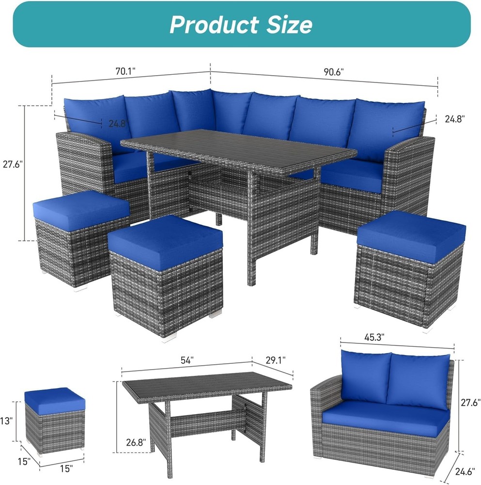 7pcs Patio Furniture Set Outdoor Wicker Conversation w/ Table Rattan Patio Chair Versatile Outdoor Furniture This patio furniture set includes a combination of 3 multi-person sofas, 1 tea table, and 3 ottoman, offering a flexible setup to suit various occasions. The modular design allows you to easily reconfigure the pieces to meet your needs, whether you're hosting a gathering, enjoying a quiet evening with a book, or simply relaxing in your backyard. This adaptability makes the set a great addition to any outdoor space Elegant and Robust Construction The furniture set features a stylish design with grey rattan and blue cushions, creating a cohesive and sophisticated look. The rattan is skillfully woven, providing a refined, smooth finish that enhances the overall aesthetic. This construction ensures that the set remains resilient against water, cracking, and fading, maintaining its appearance and functionality over time Comfortable Cushions and Functional Table The cushions are thickened and filled with high-resilience, supportive materials to ensure comfort. With removable and washable seat covers that resist water and UV rays, the cushions are designed to withstand various weather conditions. The tabletop is made of 5mm tempered glass, offering a smooth and solid surface. The ottoman serves multiple purposes; it can be used as extra seating, a footrest, or even an additional table, depending on your arrangement Assembly and Sizing Information Assembly is required upon receiving the product. The dimensions of the assembled pieces are provided in the product images, allowing you to plan the placement in your space accordingly. Ensure you measure the intended area to accommodate the furniture set properly, making the assembly process straightforward and ensuring a perfect fit for your outdoor living area Packaging and Customer Support The furniture set will be delivered in 3 separate packages, which may arrive at different times. It's important to wait for 3 packages before starting the assembly. Detailed instructions are provided to guide you through the process. Should you encounter any issues or have questions, our customer support team is available to assist you Style Modern Table Shape Rectangle Department Adults Cushion Color Blue Seating Capacity Up to 8 Assembly Status Part Assembled Assembly Required Yes Number of Items in Set Seven-Piece Cushions Included Yes Set Includes Cushions, Table, Chairs, Seat Cushion/Pad Material Rattan Type Sofa Set Brand Unbranded