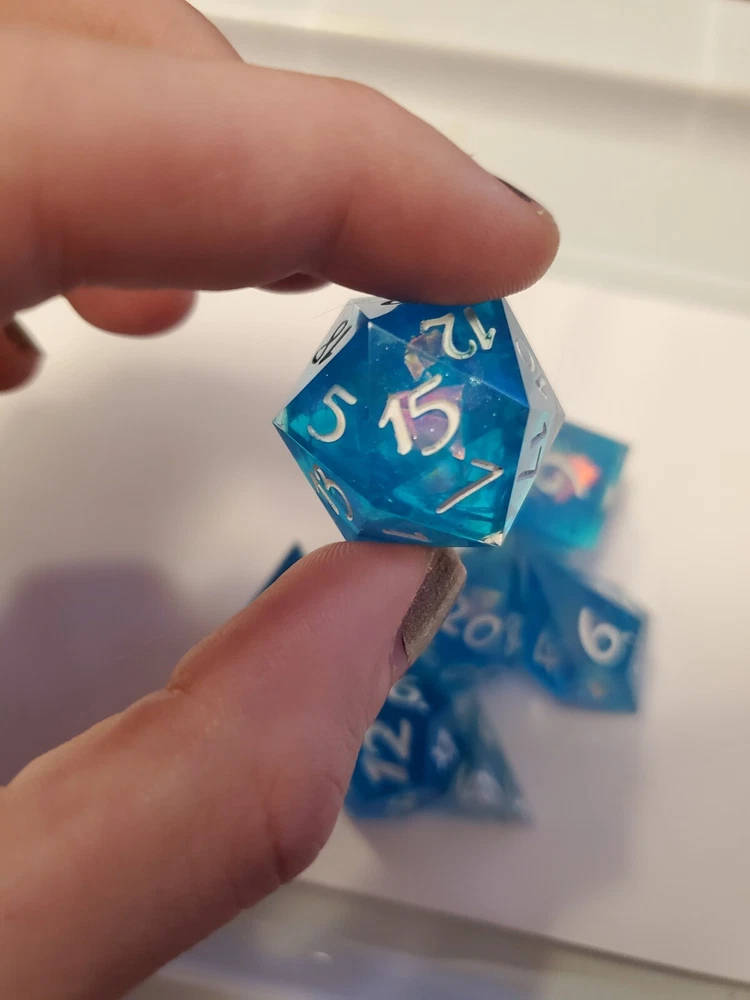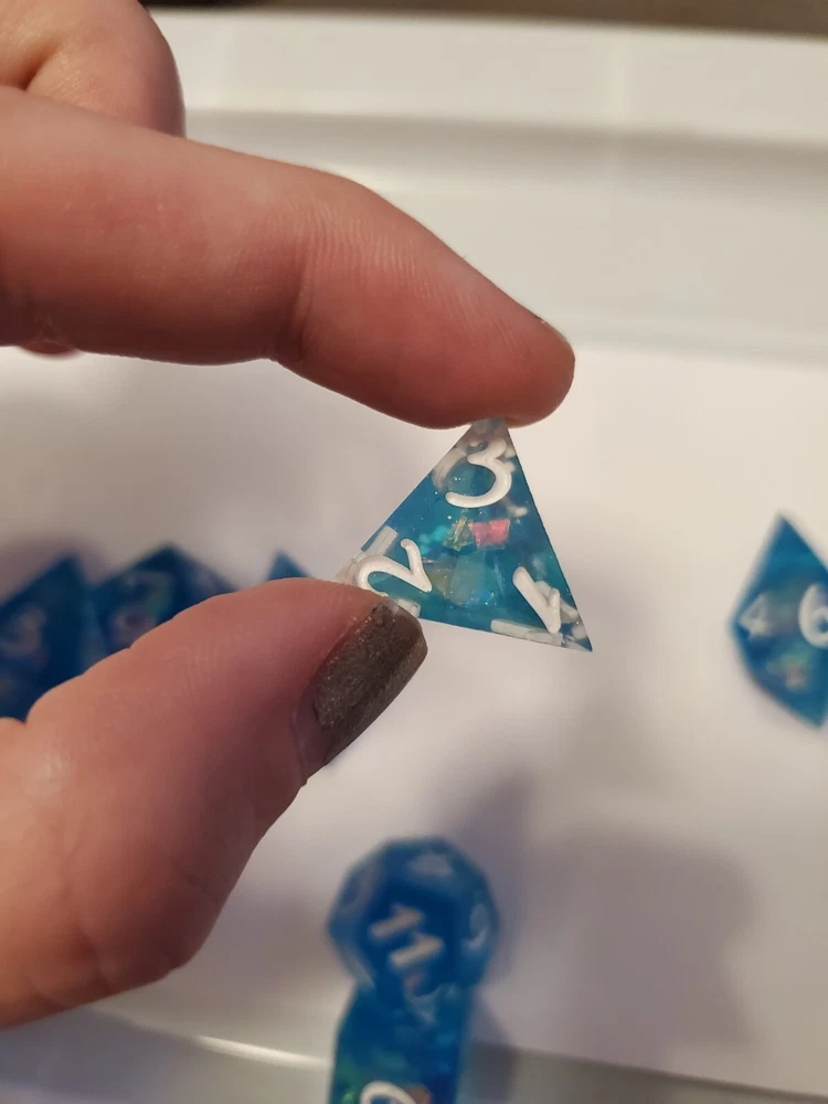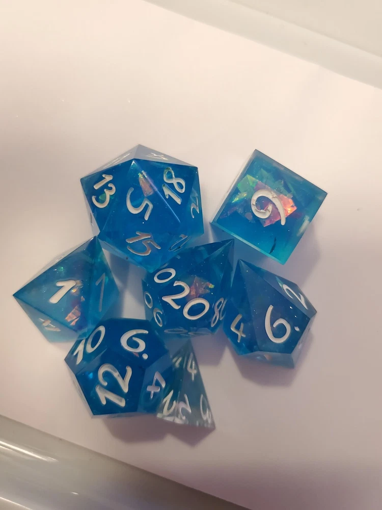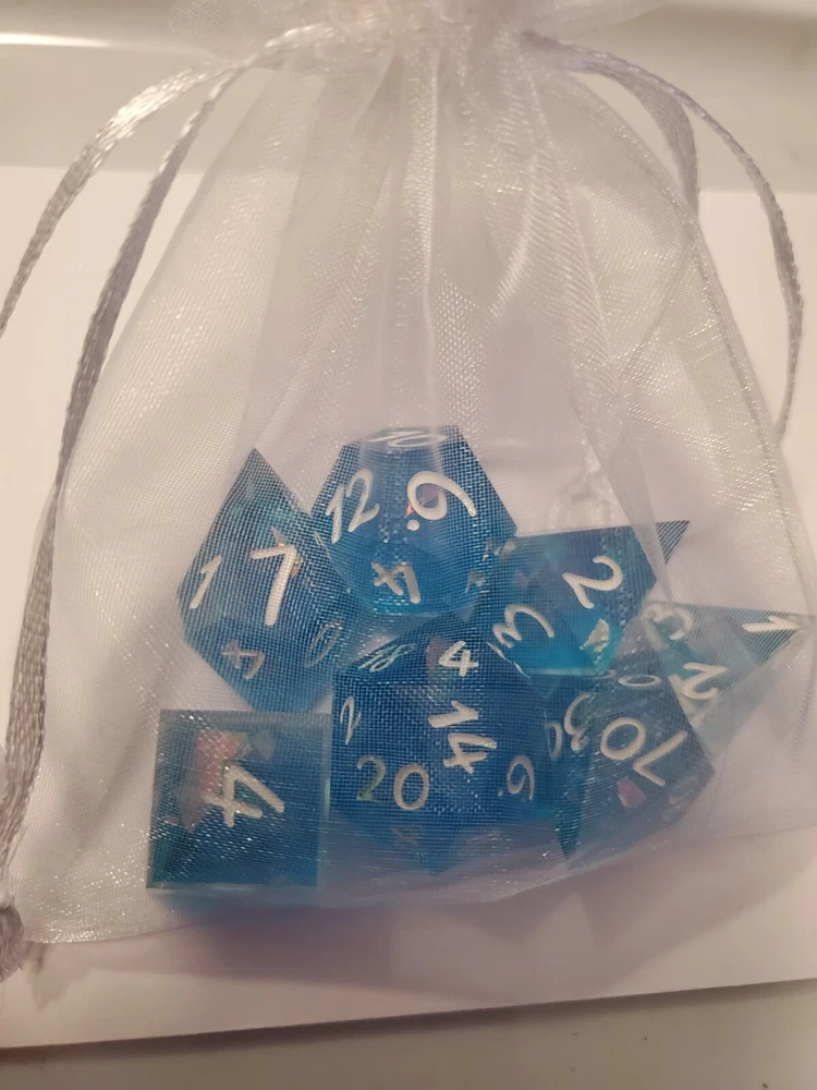 7pcs Set Of Handmade Resin Polyhedral DnD Gaming Dice: sea swirled dice with holographic confetti and metallic bright white colored numbers painted on visibly making the dice perfect for gaming of any sort. Properly weighted for play and obviously beautiful for display. Great gift for any DnD gamer or collector. Comes with a storage bag that's also great for transportation for those game nights at friend's houses!