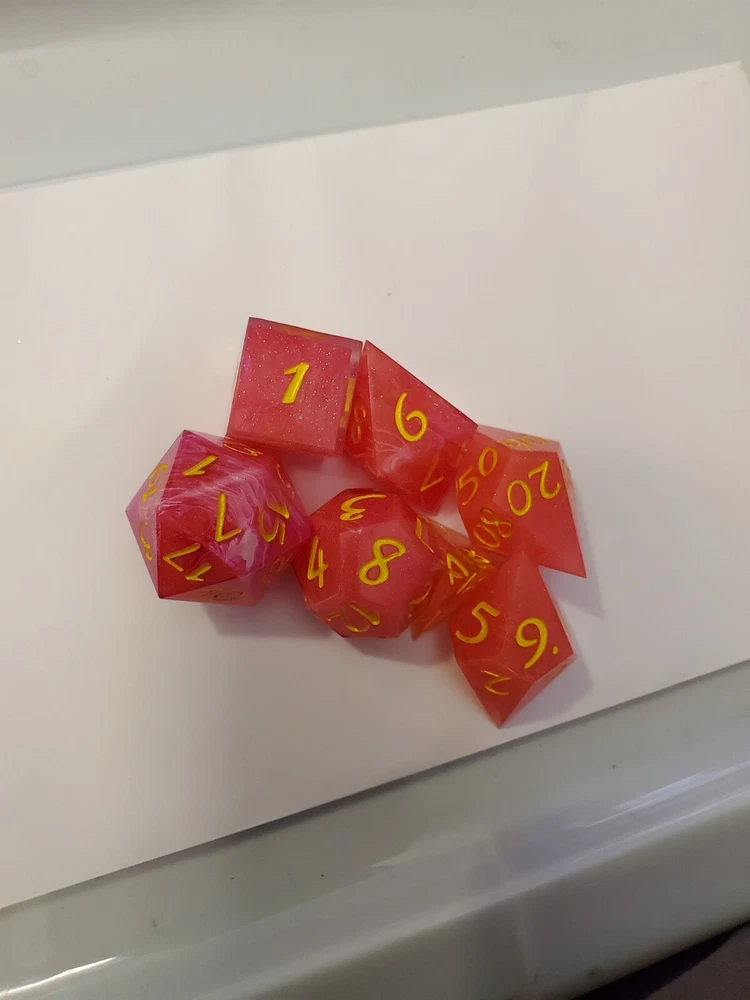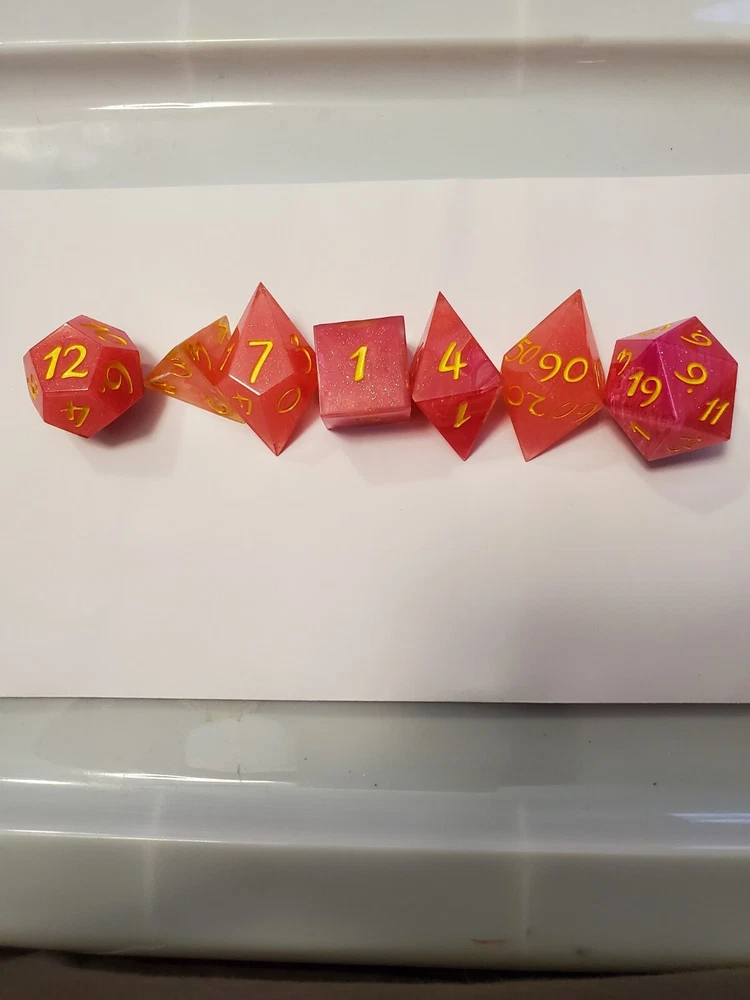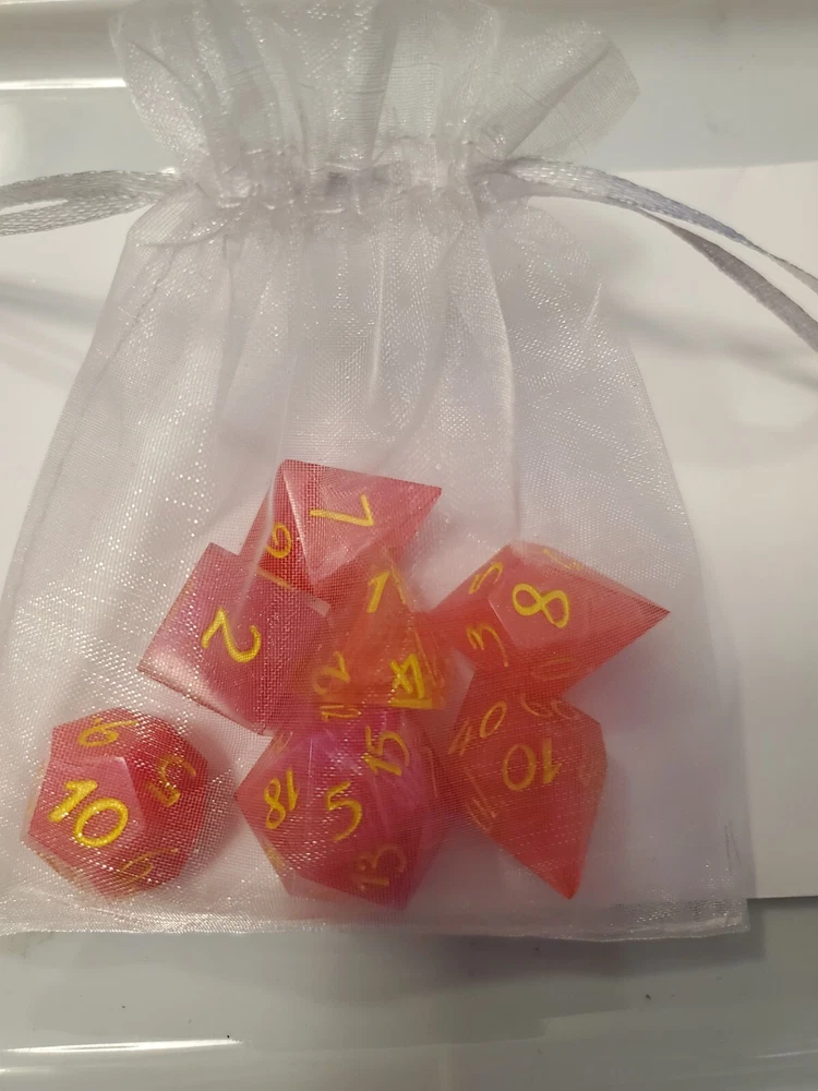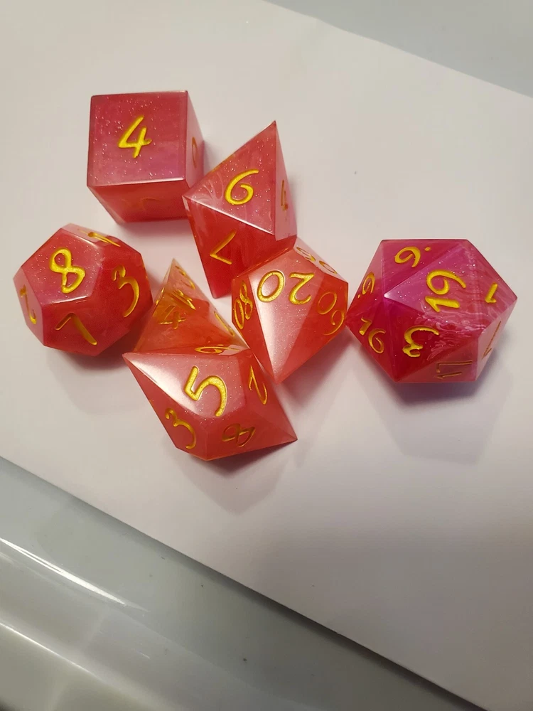 7pcs Set Of Handmade Resin Polyhedral DnD Gaming Dice: pink dice with a glittery and swirly inlay. Bright yellow metallic numbers painted on visibly making the dice look gorgeous and pulled straight from the fire of a phoenix, but prettier. Properly weighted for play and obviously beautiful for display. Great gift for any DnD gamer or collector. Comes with a storage bag that's also great for transportation for those game nights at friend's houses!
