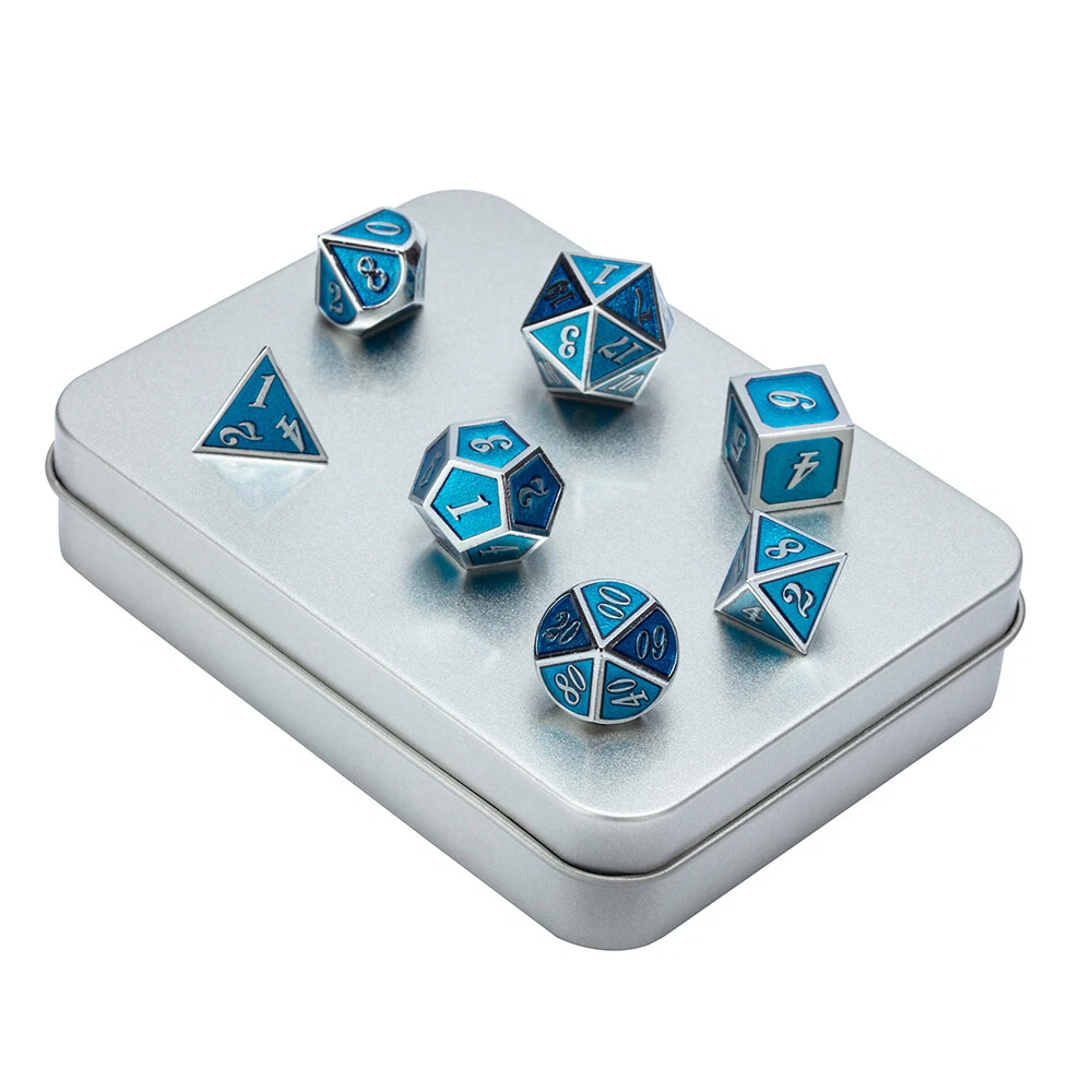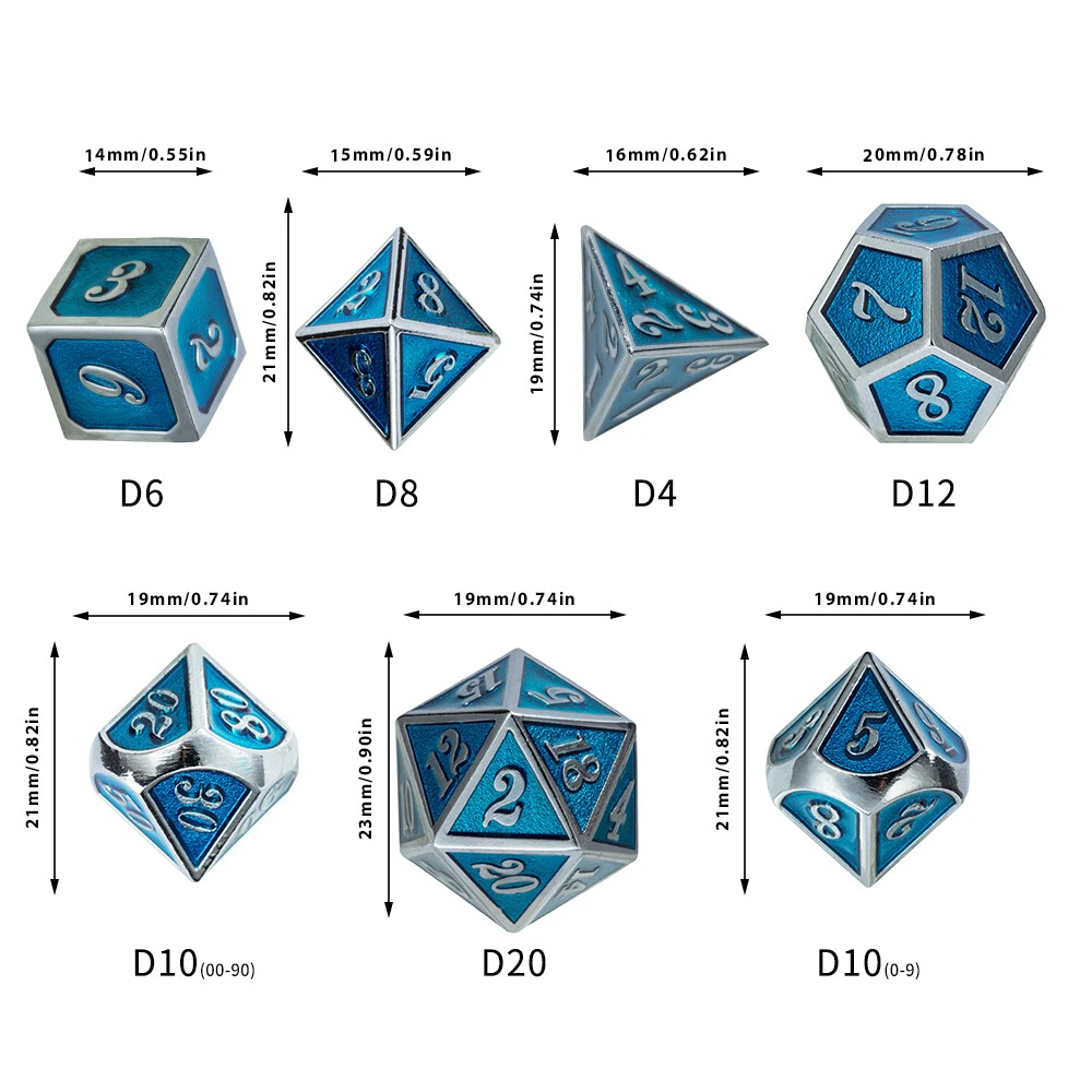 7Pcs Set Of Dice Polyhedron Dice Metal Dice Suitable For Tabletop Game RPG USA Product Description Features: * High Quality Ancient brass metal dice,Zinc alloy materials, extremely durable,with easy reading in good weight and mini size. * The design is perfect for D&D character,very unique and attractive . * Polyhedral Design: Set of 7packs including D4, D6, D8, D10*2, D12, D20. * It’s heavier than a normal dice and very nice feeling. * The dice are perfect for RPGs such as Dungeons and Dragons, Shadowrun, Pathfinder, Savage World, Warhammer, Yahtzee and many other PRG and Math Teaching. * Comes with a durable metal box for storage. Specifications: Quantity:7pcs Shape:Polyhedral Materials:Zinc alloy Color:Rainbow Blue Package Include: 7* Ancient Brass Metal Polyhedral Dices 1* Metal Box Payment 1.we only accept payment view paypal. It is fast, Easy and Safe. 2.Payment must be received within 7 business days of auction closing. Delivery details Delivery time lasts approx.: United States:USPS first class (2-6 Business Day) Due to oversize/overweight,if your order more than one pcs item in order,generally we will divide the products into several packages or we default to UPS delivery.“Hope for understanding” Terms of sales If you got the wrong or damaged item, please contact us. We will provide you a reshipment or refund. If the product does not have any quality problems, generally it will need the buyer to bear the freight. About us If you are satisfied with our service and item, please leave some positive feedback for us. It will give us more energy and passion to do the work better. If you are not happy, please contact us and tell us the reason, we'll find out the problem and give you a satisfied solution. Contact us If the items lost\damaged in the shipping . We promises 100% refund or resend. On Nov 21, 2024 at 22:09:02 PST, seller added the following information: